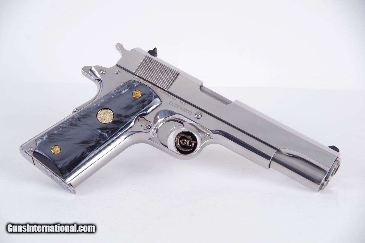 Description: Colt 38 Super El Centauro. This is a Lew Horton special edition with a very low serial number of 3 out of only 350 made in 1997. These feature a full bright stainless slide and frame with faux black MOP grips and gold grip screws. We have several other #3s that have been together since new. This pistol is new in the original box numbered to the gun with everything shown. The finish is exceptional throughout and overall it rates 99%+. The factory grips are flawless. SOLD Manufacturer: Colt Model: government Caliber Info: 38 Super |