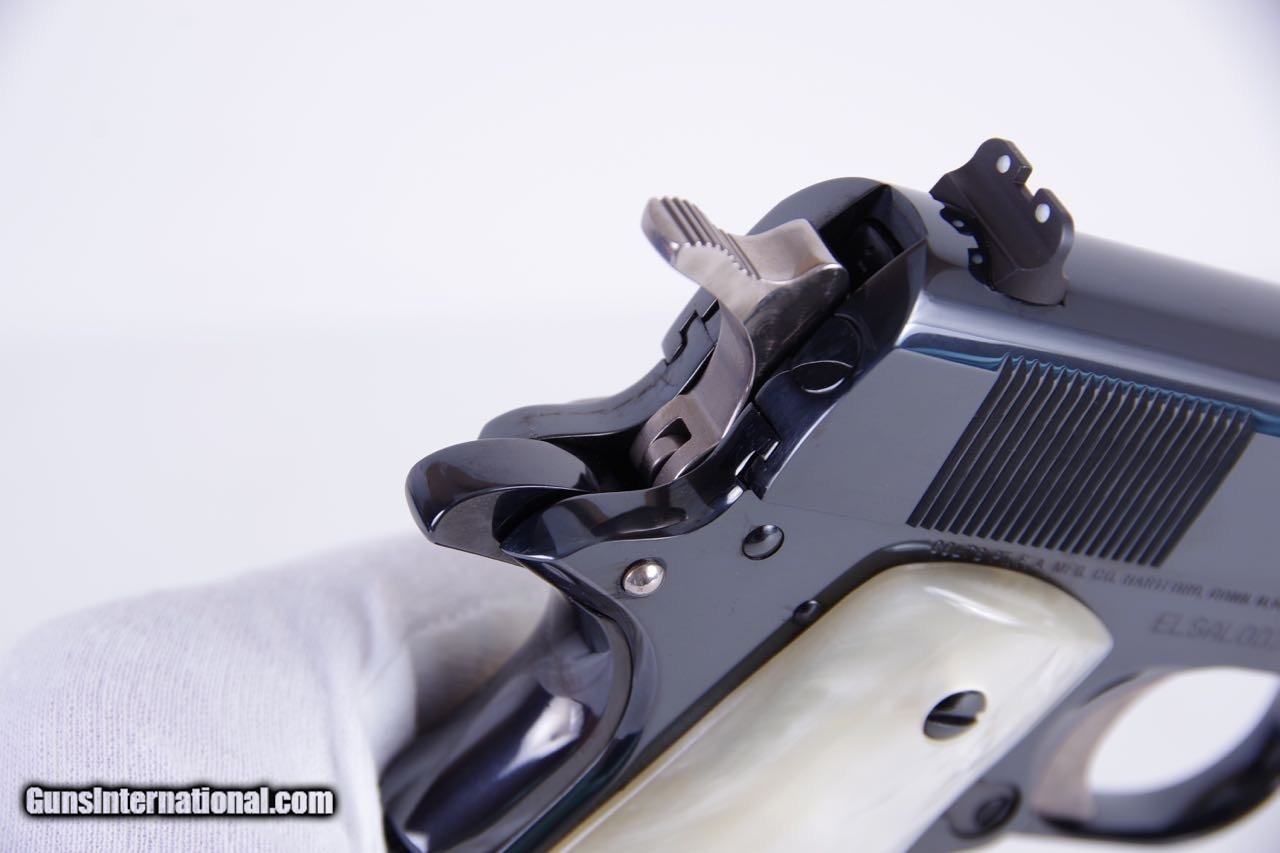 Description: Colt El Saldado 38 Super. This is a Lew Horton special edition that was manufactured in 2000. This one has a very low serial number of 3 out of only 350 made. I have several #3s that have been together since new. These feature a full Royal Blue slide and frame. The hammer, trigger, slide stop, and thumb safety are jeweled. The grips are faux MOP. This pistol is new in the original box numbered to the gun with everything shown. The finish is exceptional throughout. We only lighty wiped it dow so you will see a few light traces of oil. Overall it is near perfect and overall the finish rates 99%+. The grips are flawless. SOLD Manufacturer: Colt Model: Government Barrel Length: 5 Caliber Info: 38 Super Condition: NIB Metal Condition: 99%+ |