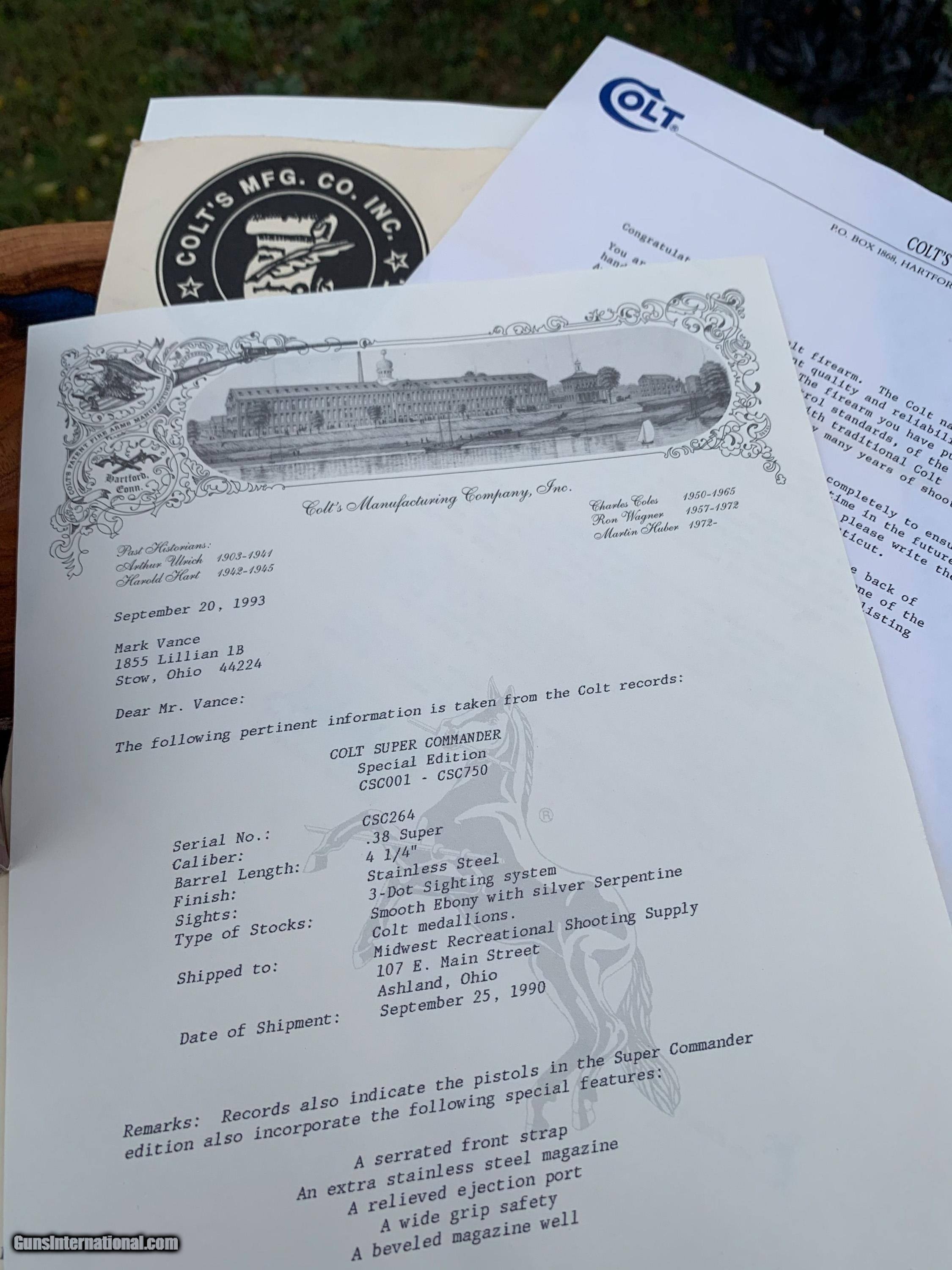 Description: Colt 38 Super Commander 1990 Edition 1 of 750 Super Commander with box and Factory letter in great condition. Free Shipping and Layaway available. SOLD |