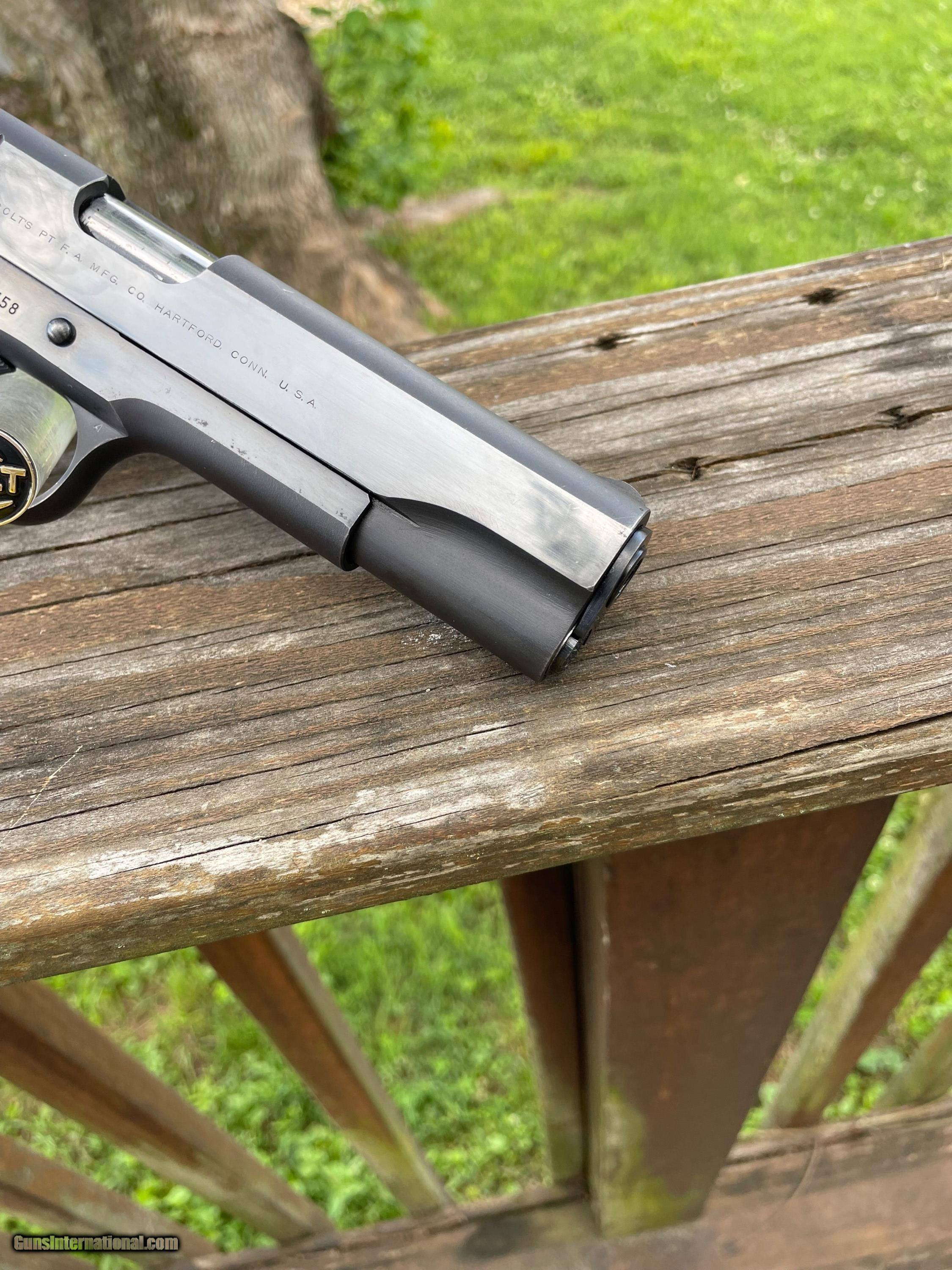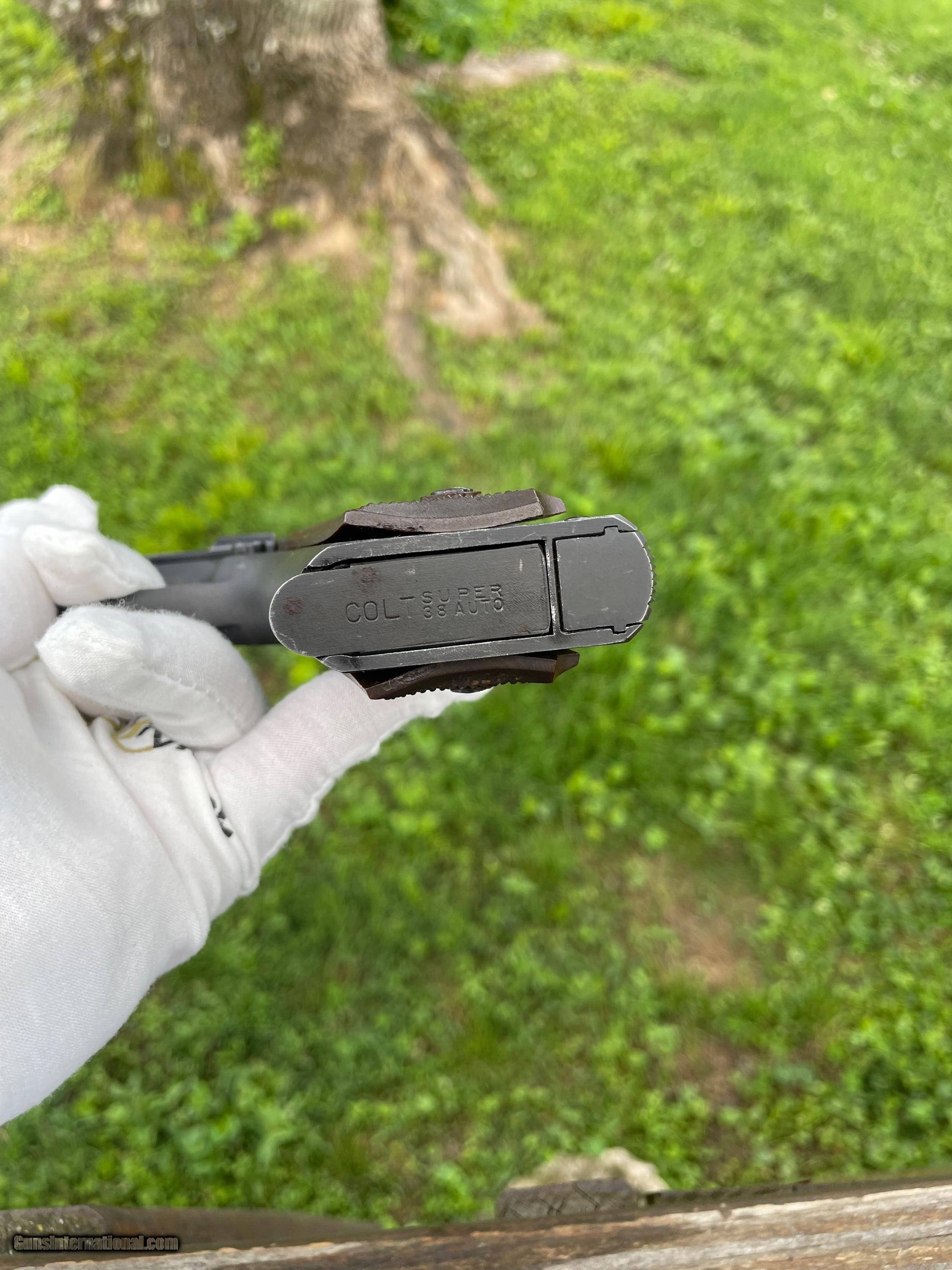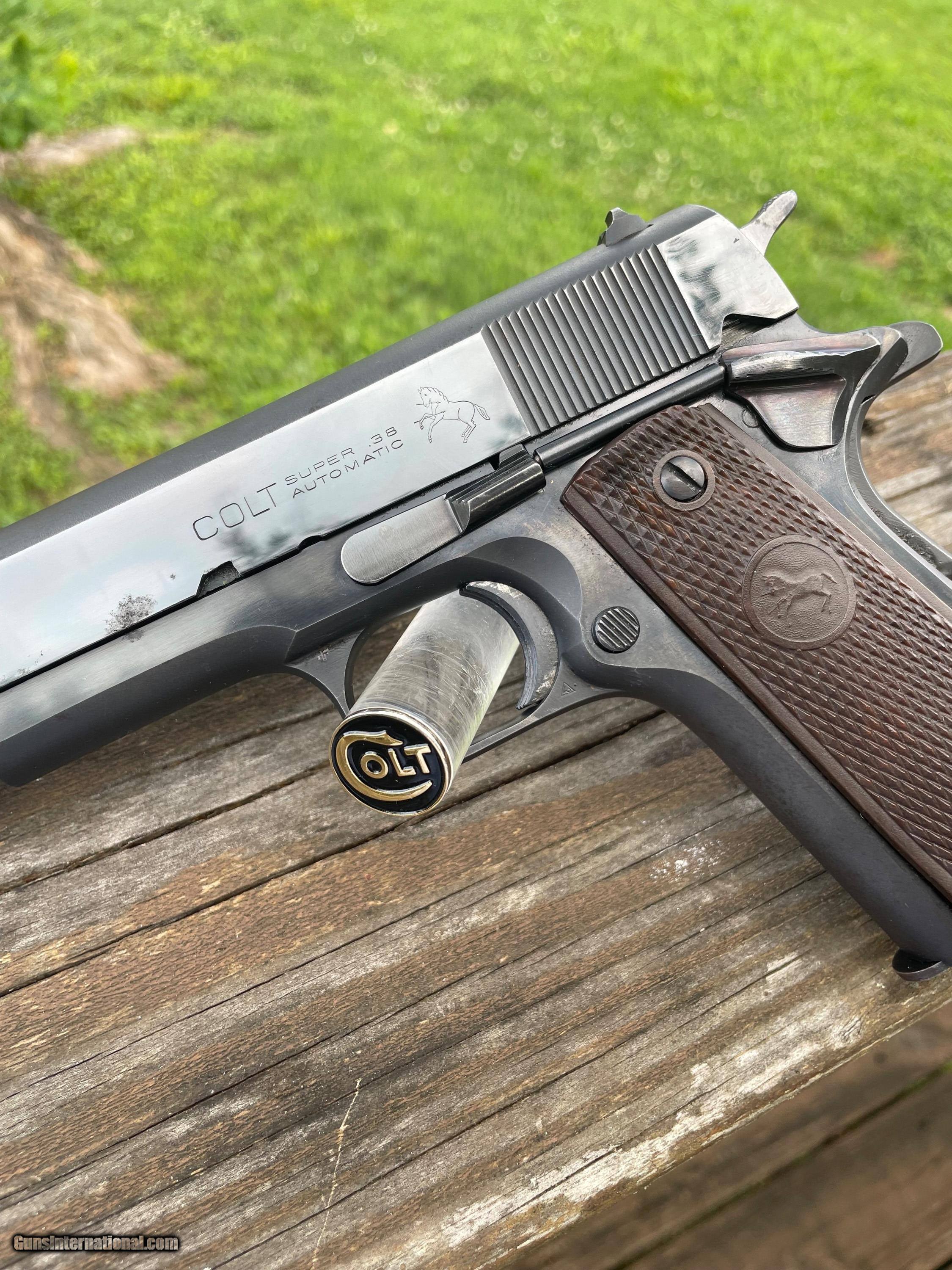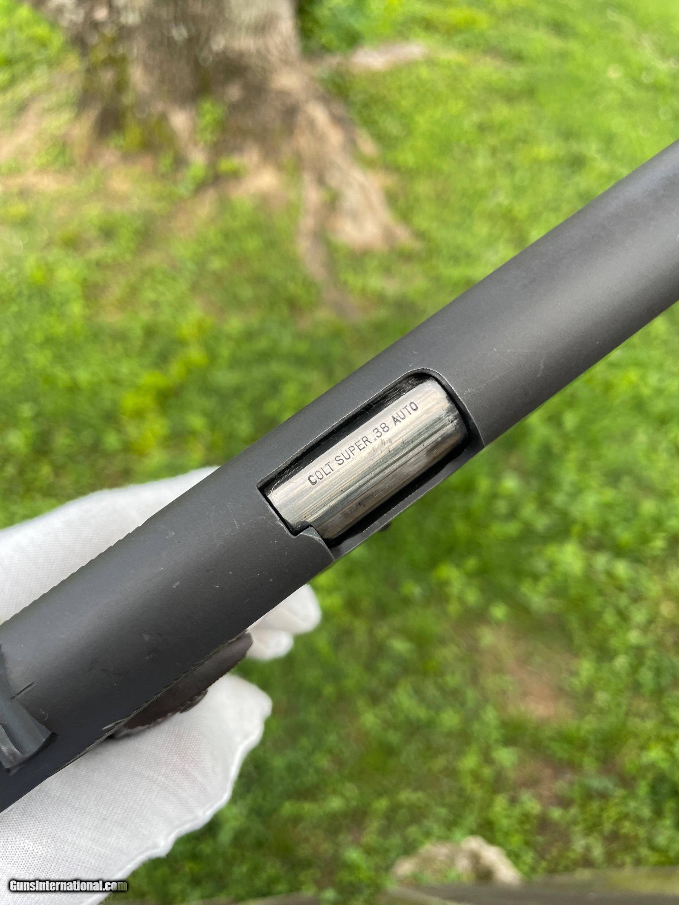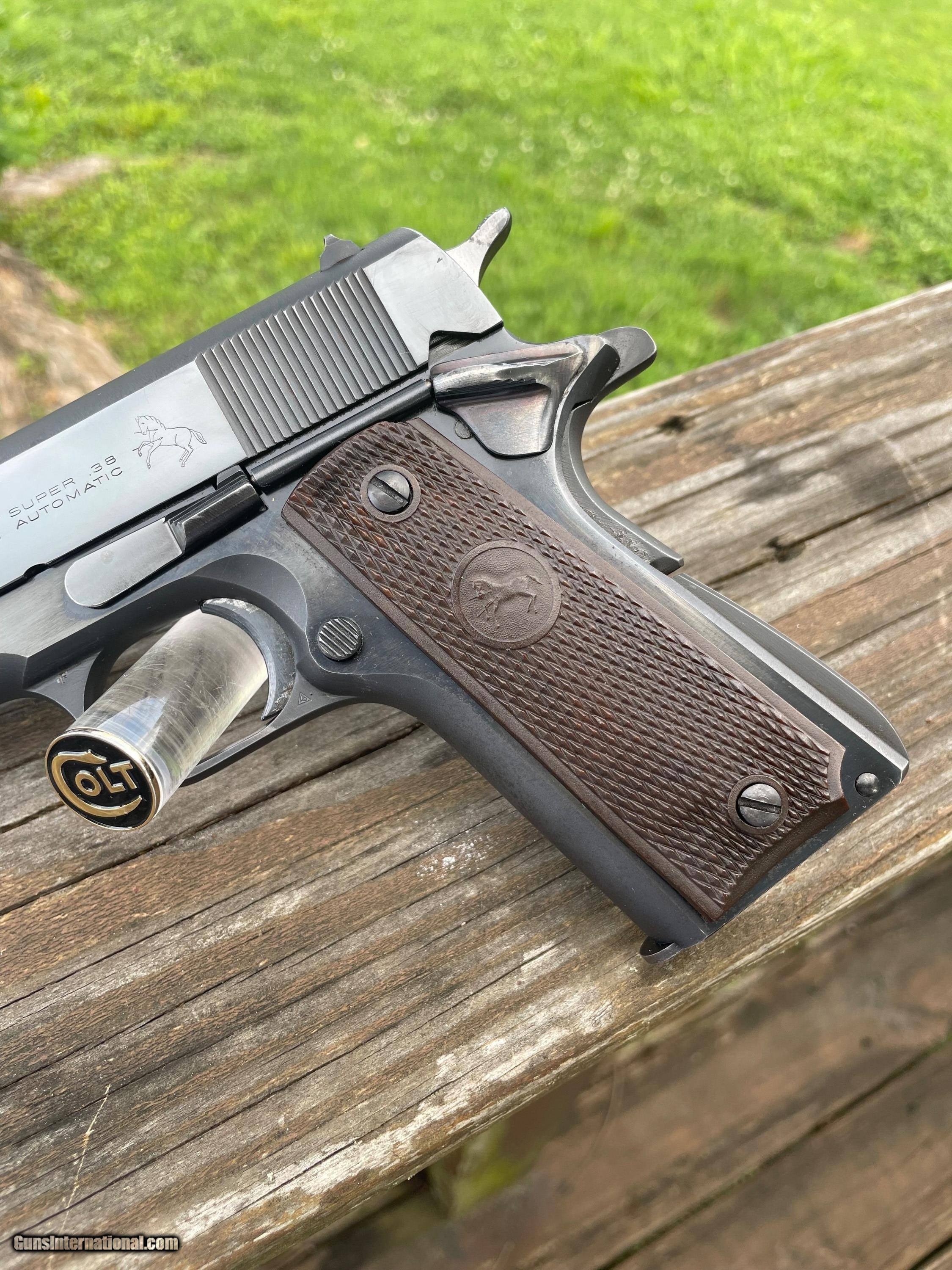 Description: We have a Colt .38 Super dating back to 1957 making a Third model with a thin and correct barrel,checkered hamme. As you can see it's all original showing some wear also notice the grips have shrunk or someone has tried to heat them in the past to stretch, it also shows some very light pitting on one left side. Cali Compliant. Free Shipping w/buy now. SOLD Curio/Relic: Yes |