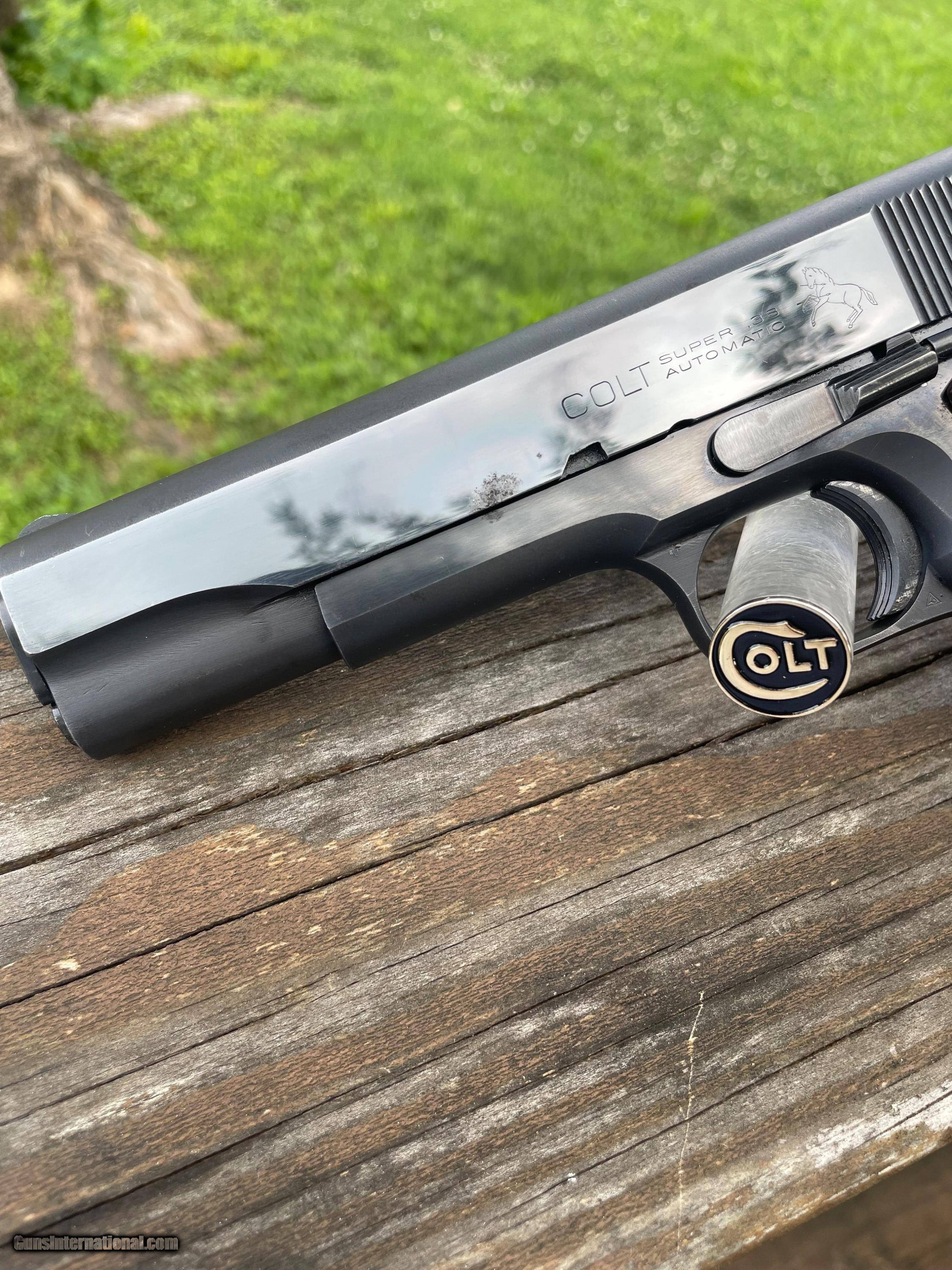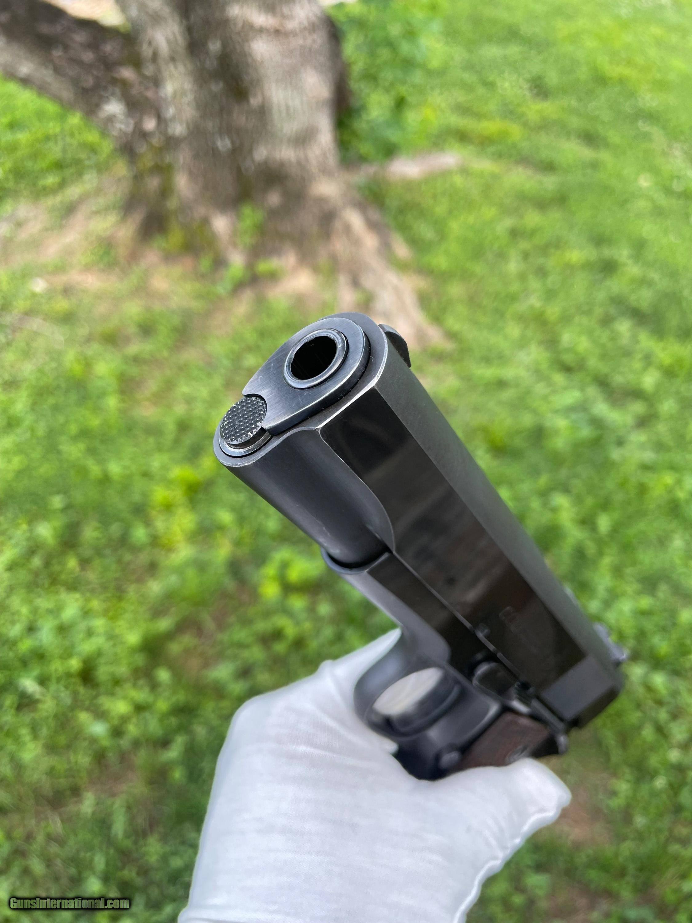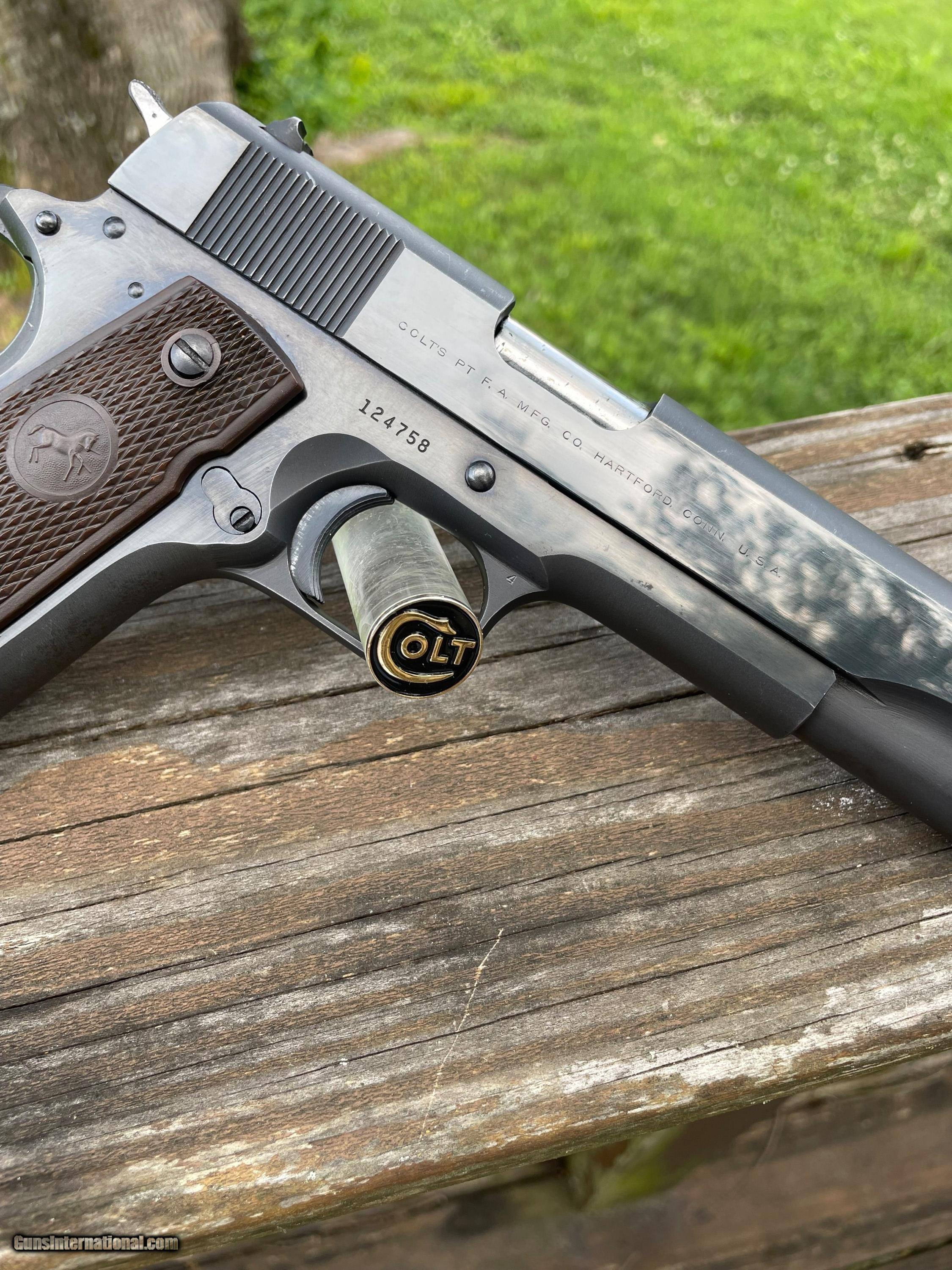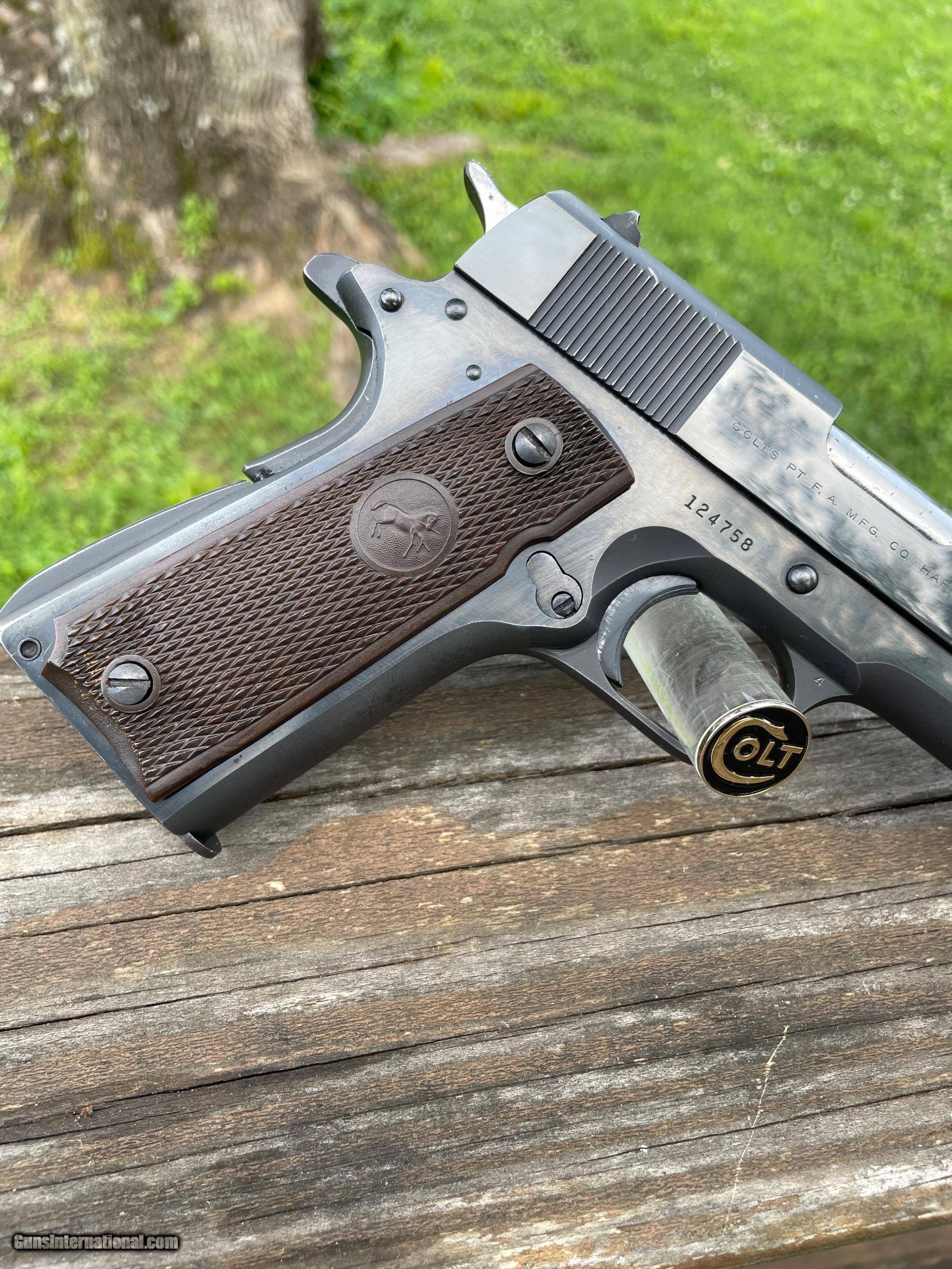 Description: We have a Colt .38 Super dating back to 1957 making a Third model with a thin and correct barrel,checkered hamme. As you can see it's all original showing some wear also notice the grips have shrunk or someone has tried to heat them in the past to stretch, it also shows some very light pitting on one left side. Cali Compliant. Free Shipping w/buy now. SOLD Curio/Relic: Yes |