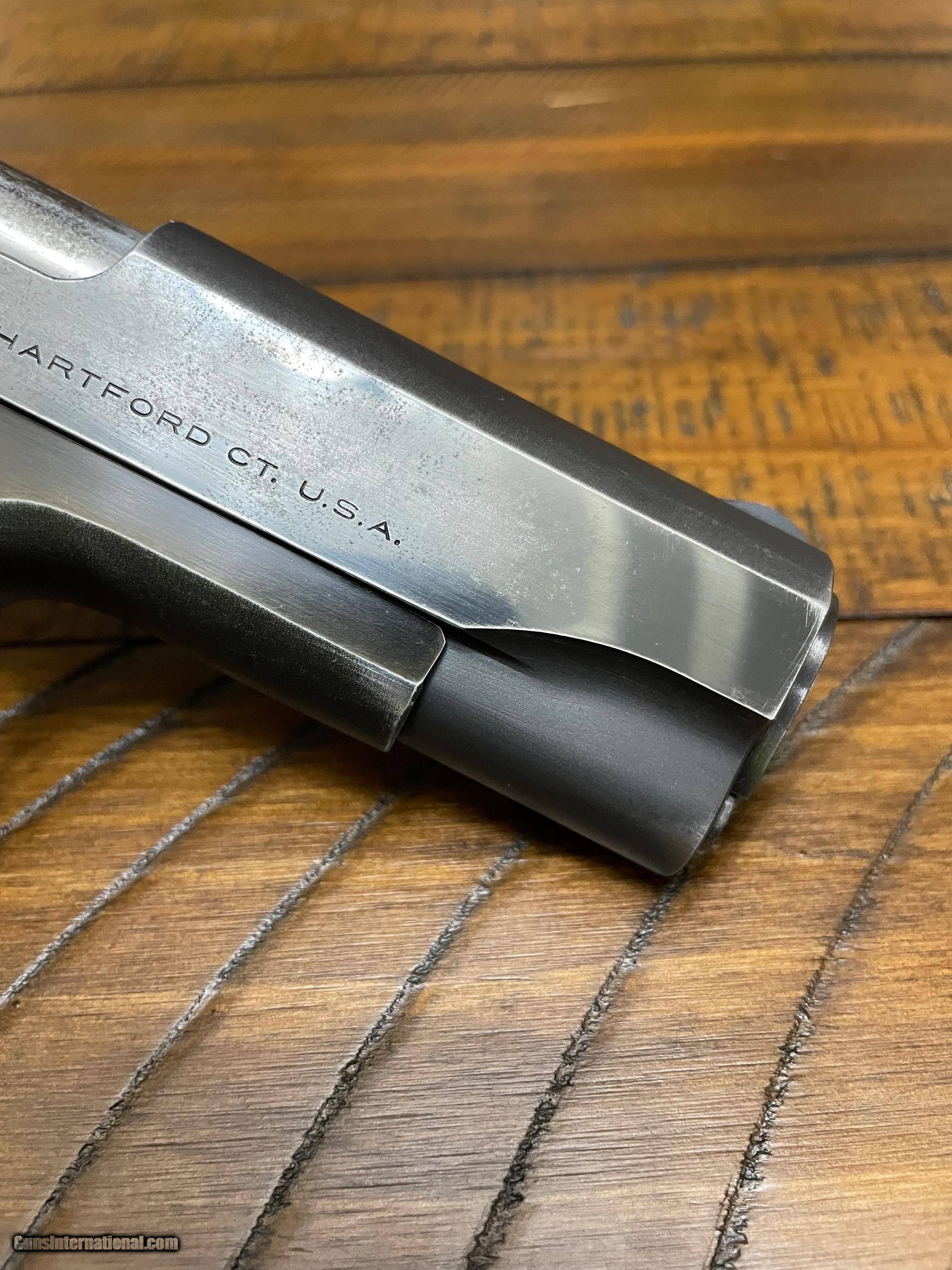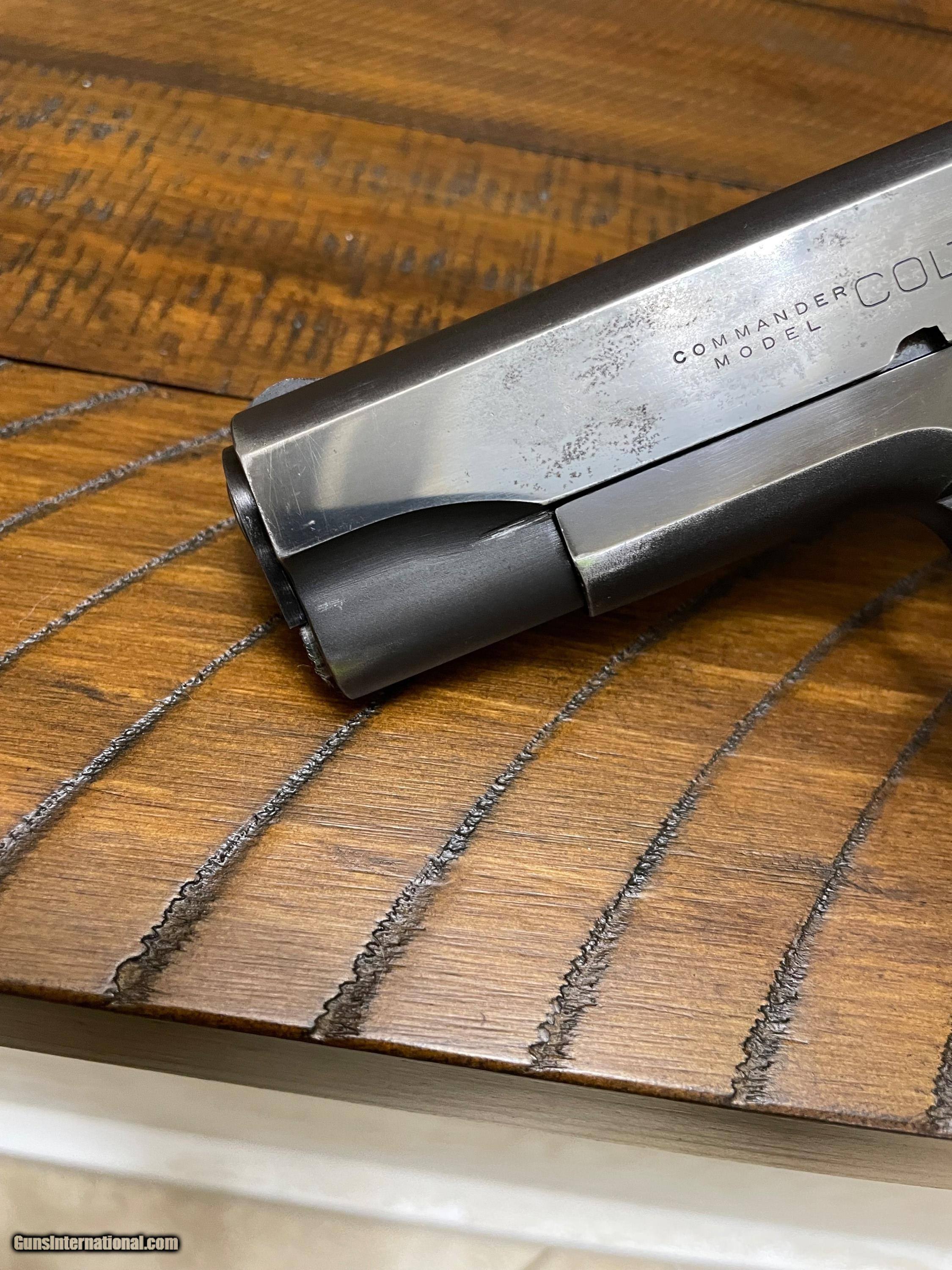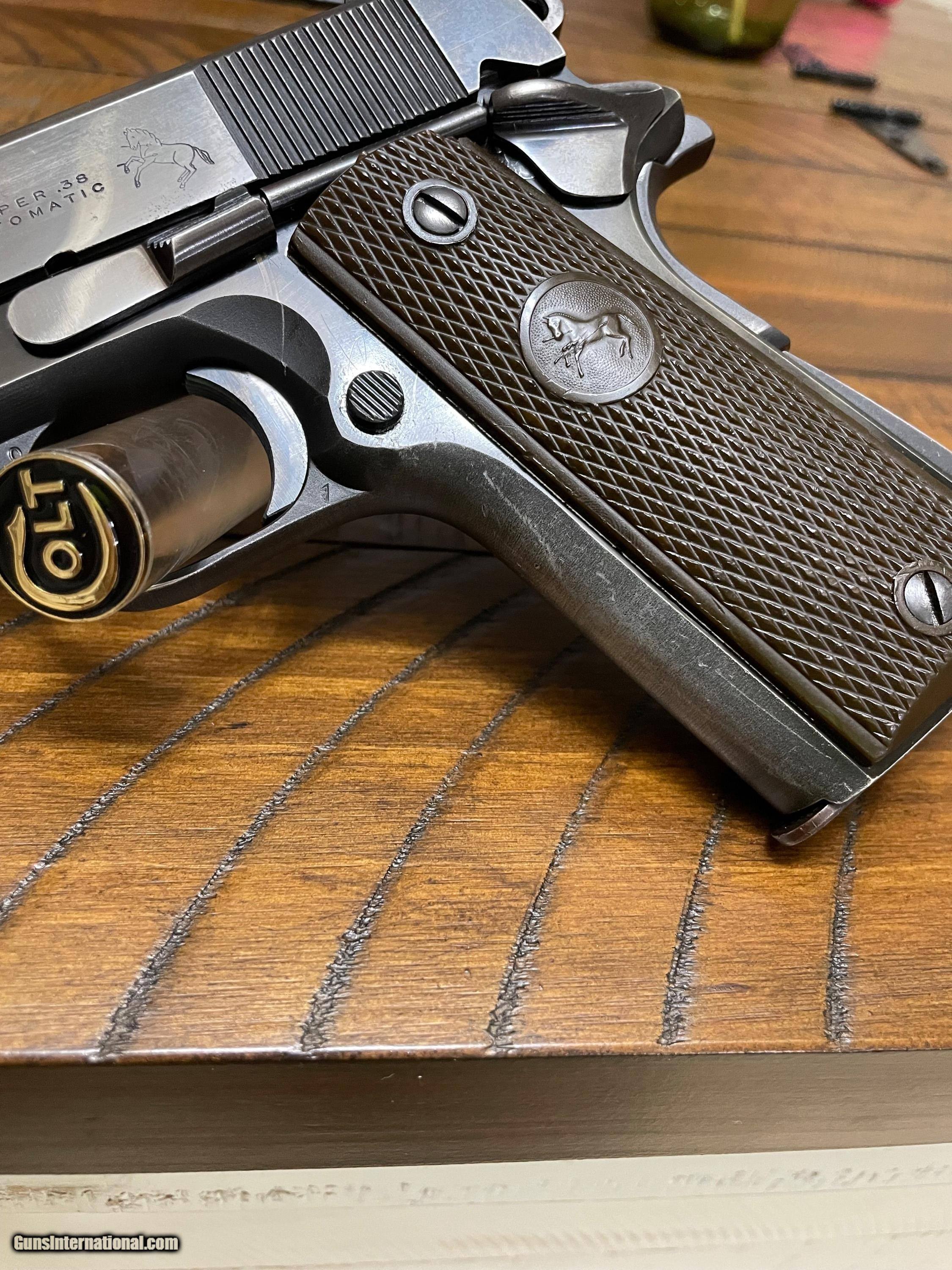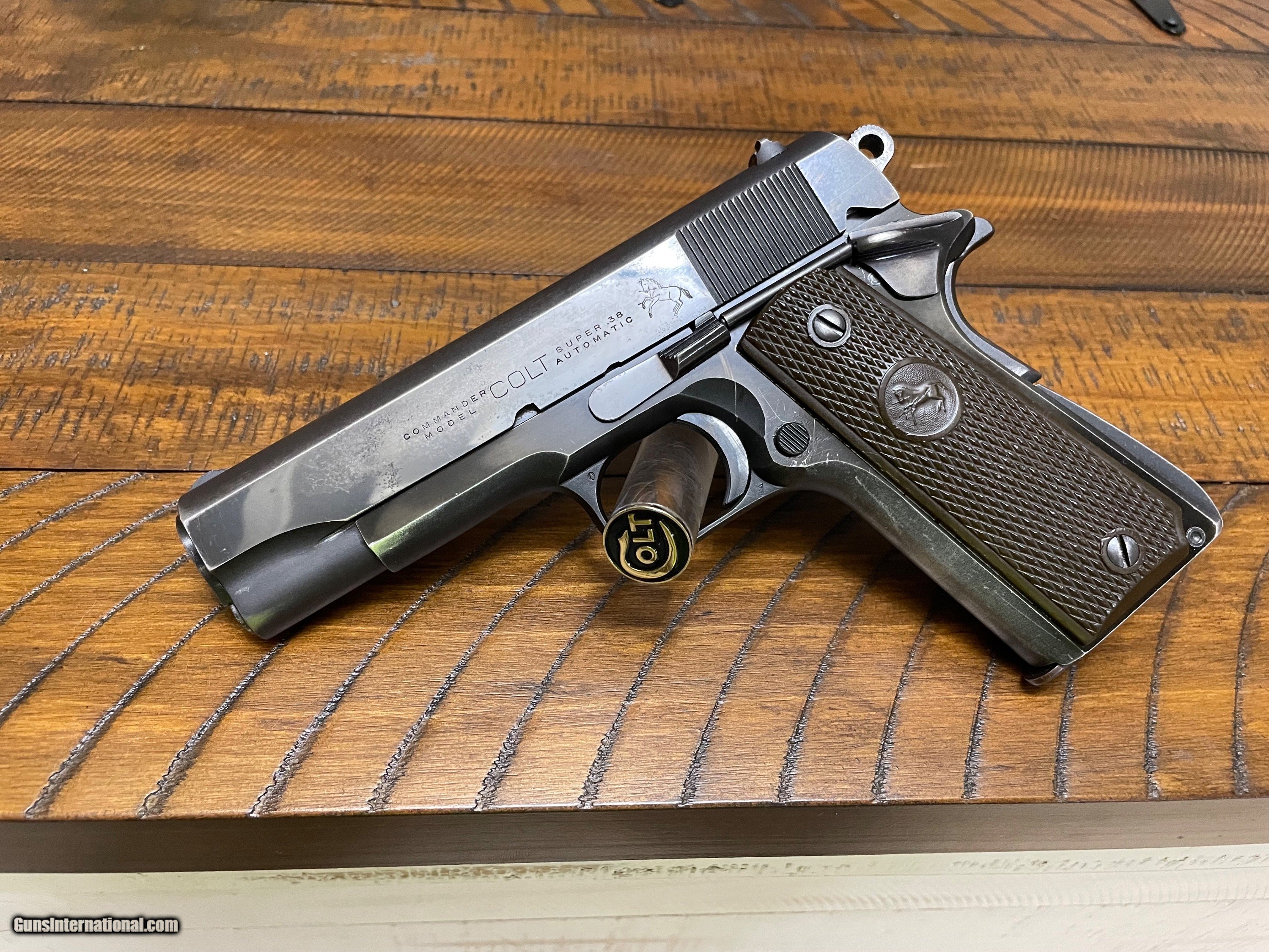 Description: 1951 Colt .38 Super Commander, pistol is showing its age with some light freackling all correct and original. Correct colt grips I would rate this pistol at about 70/75% great carry or project Pistol. Free shipping California Compliant. SOLD Curio/Relic: Yes |