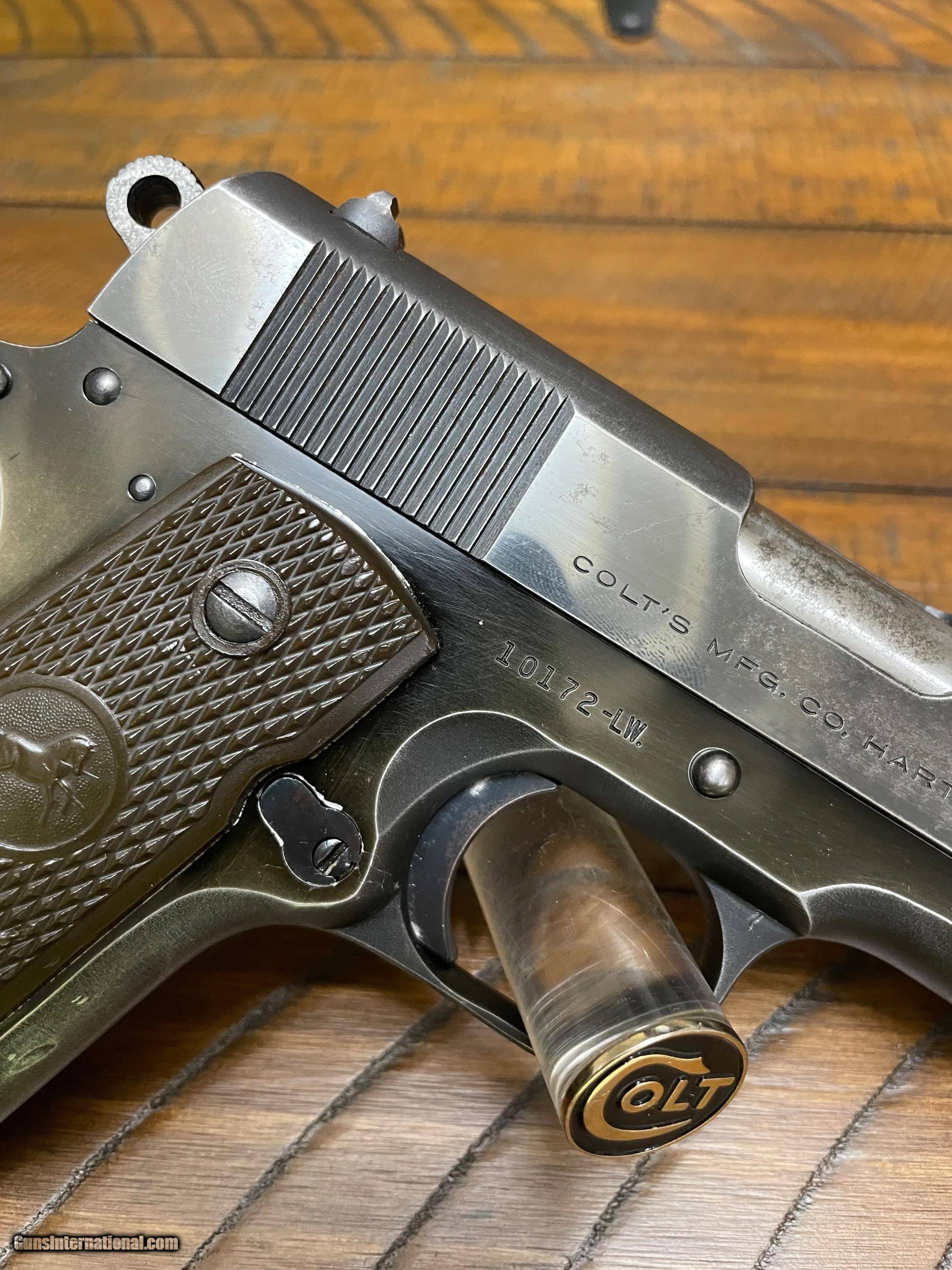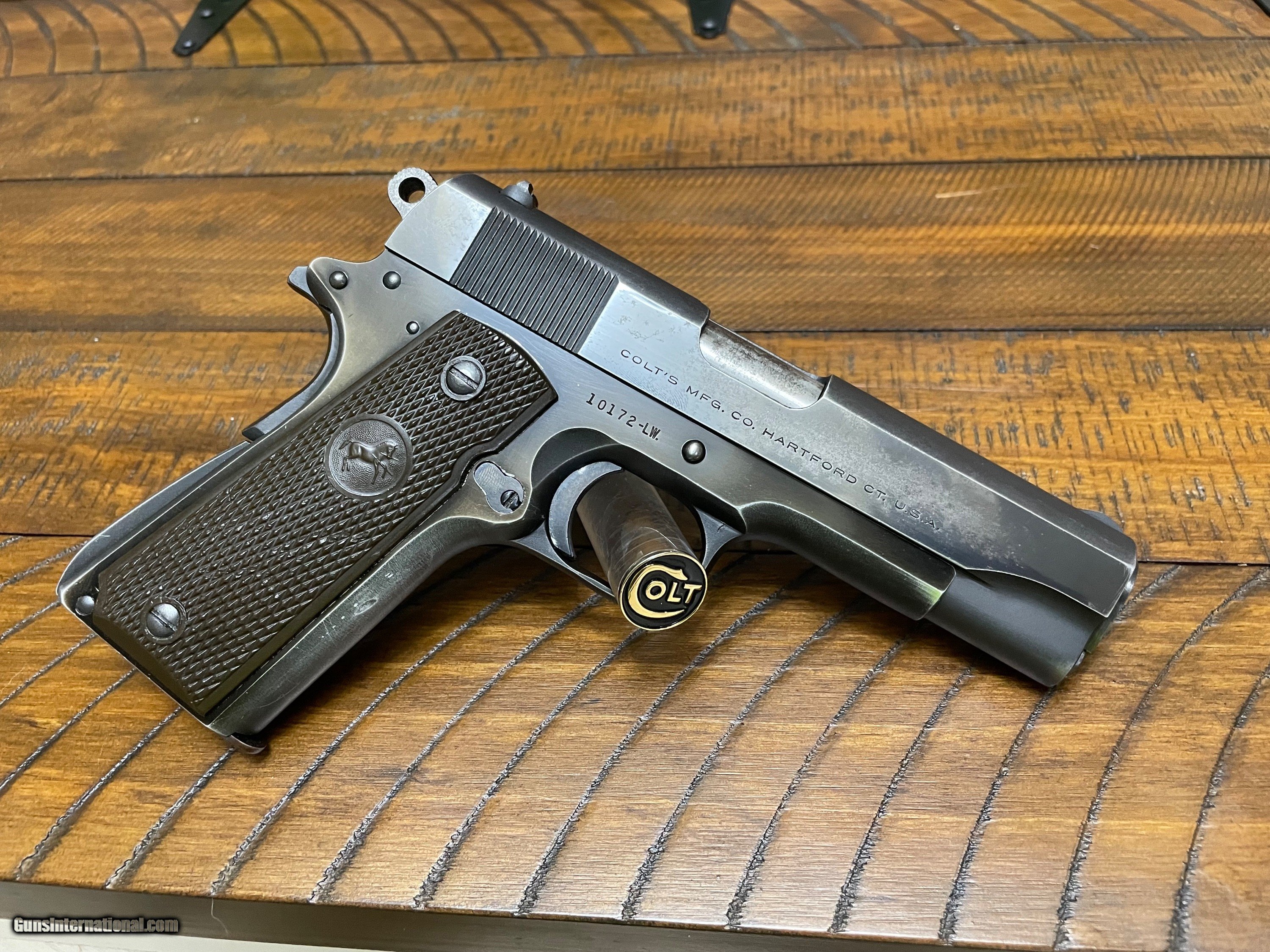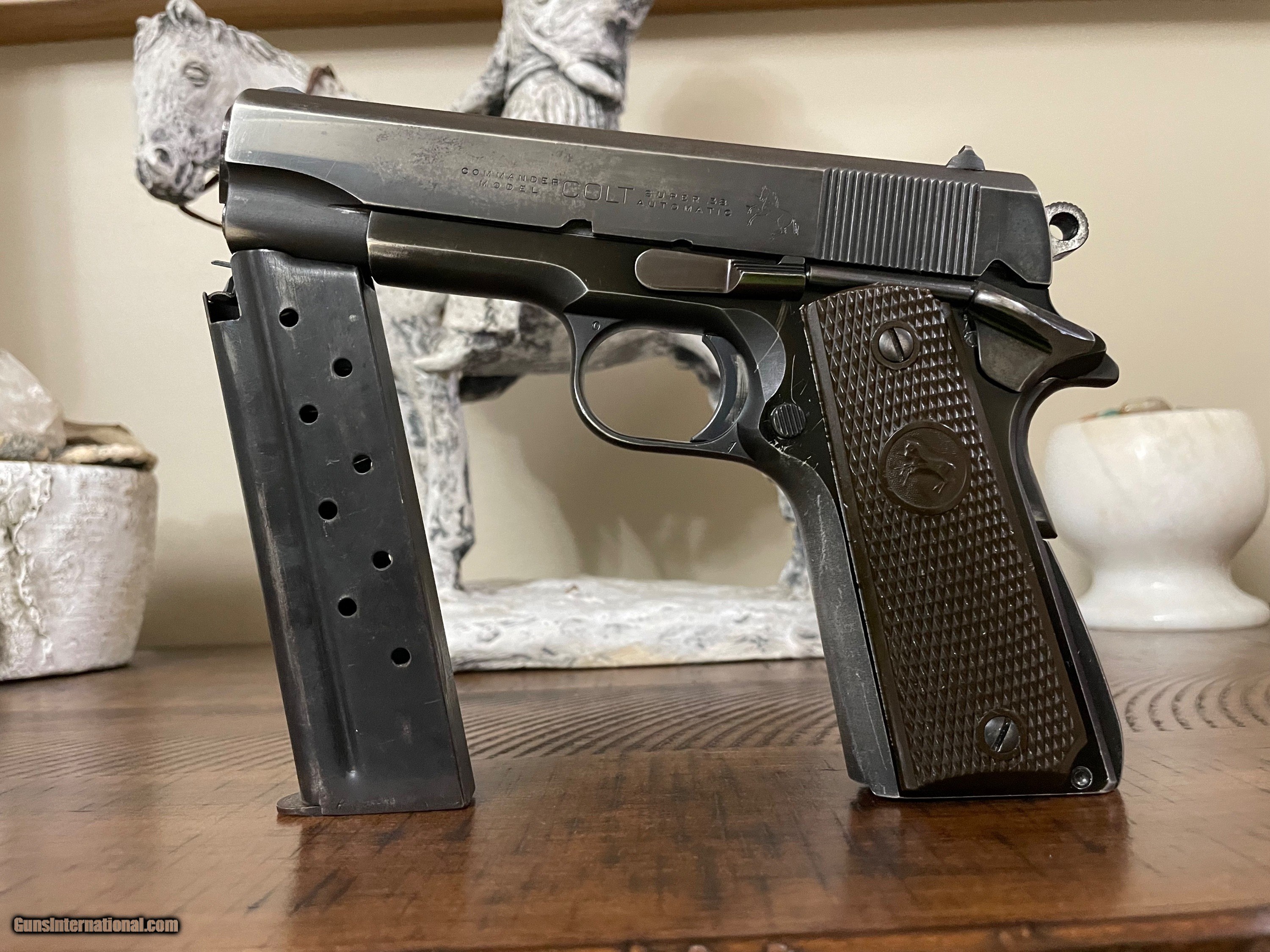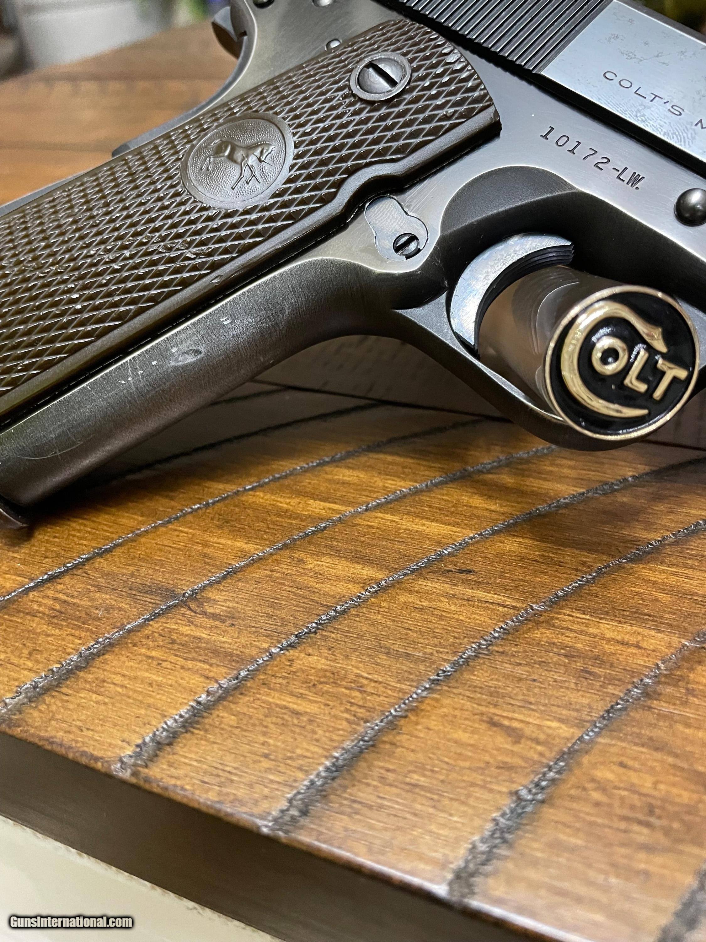Description: 1951 Colt .38 Super Commander, pistol is showing its age with some light freackling all correct and original. Correct colt grips I would rate this pistol at about 70/75% great carry or project Pistol. Free shipping California Compliant. SOLD Curio/Relic: Yes |