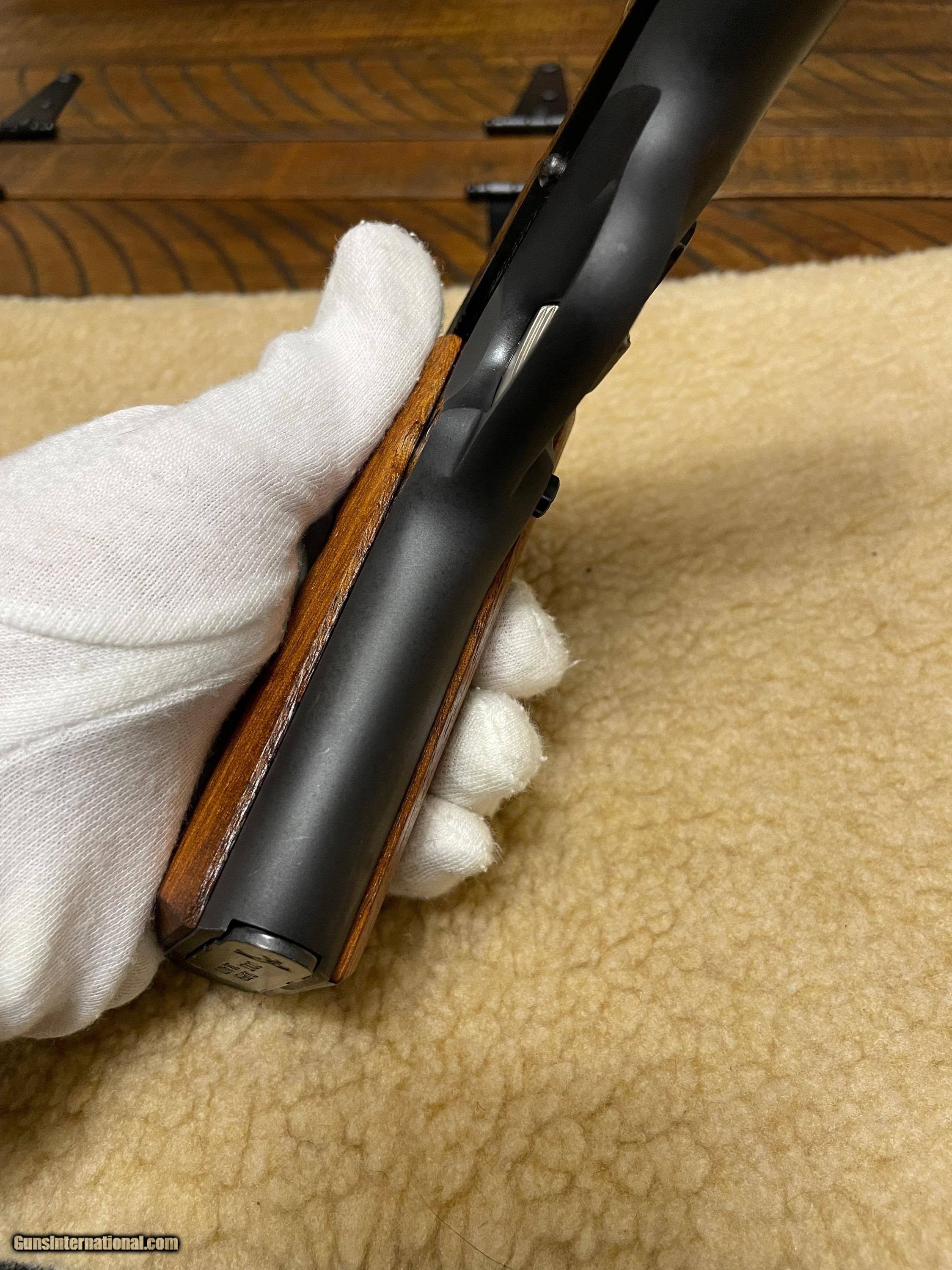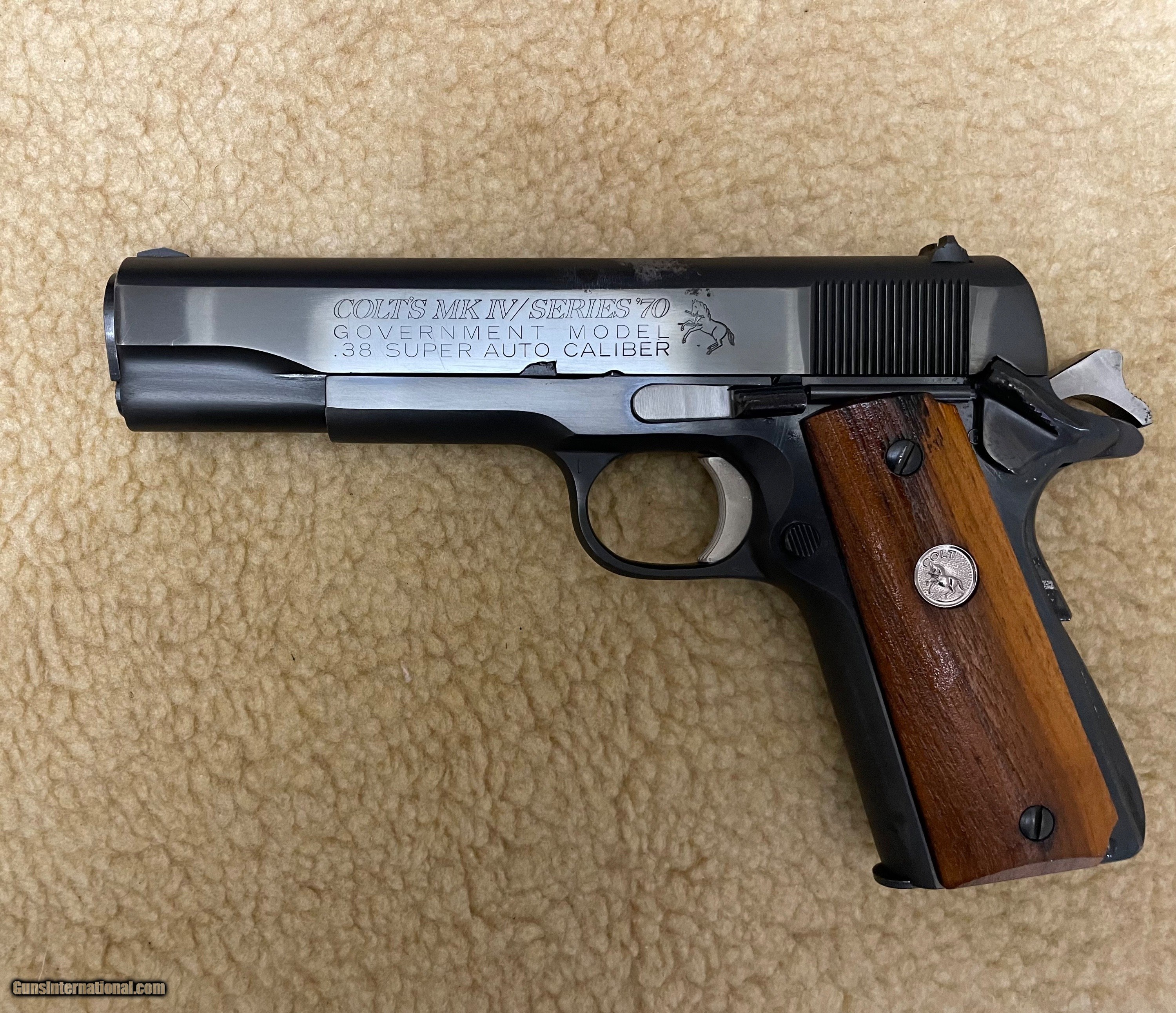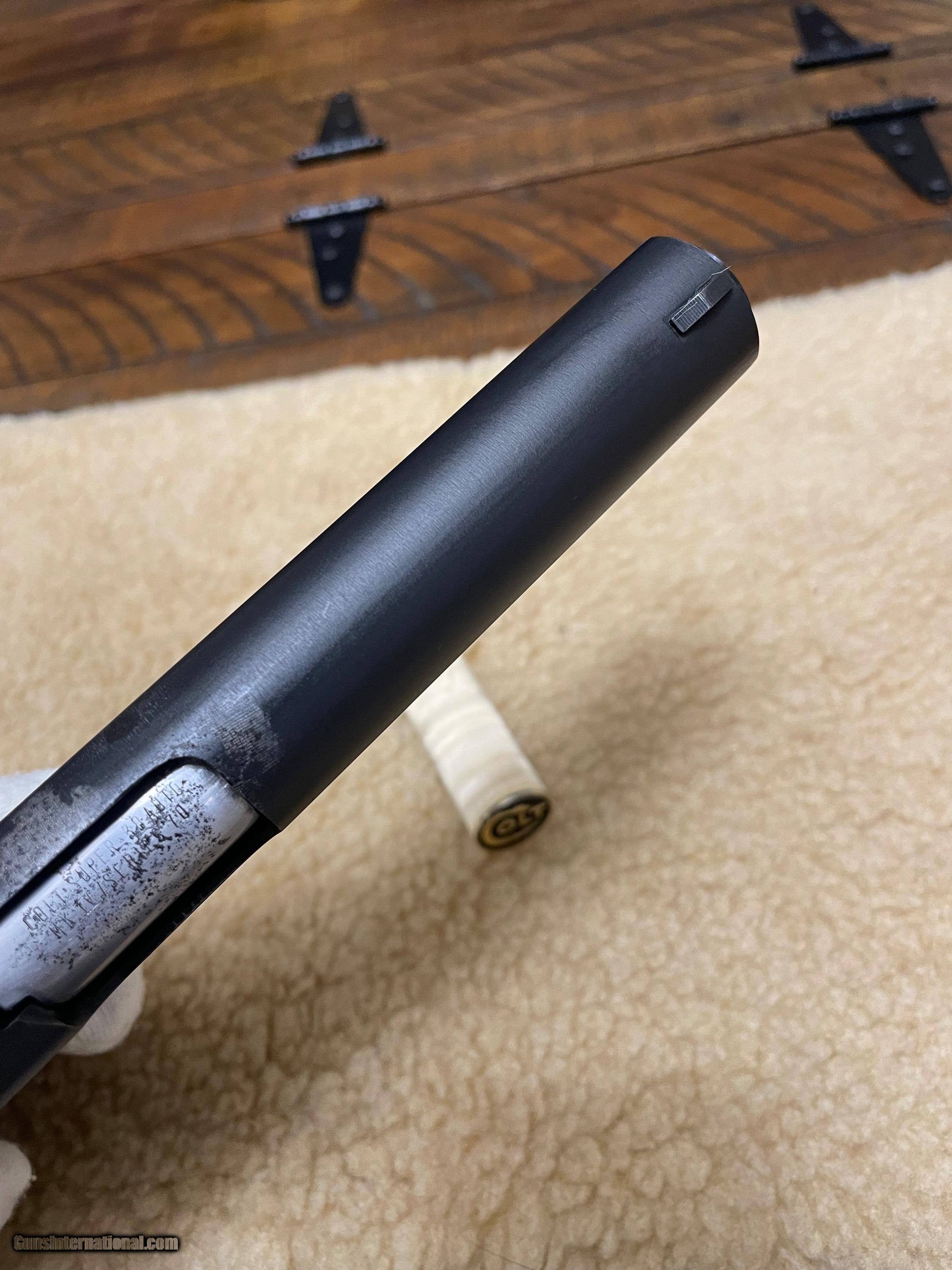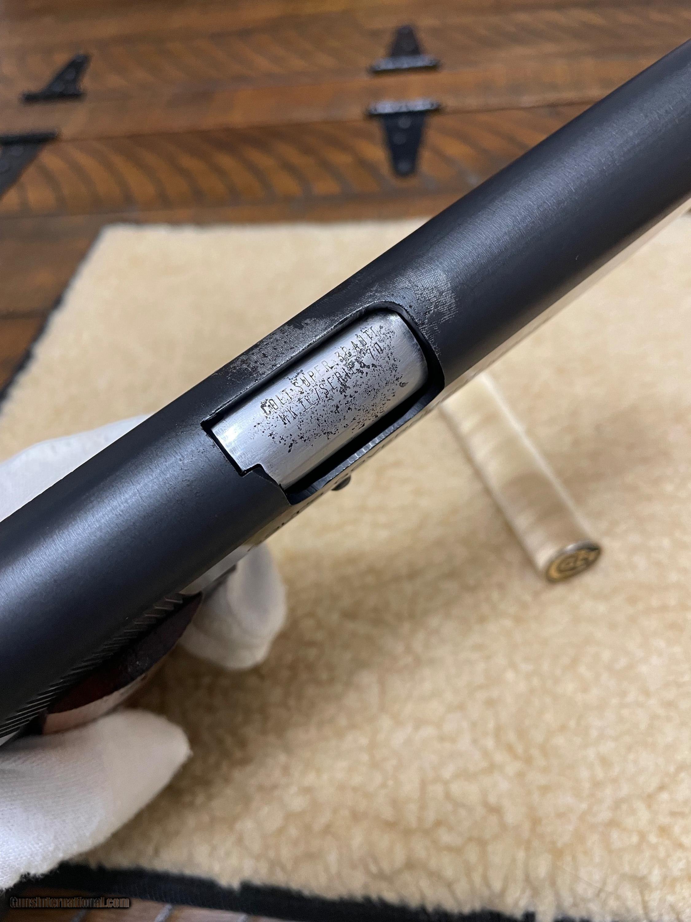 Description: 1975 Colt .38 Super 70 Series all original, pistol is showing some light pitting at the top of the slide,top of the barrel and the slide stop other than that rest of the gun is in really nice condition. There is no pitting inside of the gun or the internals. Buy Now Price includes free shipping. SOLD |