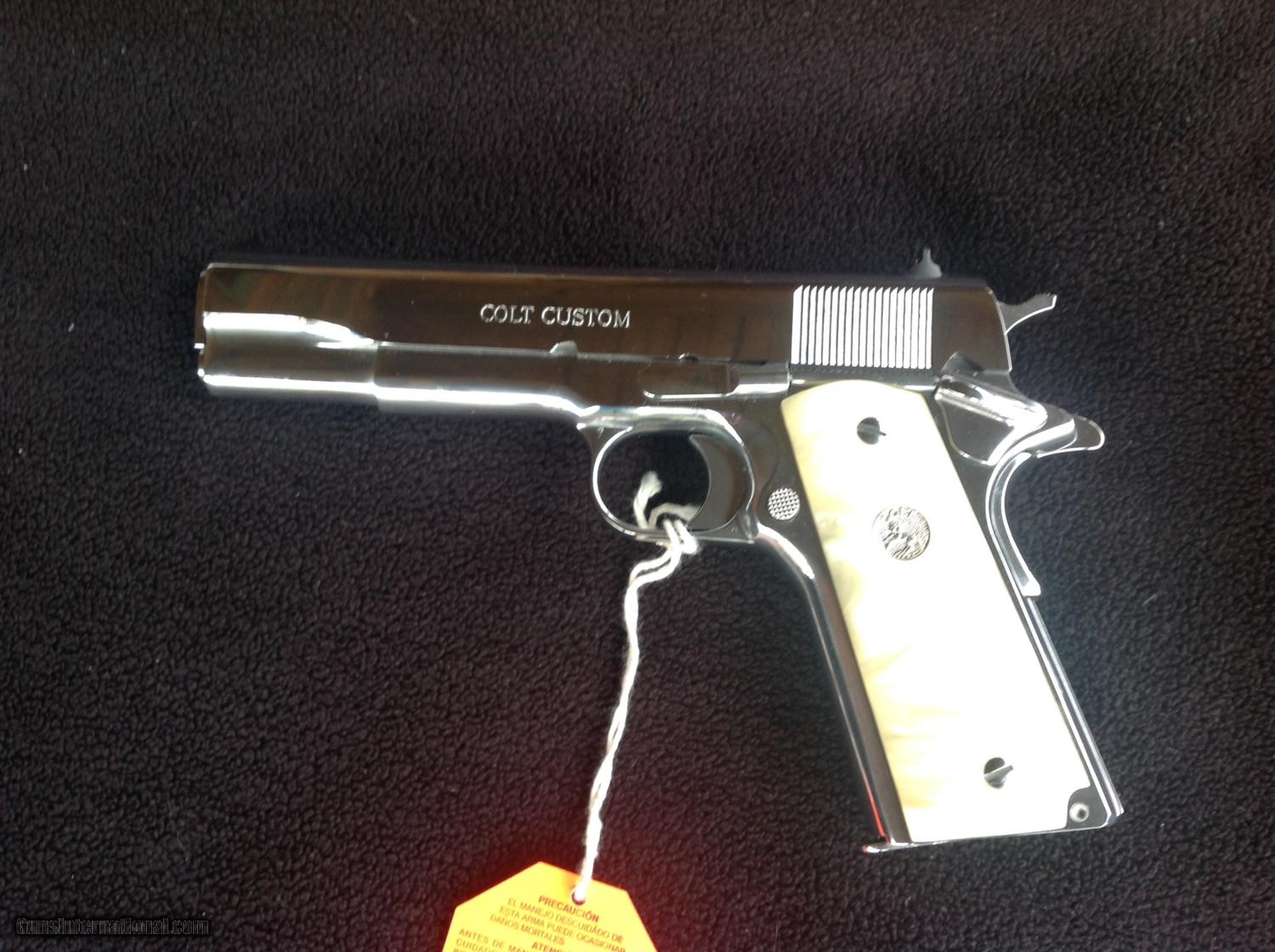 COLT CUSTOM SHOP 38 SUPER, BRIGHT STAINLESS WITH WHITE PEARLITE GRIPS, IN BLUE CUSTOM SHOP BOX WITH WHITE CUSTOM SHOP SLEEVE, NEW, UNFIRED 100% COND.
