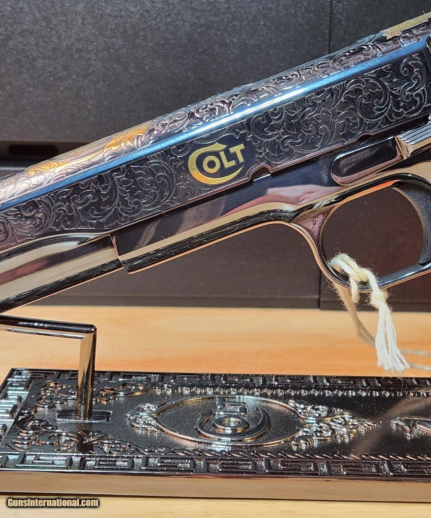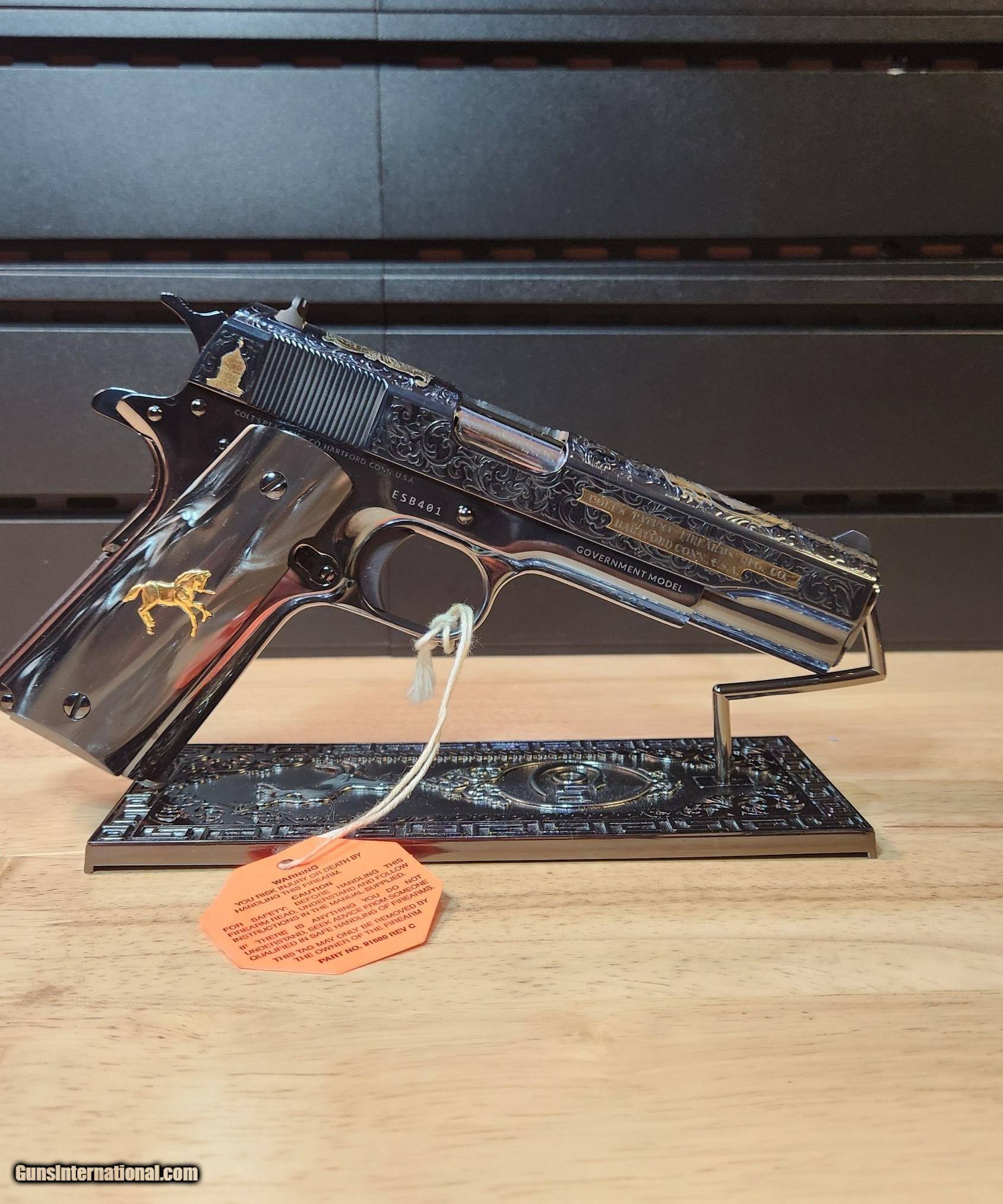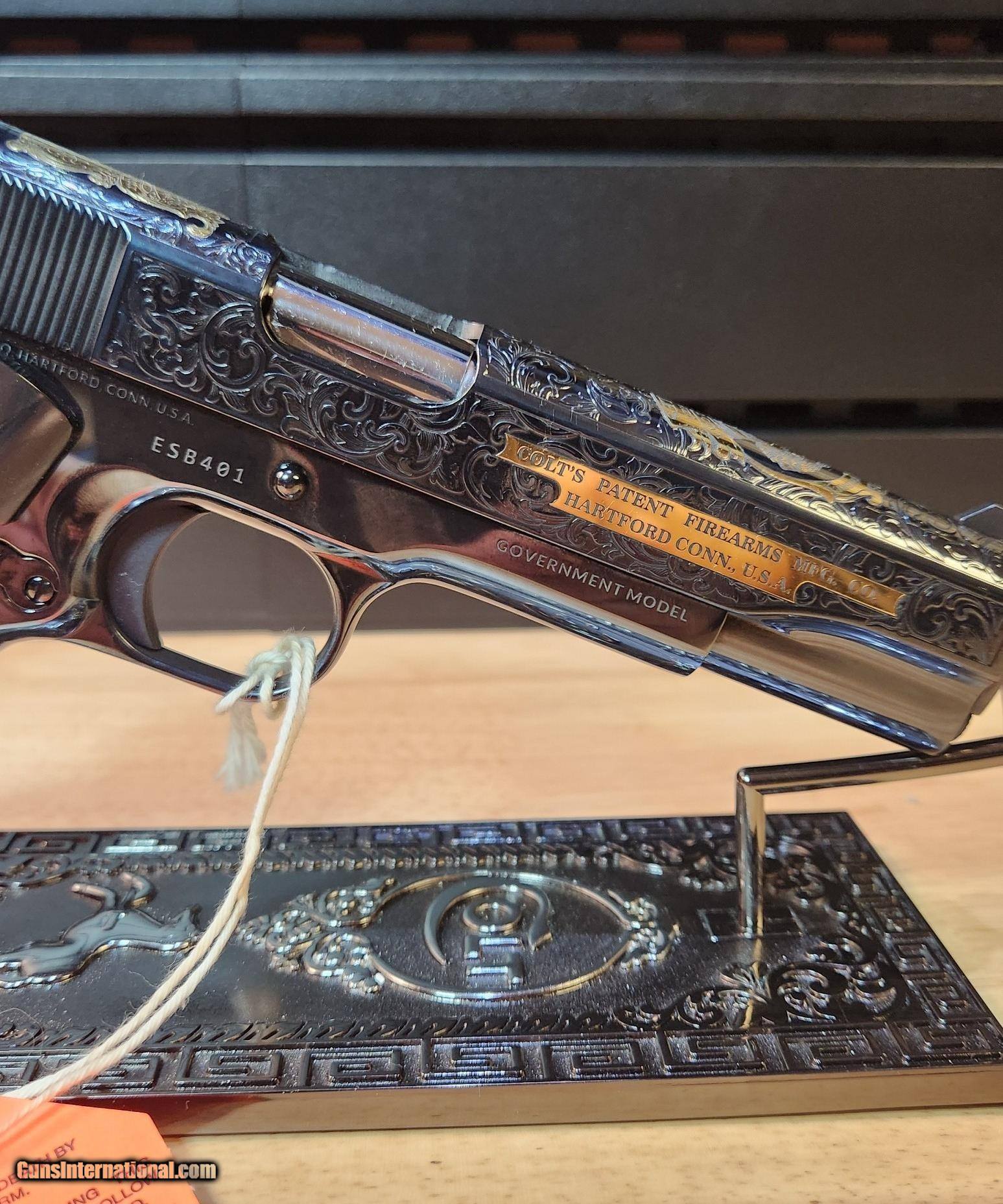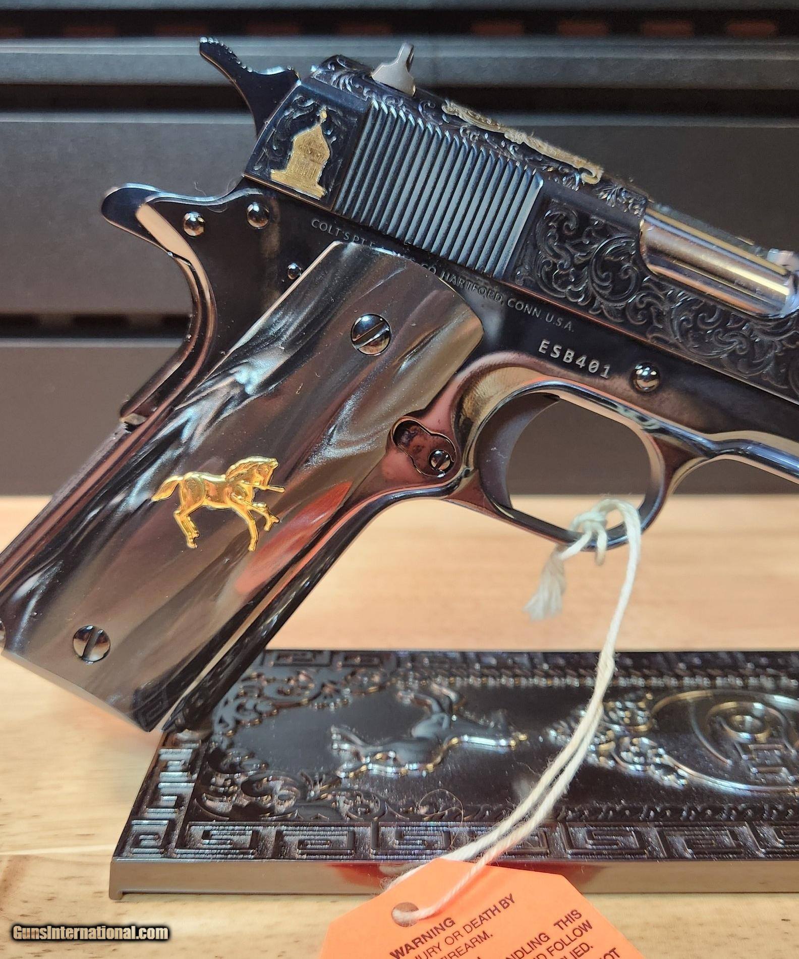 Description: Colt 1911 El Samuel 38 Super Pistol The Colt 1911 El Samuel Limited Edition is the ultimate collector’s item. Lustrous blued finish paired with an elaborate scroll engraved design, provides a striking base for gold inlays of Colonel Samuel Colt in Spanish, the Colt emblem, dome, patent and Rampant Colt on both the slide and Pearlite grips. Only 500 were created and each firearm is distinguished by a special serial number beginning with “ESB.” This Masterpiece can be described with one word. Exquisite Colt 1911 El Samuel 38 Super Pistol