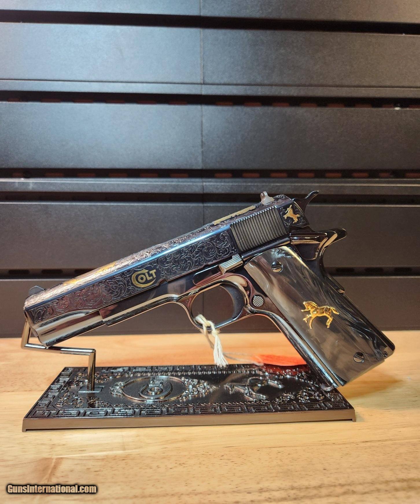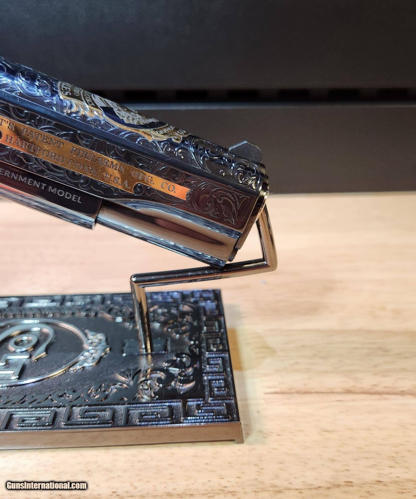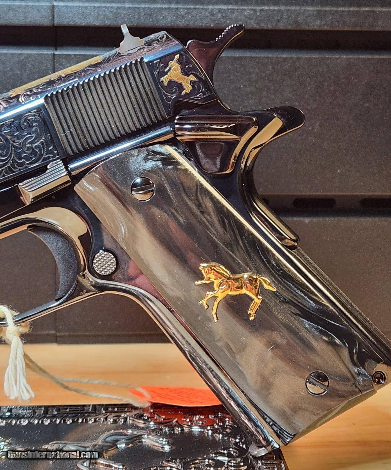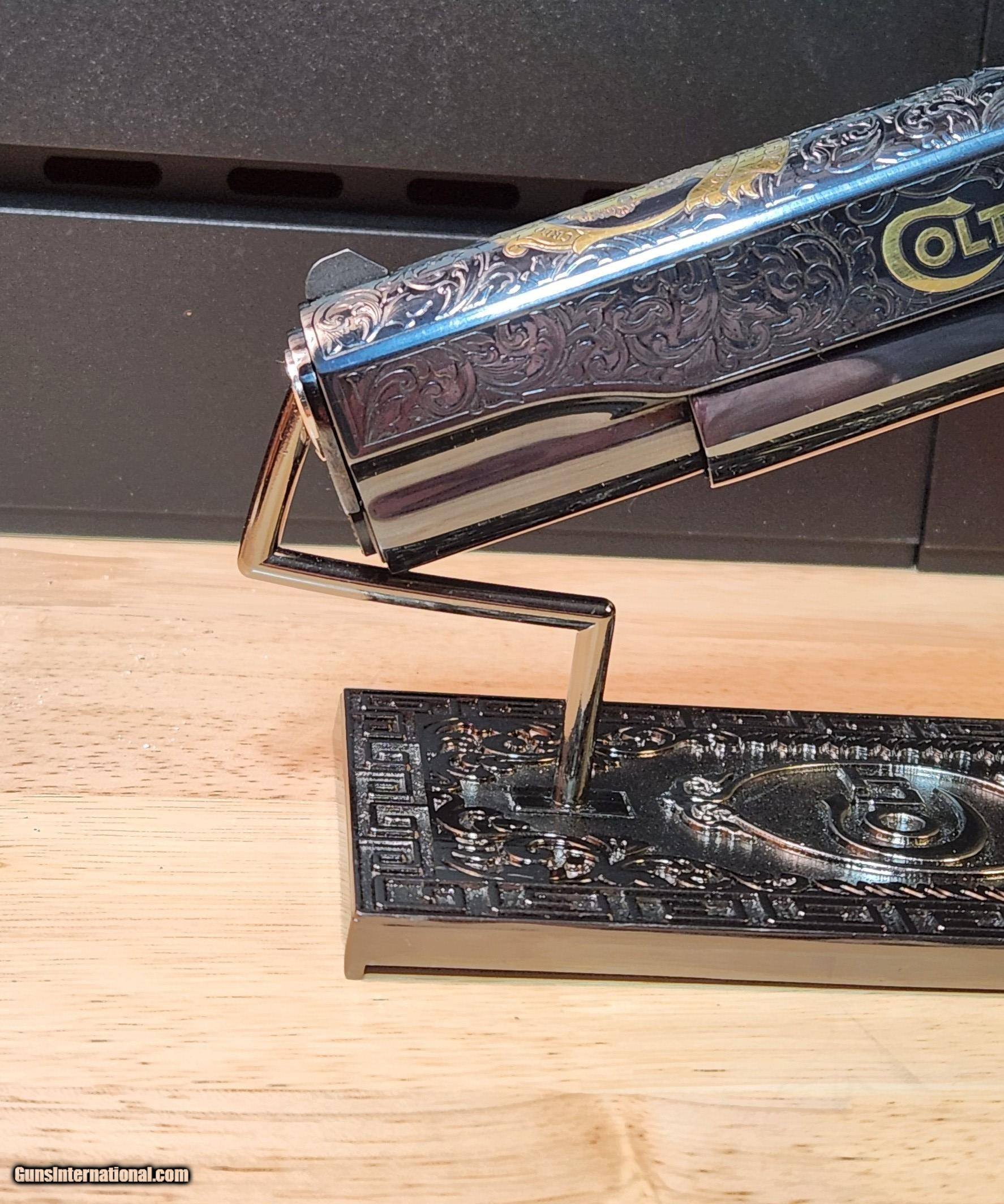 Description: Colt 1911 El Samuel 38 Super Pistol The Colt 1911 El Samuel Limited Edition is the ultimate collector’s item. Lustrous blued finish paired with an elaborate scroll engraved design, provides a striking base for gold inlays of Colonel Samuel Colt in Spanish, the Colt emblem, dome, patent and Rampant Colt on both the slide and Pearlite grips. Only 500 were created and each firearm is distinguished by a special serial number beginning with “ESB.” This Masterpiece can be described with one word. Exquisite Colt 1911 El Samuel 38 Super Pistol