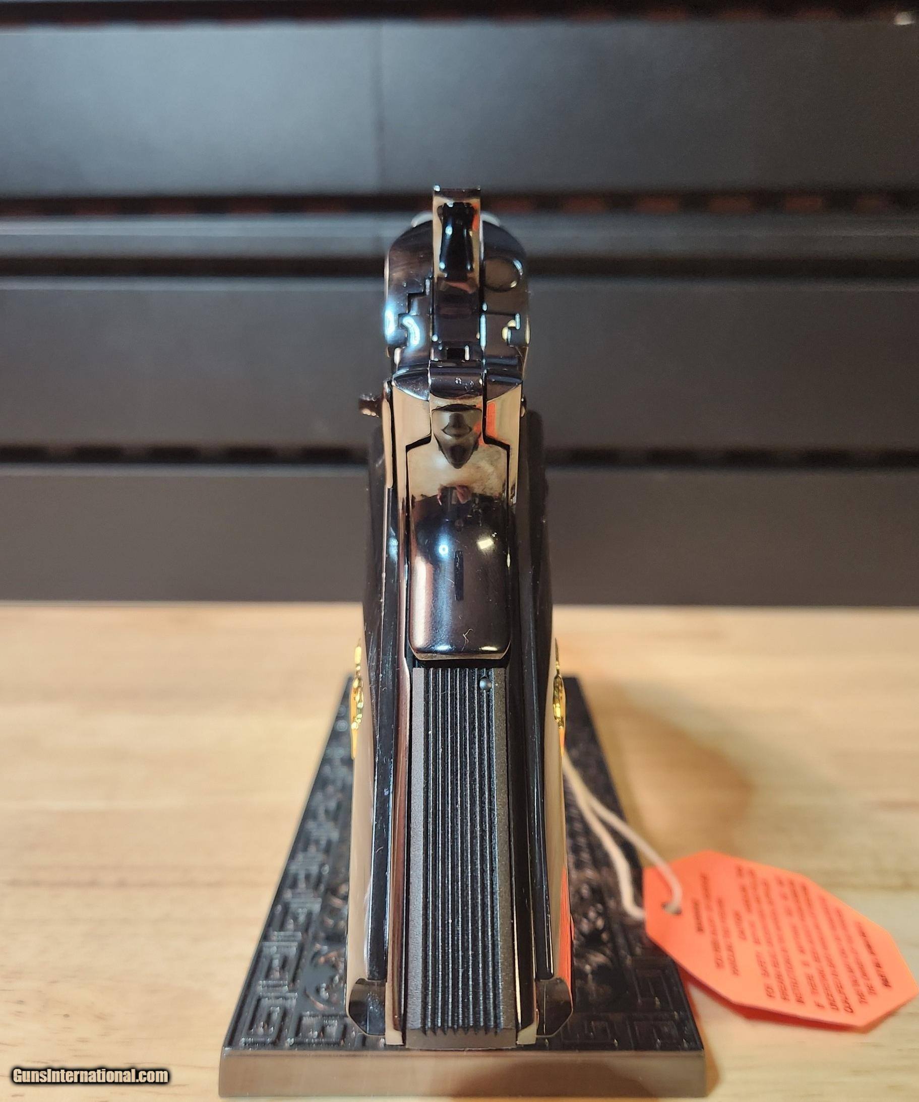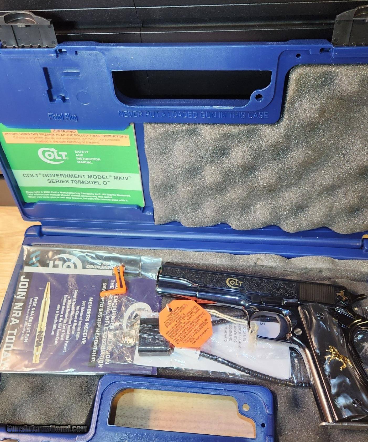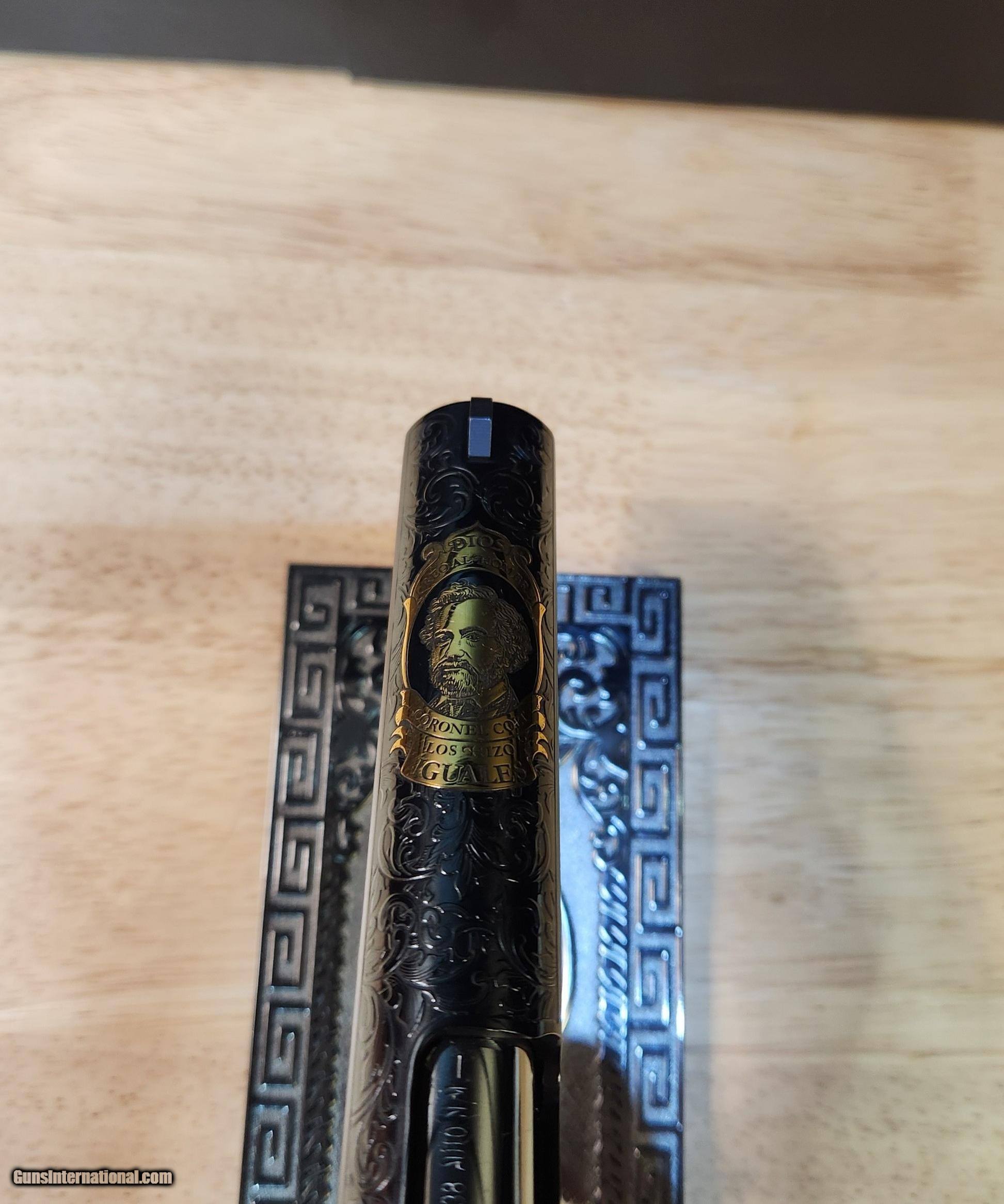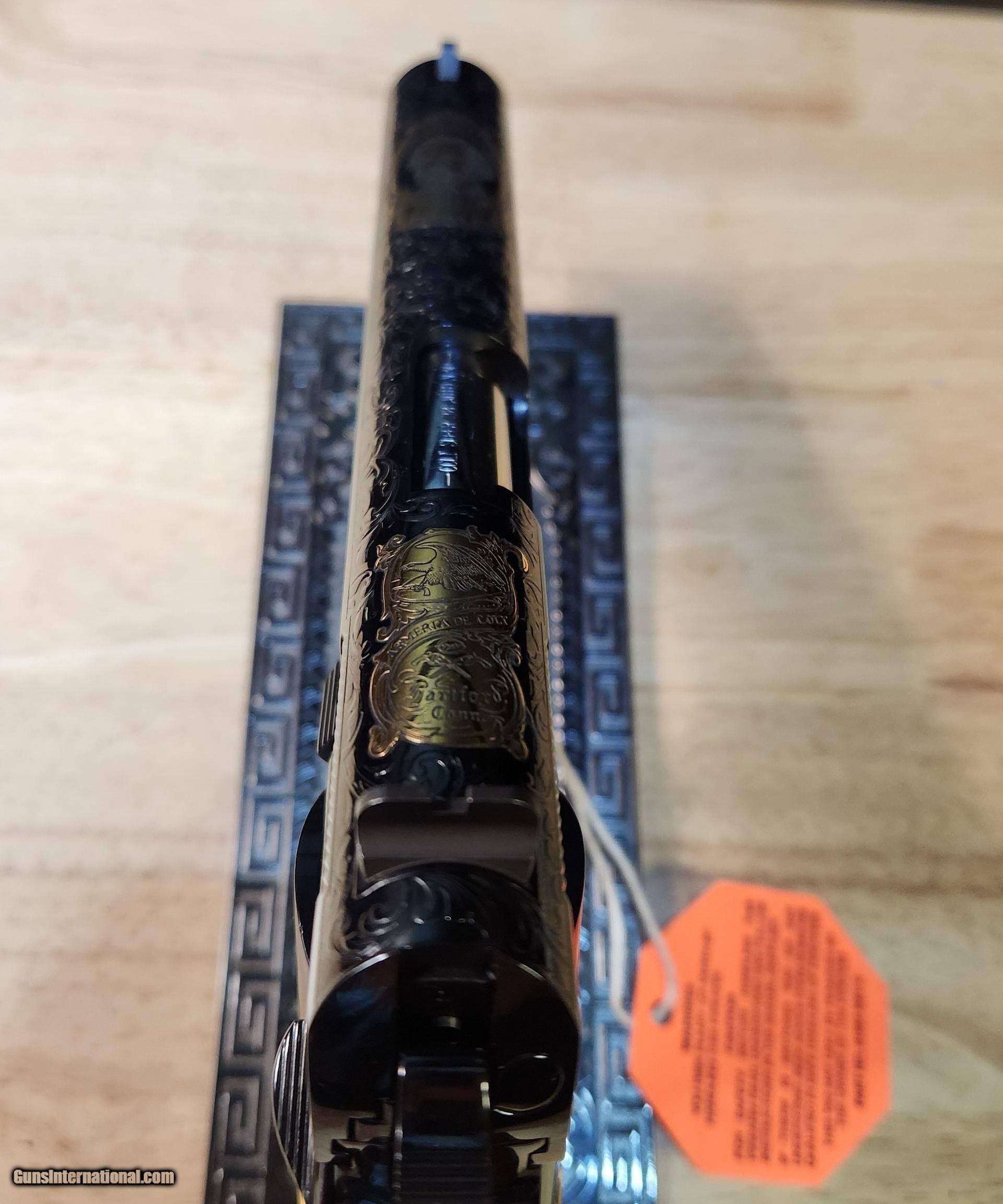 Description: Colt 1911 El Samuel 38 Super Pistol The Colt 1911 El Samuel Limited Edition is the ultimate collector’s item. Lustrous blued finish paired with an elaborate scroll engraved design, provides a striking base for gold inlays of Colonel Samuel Colt in Spanish, the Colt emblem, dome, patent and Rampant Colt on both the slide and Pearlite grips. Only 500 were created and each firearm is distinguished by a special serial number beginning with “ESB.” This Masterpiece can be described with one word. Exquisite Colt 1911 El Samuel 38 Super Pistol