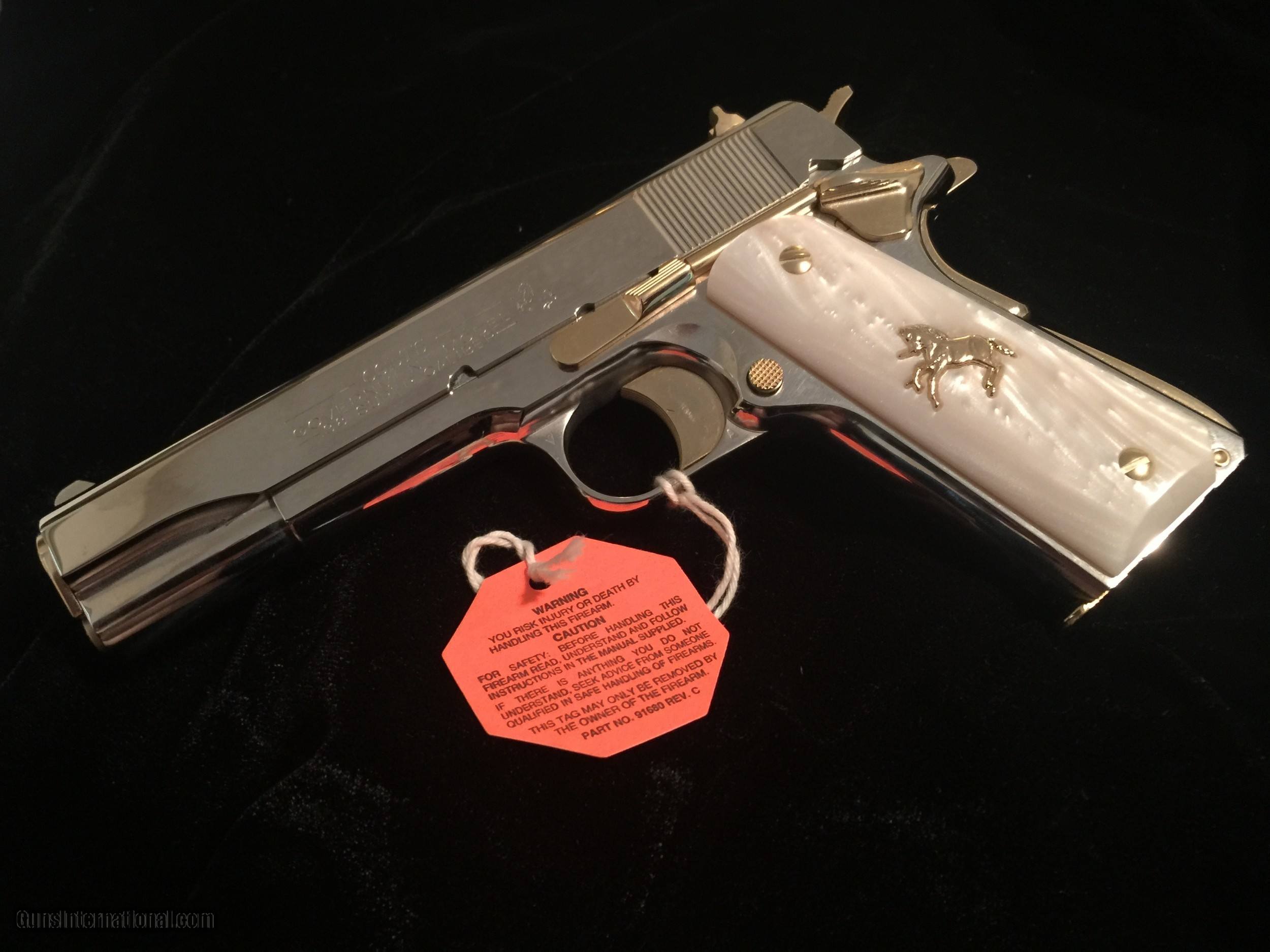 Description: Here is one of the most beautiful Colts you will ever see. It’s brand new & unfired, in the popular 38 Super Caliber, and was totally refinished in Jan 2016, in bright mirror-show quality nickel with accents of 24K gold plated barrel, hammer, safety, mag release button, grip safety, back strap, rear site, grip screws & one gold plated. It’s brand new in the original Colt serial numbered carry case, with manual, hang tag & Colt lock. Looks way nicer in person since it reflects all the background. Serial # 2933186. A real steal at only $2500 firm + $50 shipping. I don’t get these very often. ($2500 USD includes international export fees, shipping extra.) SOLD Manufacturer: COLT Model: 1911, Series 80 Serial Number: 2933186 Caliber Info: .38 Super Condition: EXCELLENT Metal Condition: EXCELLENT Bore Condition: EXCELLENT Barrels: 5 INCH Barrel Type: Full size semi-automatic w 5" barrel Case: Polyurethane Item Location: Canada |