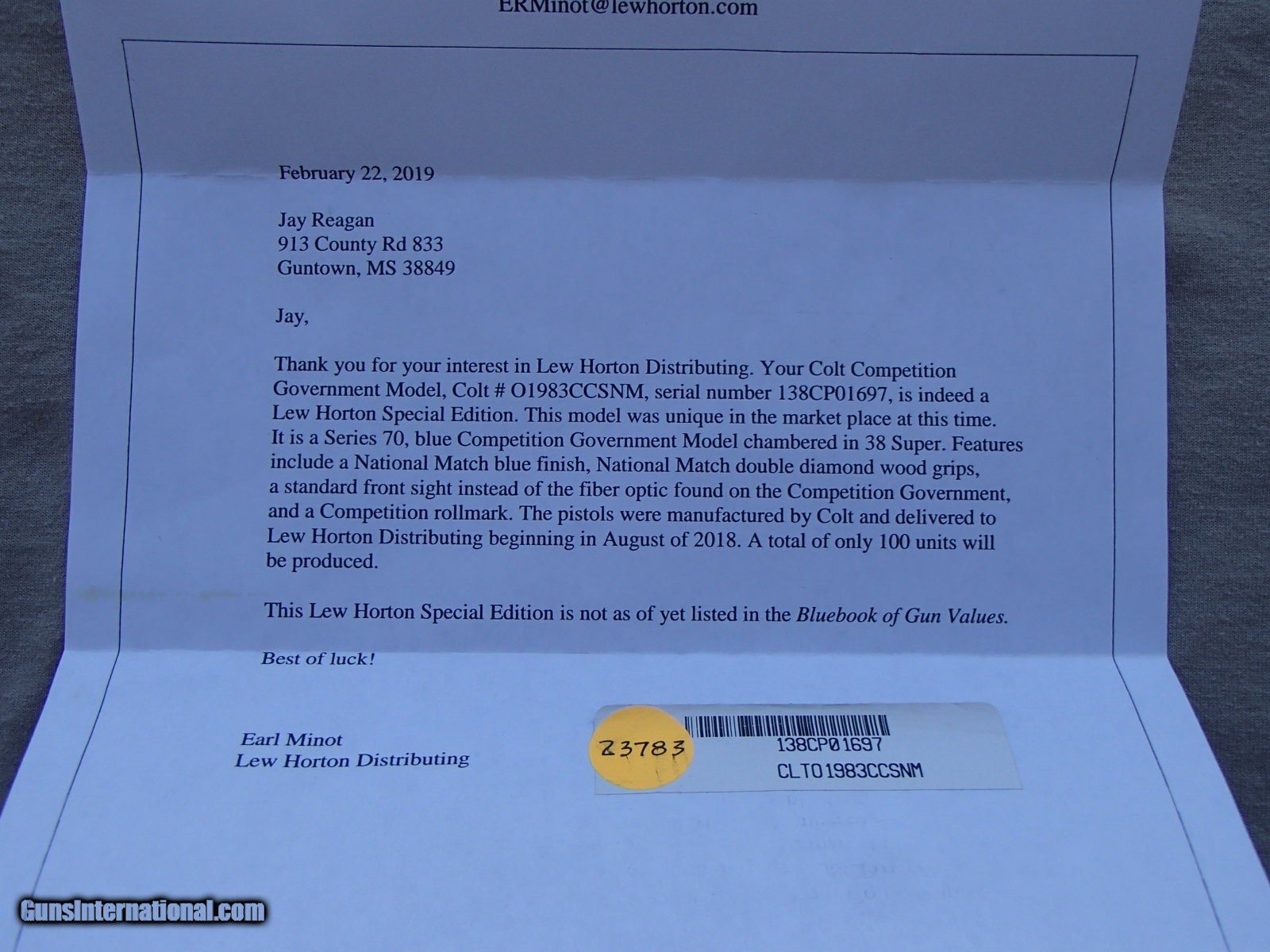 Colt Government .38 Super Competition National Match Lew Horton 1 of 100 NIB Lettered