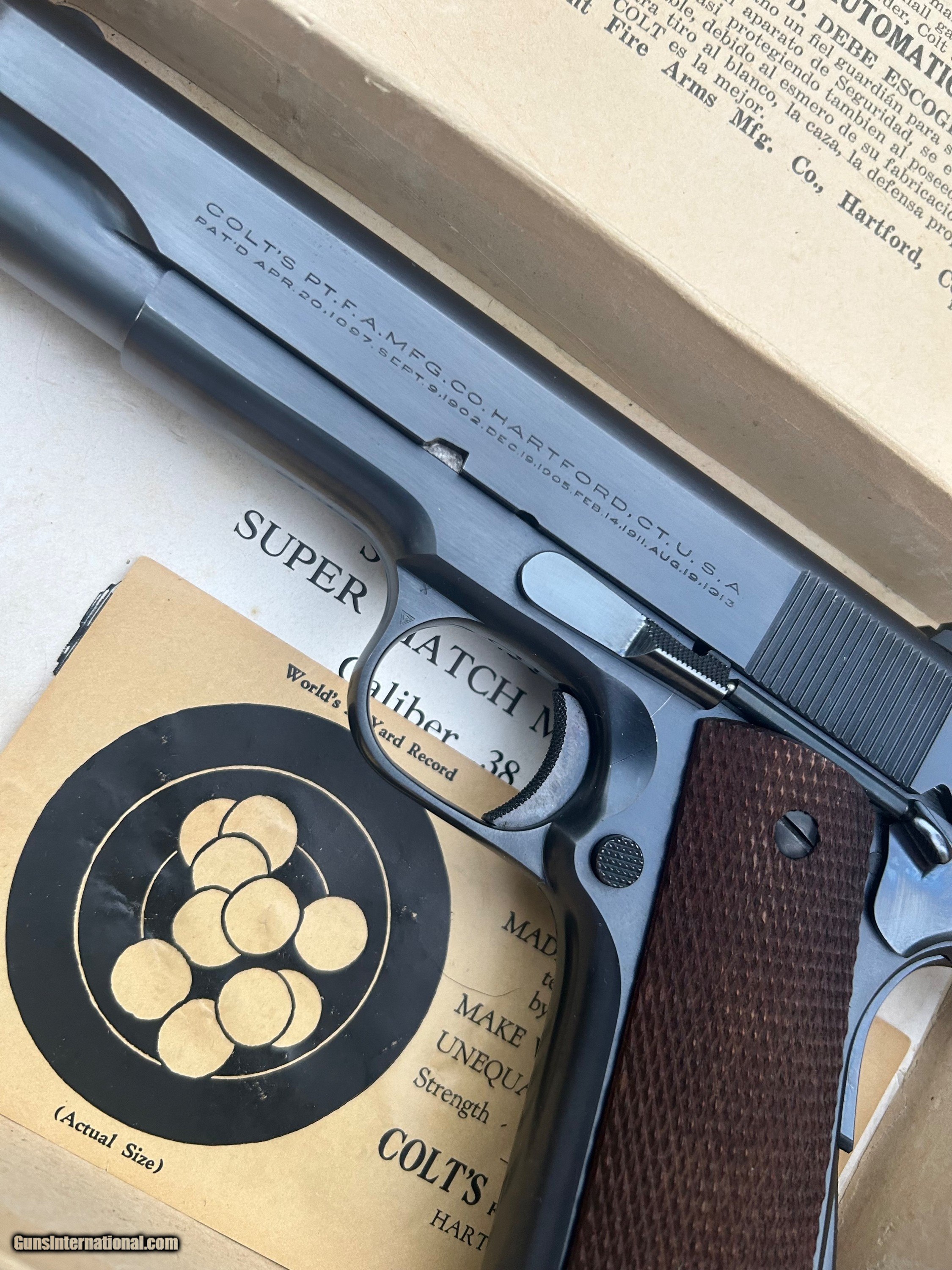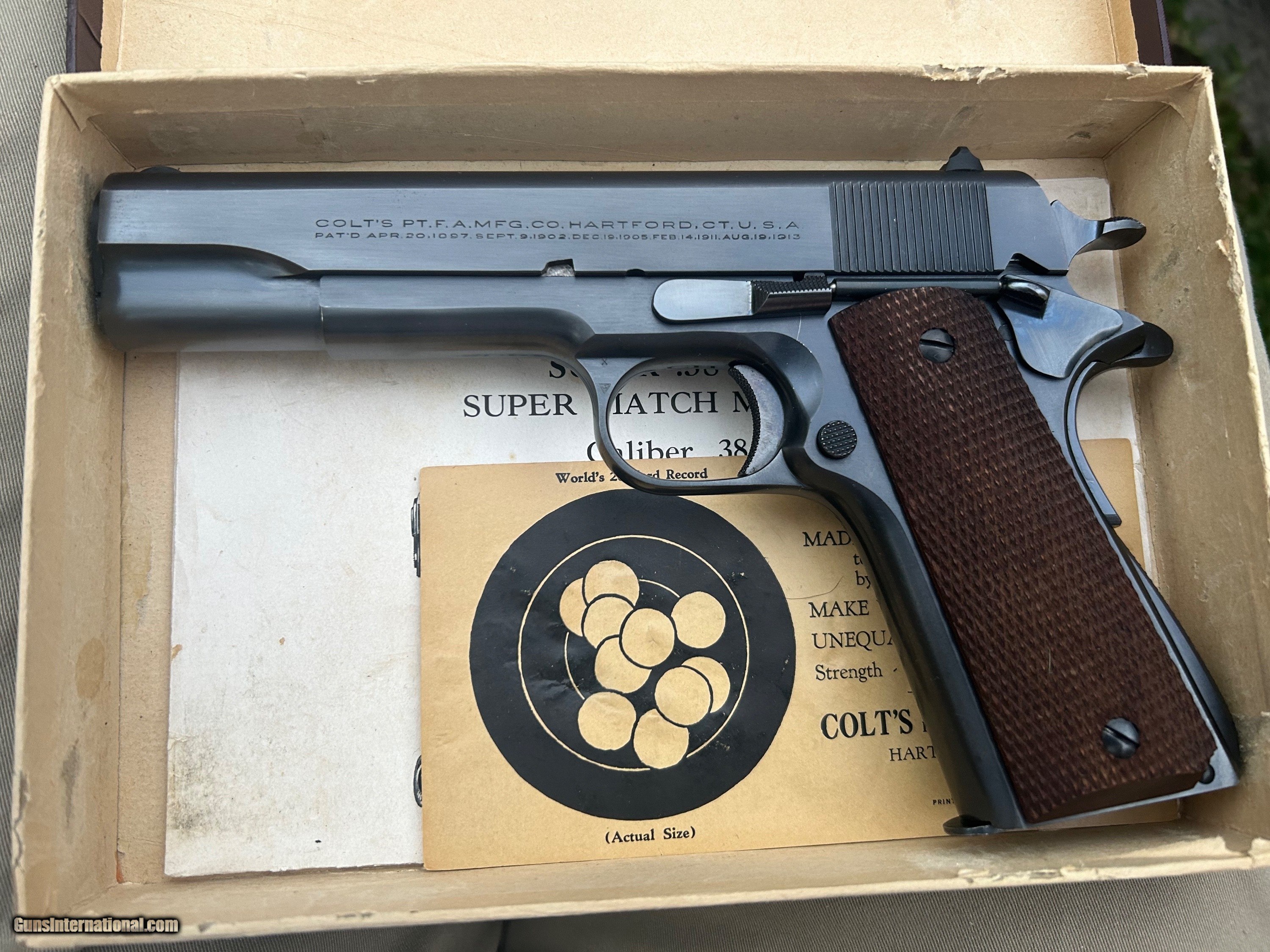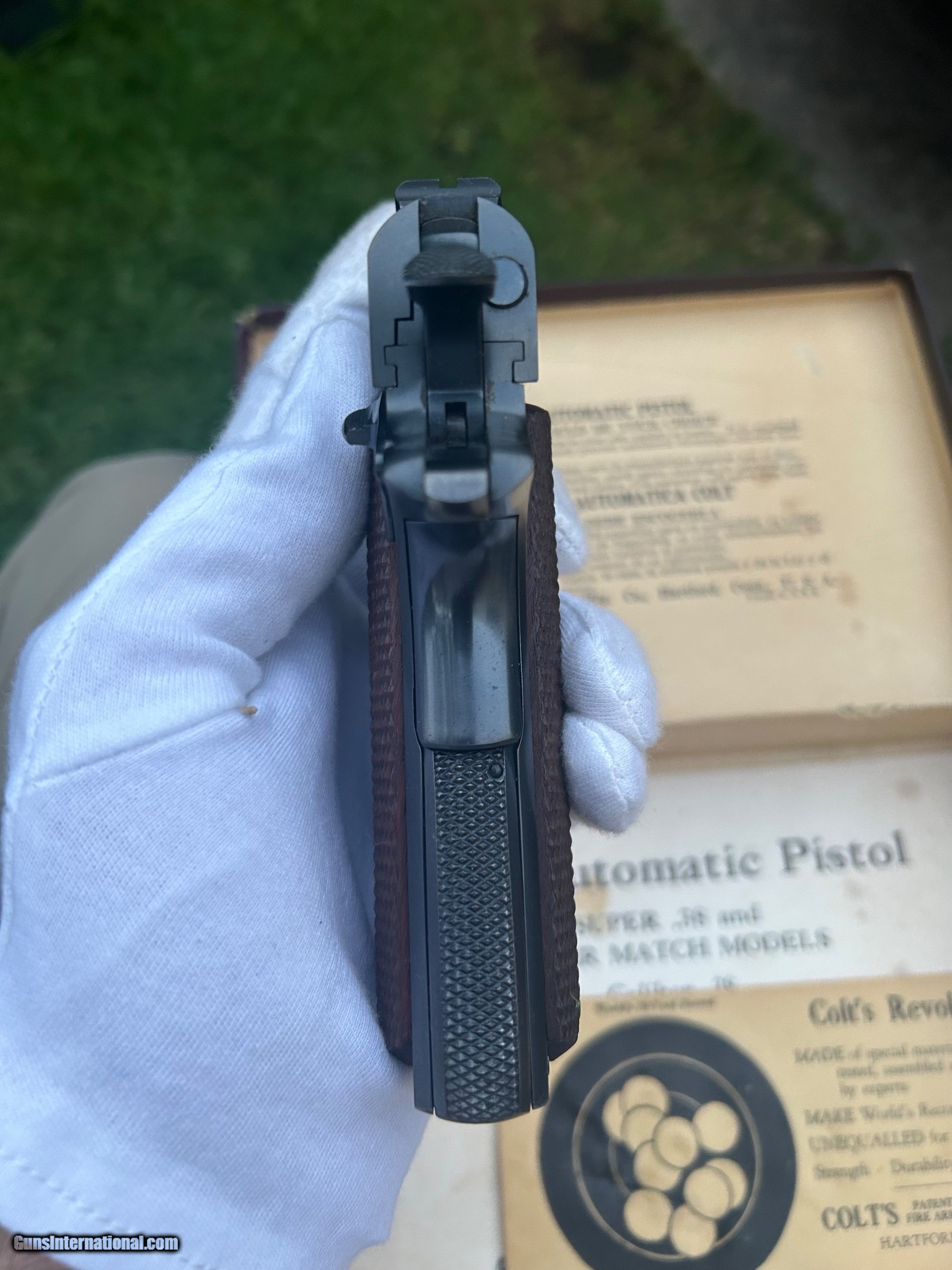 Description: Excellent Colt super 38 Prewar manufactured 1936 Fine example complete with original matching serial box to gun. They are Becoming harder to come by in complete original factory condition. SOLD Curio/Relic: Yes |