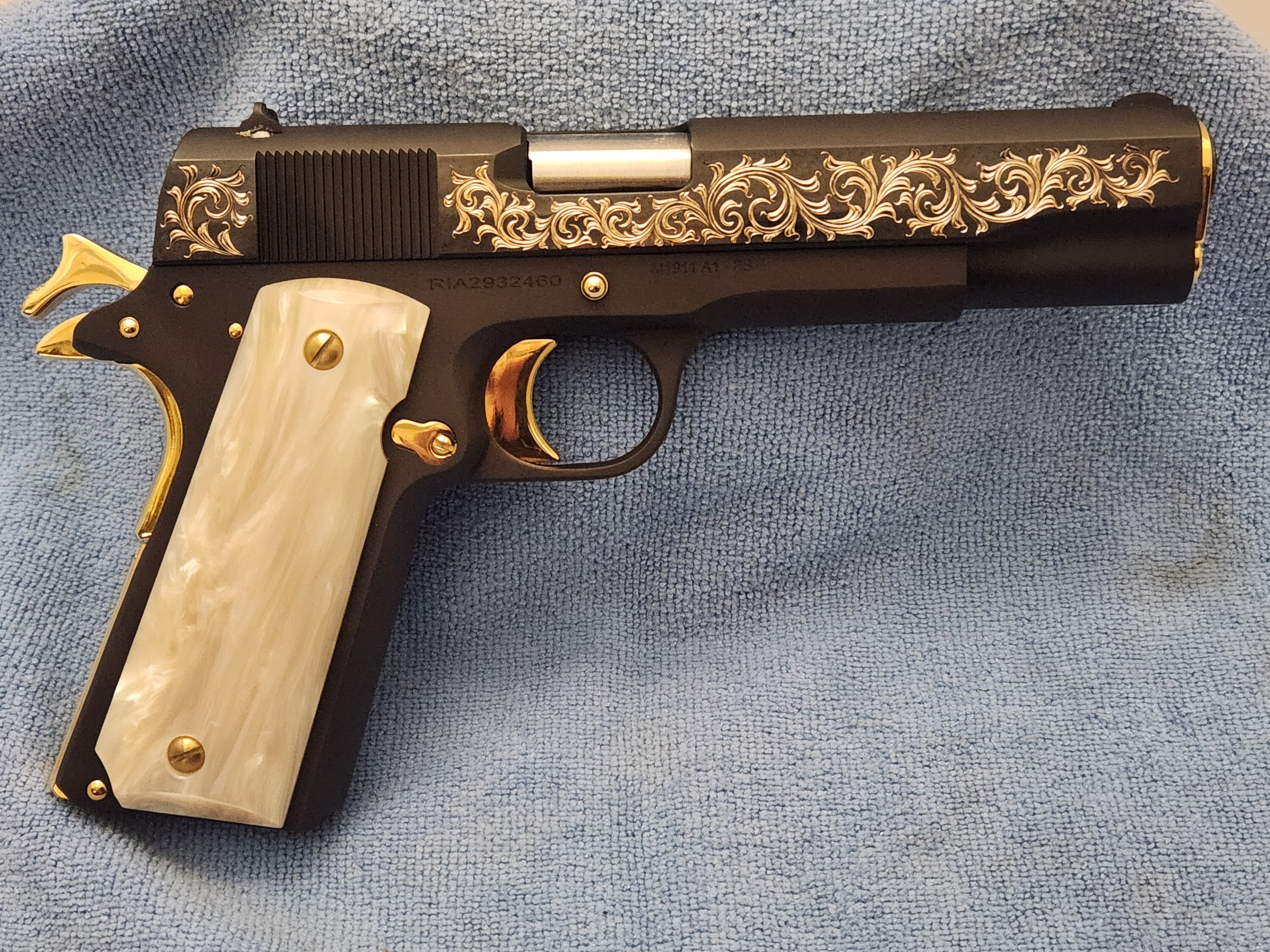 Description: RIA 1911 38 Super, hand engraved, 24kt gold ingraving and accents, pearl grips. Handgun Caliber: .45 ACP (.45 Auto) Manufacturer: Rock Island Armory Model: 1911 Condition: NIB Price: $2,000.00 Shipping: $50.00 Contact Seller |