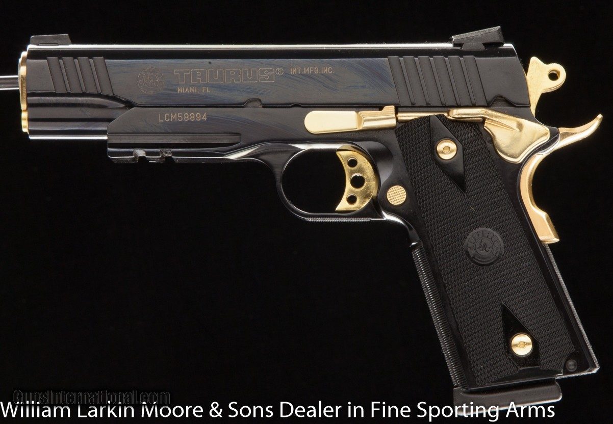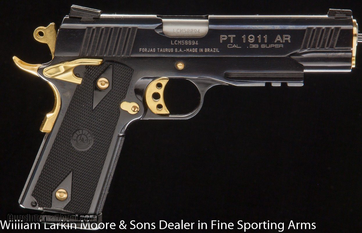 Description: ID # 7773 Make TAURUS Model PT 1911 AR Configuration Semi-Auto Gauge / Caliber .38 Super Price $900.00 Serial # LCM58894 Country of Origin Brazil Barrel Length (in Inches) 5 Stock Configuration Black plastic grips Receiver Finish Black Other Options Gold trim package, Ring hammer, Beavertails grip safety, Ambi safety, Adjustable sights, ABS case, Integral rail on bottom of frame Condition Near PERFECT Condition SOLD |