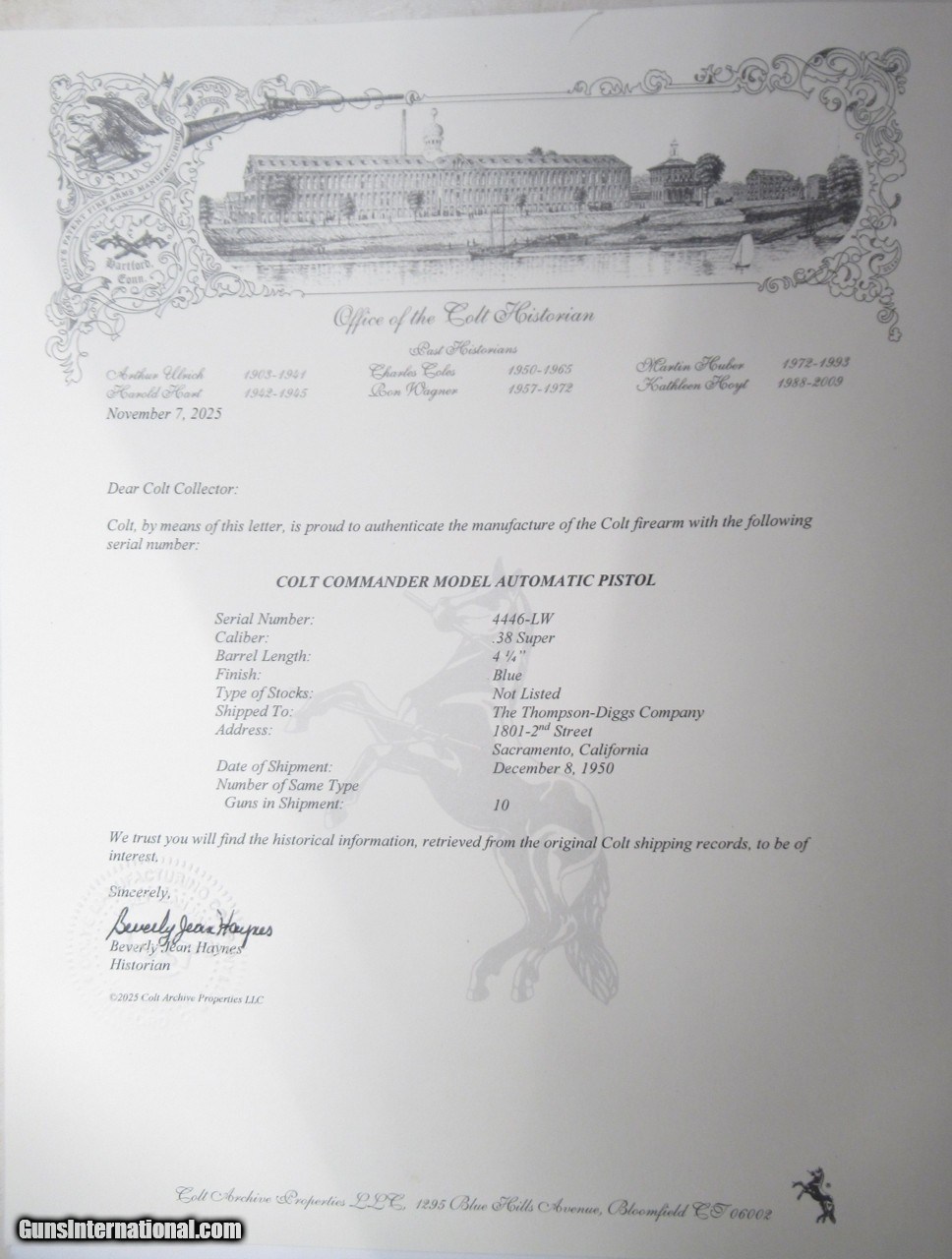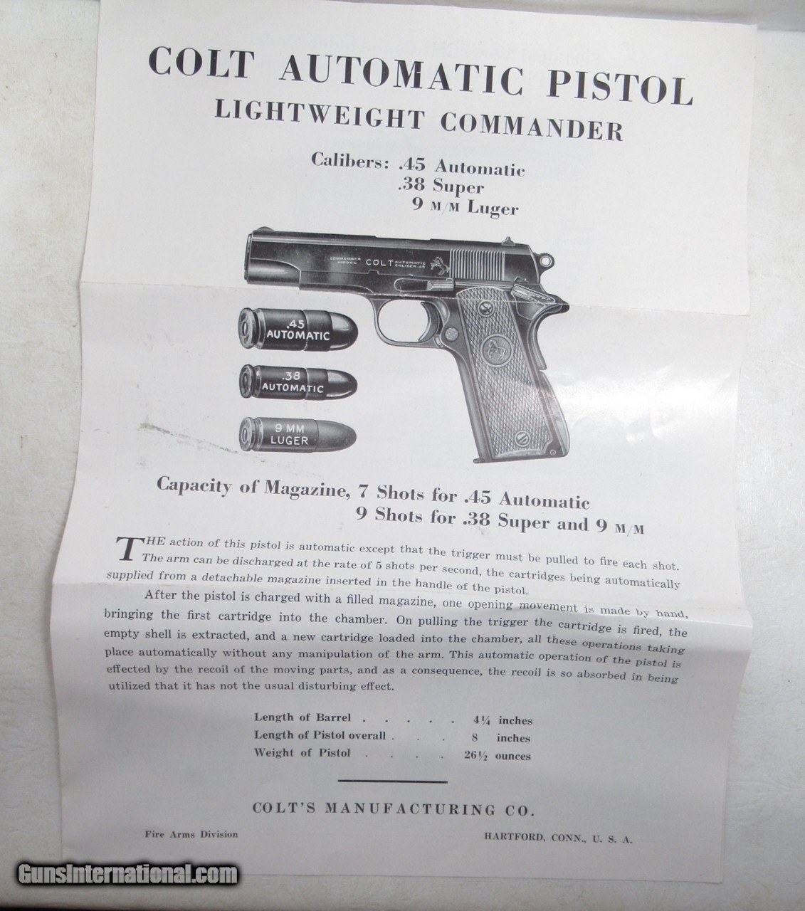 Description: Colt 38 Super Commander Lightweight Semi-Auto Pistol; Serial No. 4446-LW; Per Included Factory Letter: .38 Super Caliber with 4 ¼” Barrel and Blue Finish; Shipped December 8, 1950 to The Thompson-Diggs Company 1801-2nd Street in Sacramento, CA. as Part of a 10 Gun Shipment; NEW in ORIGINAL BOX with Papers and Accessories; See All Photos for Condition; No Texts; Call (254)541-5765 or Email Only; PERSONAL PROPERTY of Harold Wieser; NOTICE: We Do Not Do Any Consignments - All Items Listed are Owned by Us - NO SALES to New Jersey or New York City - Antiques Only to Massachusetts and California; NOTE: All Modern Firearms Must Go to FFL Dealer who will Accept From Individual with Texas Driver License; Price: $5,975 + $50 S&H; Payment Address: Harold Wieser - 1466 U.S. Hwy 77 - Rosebud, TX 76570; SEND PAYMENTS VIA USPS PRIORITY MAIL; BEWARE of SCAMS!!! - DO NOT SEND MONEY or CORRESPONDENTS ELECTRONICALLY UNLESS YOU HAVE SPOKEN to HAROLD WIESER FIRST! (254)541-5765 Manufacturer: Colt Model: 38 Super - LW Commander Serial Number: 4446-LW Price: $5,975.00 Contact Seller |