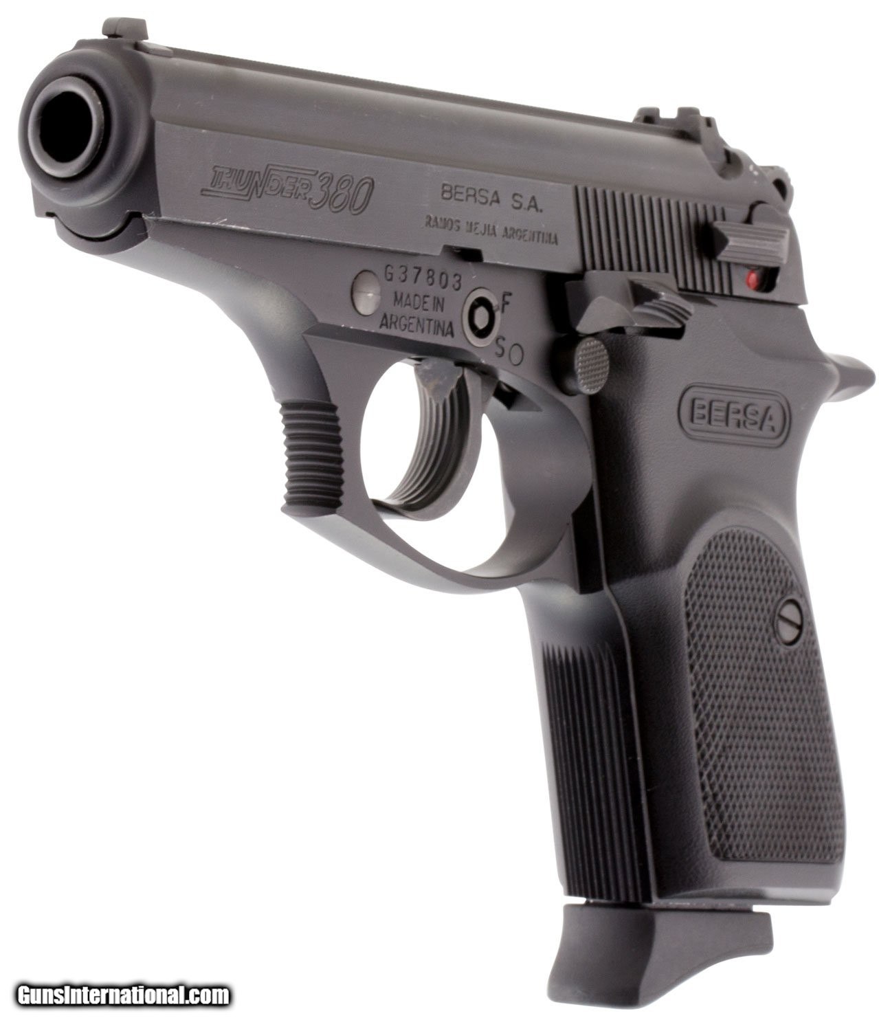 Description: Guns Listing ID: 30428 The Bersa Thunder is a semi-automatic pistol. It features a lightweight aluminum alloy frame steel slide with rear cocking serrations 3.5 barrel micro-polished bore with deep rifling integral blade front and notched-bar dovetailed rear three-dot sights combat style trigger guard checkered polymer grips with long rearward tang to prevent hammer and slide bite magazine with extended finger rest decocker and integral locking system. Some models additionally feature an automatic firing pin block. Details The Thunder .380 Bersas best selling model offers numerous valued features accuracy reliability and versatility in a lightweight compact design. Its easy to appreciate so much for so little. The Thunder .380 has earned a worldwide reputation of quality and is truly one of the best performance-for-price buys on the market. Its lightweight small-frame and ideal capacity combines with Bersas time-tested reliability and accuracy to make the Thunder .380 an excellent choice for personal protection. - Caliber .380 ACP - Action DASA - Capacity 81 71 - Barrel Length 3.5 - Front Sight Dovetail - Rear Sight Notched-Bar Dovetailed - Finishes Matte Black - Grips Checkered Polymer - Construction Alloy Frame Steel Slide - Safety Integral Locking System Manual Firing Pin - Weight 20.0000 - Length 6.6 - Height 4.9 - Width 1.3 Manufacturer: BERSA Model: THUNDER 380 Caliber Info: .380 ACP Condition: new Barrels: 3.5" BARREL Action: DOUBLE ACTION Finish: BLACK Weight: 1.3 LBS. Price: $307.99 Contact Seller |