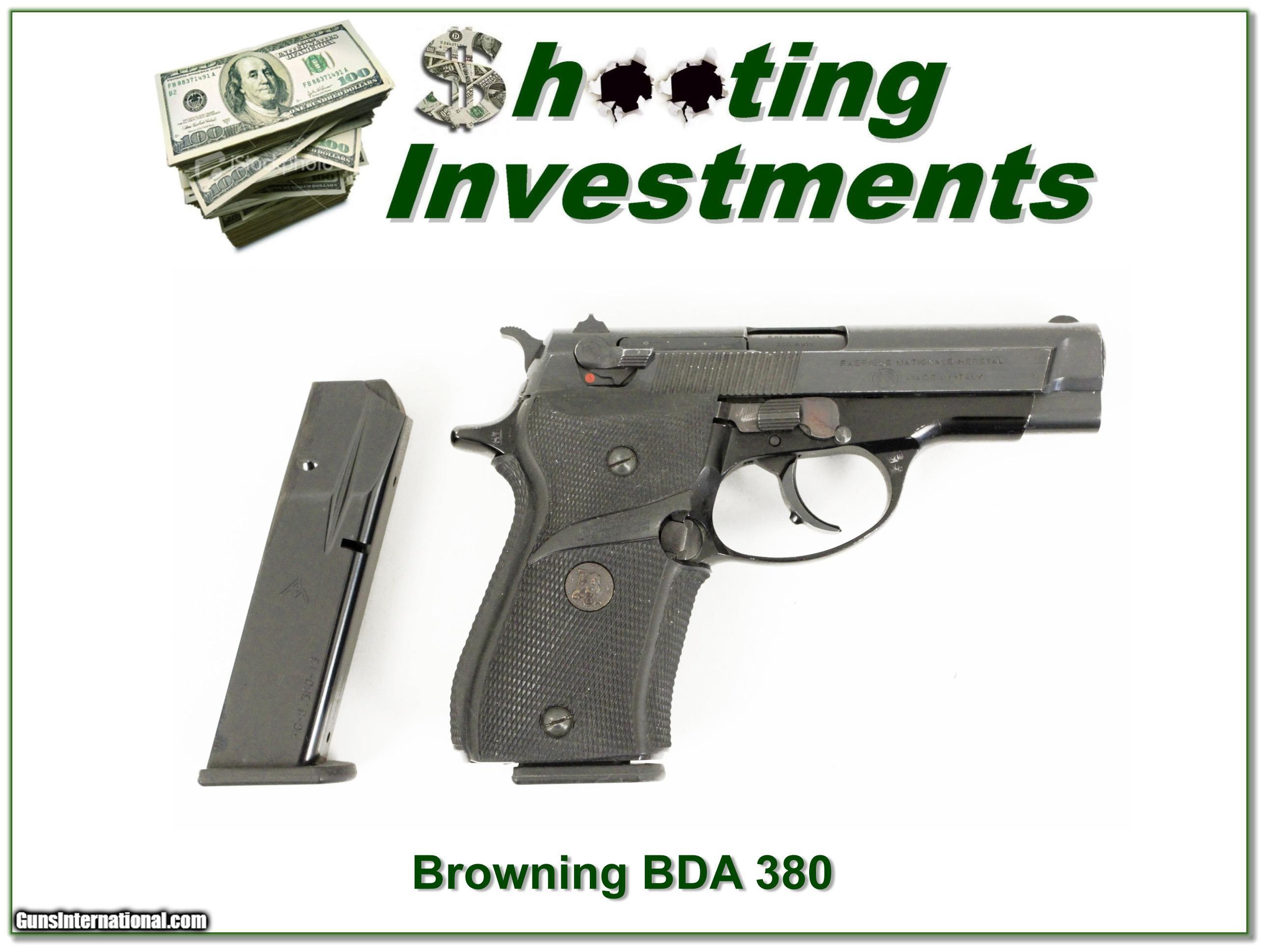 Description: This is a Browning FN BDA 380. It is in very good used condition and comes as seen with 2 magazines. I am selling this one on consignment and as such, lay-a-way can’t be used. It does of course have the standard 3-day inspection. Shipping and insurance is $35. Please email me with any questions or larger pictures. (I now consign quality firearms only 10%! Let me know if you have any you would like to sell!) 17-0815 Payment: Payment is by Money Order, Cashiers Check or Personal Check. I can now also accept MasterCard and Visa with a 3% convenience fee. PayPal can be used for some items but never firearms. Please let us know if you would like to pay via PayPal. Shipping: The shipping charge will be listed in each description. It is $35 for most guns. Some heavy guns or those insured for over $2000 will be higher. Shipments to Alaska and Hawaii are higher because air shipment is required. Most firearms are shipped within 5 days of receipt of payment. We prefer shipping at the beginning of the week to avoid firearms in transit over weekends. We package all shipments carefully and insure them for the full purchase price, rounded up to the next $100. In the unlikely event that damage occurs, it is important that you save all packaging material for the claims process. Optics are shipped Priority Mail and most other non-firearm shipments are shipped First Class. Returns: Our return policy is simple. If for any reason you are not pleased with your purchase, you may return your item for a refund. The only exception is ammunition, it cannot be returned. It is important to us that you are happy. Guns cannot be fired or dissembled before returning them and must be returned in the same condition as received. Notification of a return must occur with-in 3 days of receipt at your dealer. Shipping, convenience and dealer fees are not refundable and are the responsibility of the buyer. Lay-a-way: If needed, we offer a 60 day lay-a-way option on most firearms. It is 1/3 now, 1/3 in 30 days and 1/3 in 60 days. Lay-a-way firearm sales are final. Consigning your firearms with Shooting Investments: We will help you get top dollar for your firearms. While most local guns shops charge 20% or more, our fee is only 10% with a minimum of $50. At your local gun shop it might take months to sell. Selling on-line provides instant access to thousands of interested buyers. You won’t find any other on-line dealer willing to sell your firearms for only 10% or listing every gun on 4 separate s. Selling through an House typically costs the seller 15% and the buyer an addition 15% (so 30%) and you have to wait several months to sell and longer to receive funds. If properly priced, we will sell your firearms in a week or two. Send us an email or give us a call and we’ll explain how easy it is for you to get top dollar. Trading: We collect guns and usually just trade for guns we want to add to our collections. We often sell guns for others wanting to purchase one of ours. We find this the most fair to both of us. Our Commission is only 10% and we hold the gun you want until yours sells. Please contact us if you want to sell one of yours to buy one of ours. Help for California Buyers: We are happy to ship to California. It is the buyer’s responsibility to make sure any item you buy is legal in your state. We are also happy to help with your purchase of a firearm from someone other than us. If you see a gun you would like to buy but the seller can’t or won’t ship to California we can help. You buy the gun and have it shipped to us. We’ll then ship it to your California dealer. The cost for this service is only $30 + shipping. Let me know if we can help! SOLD |