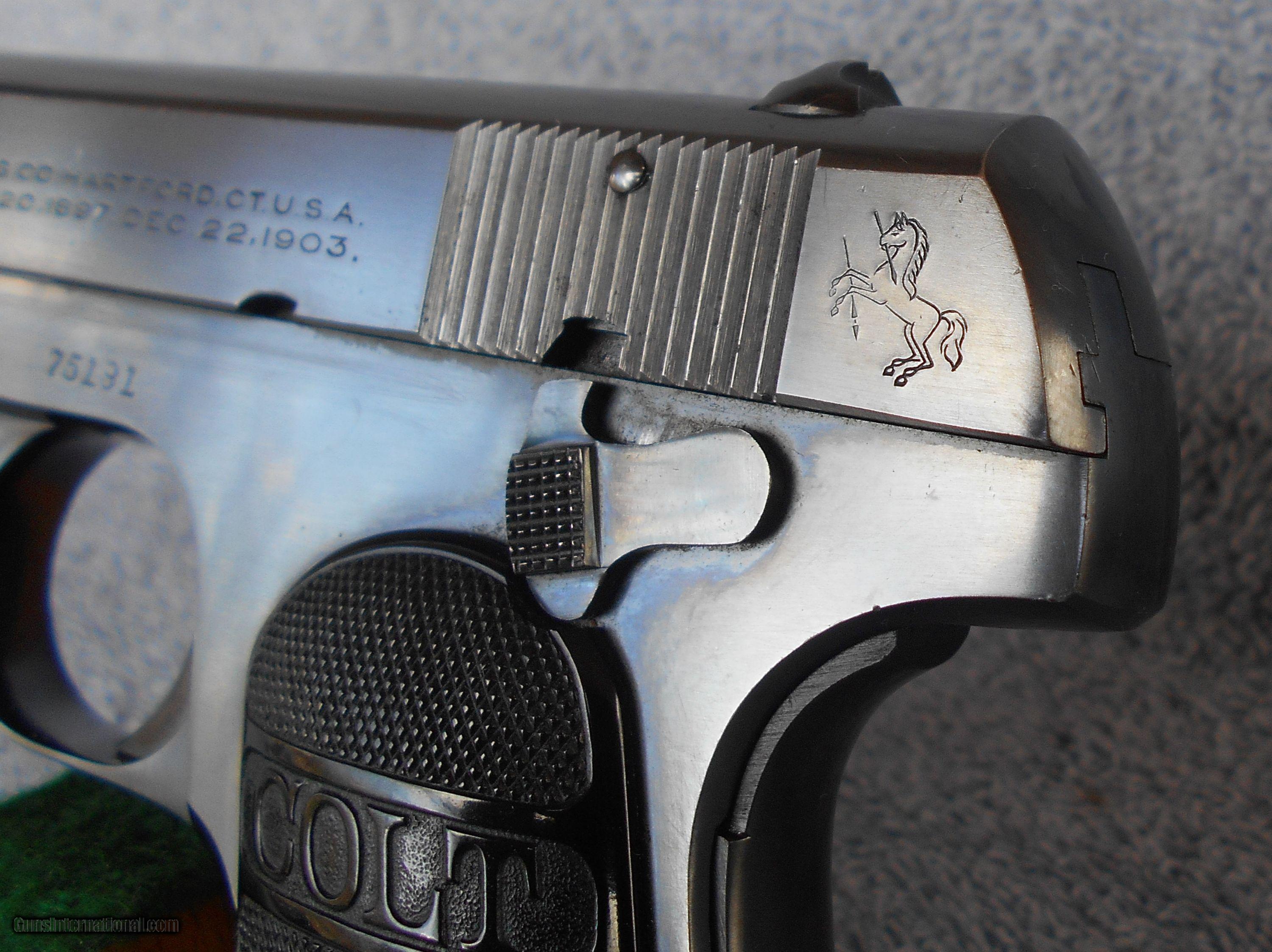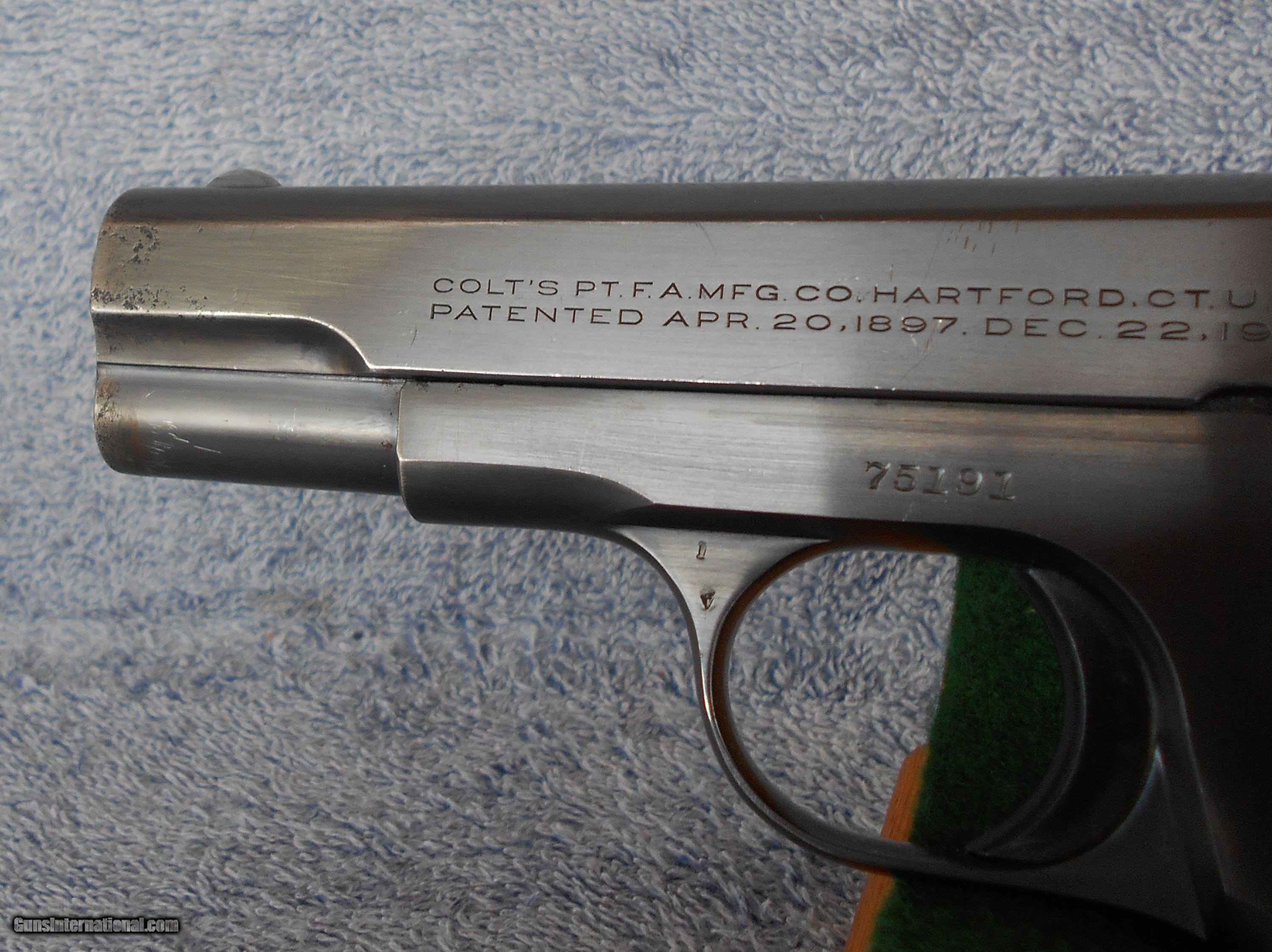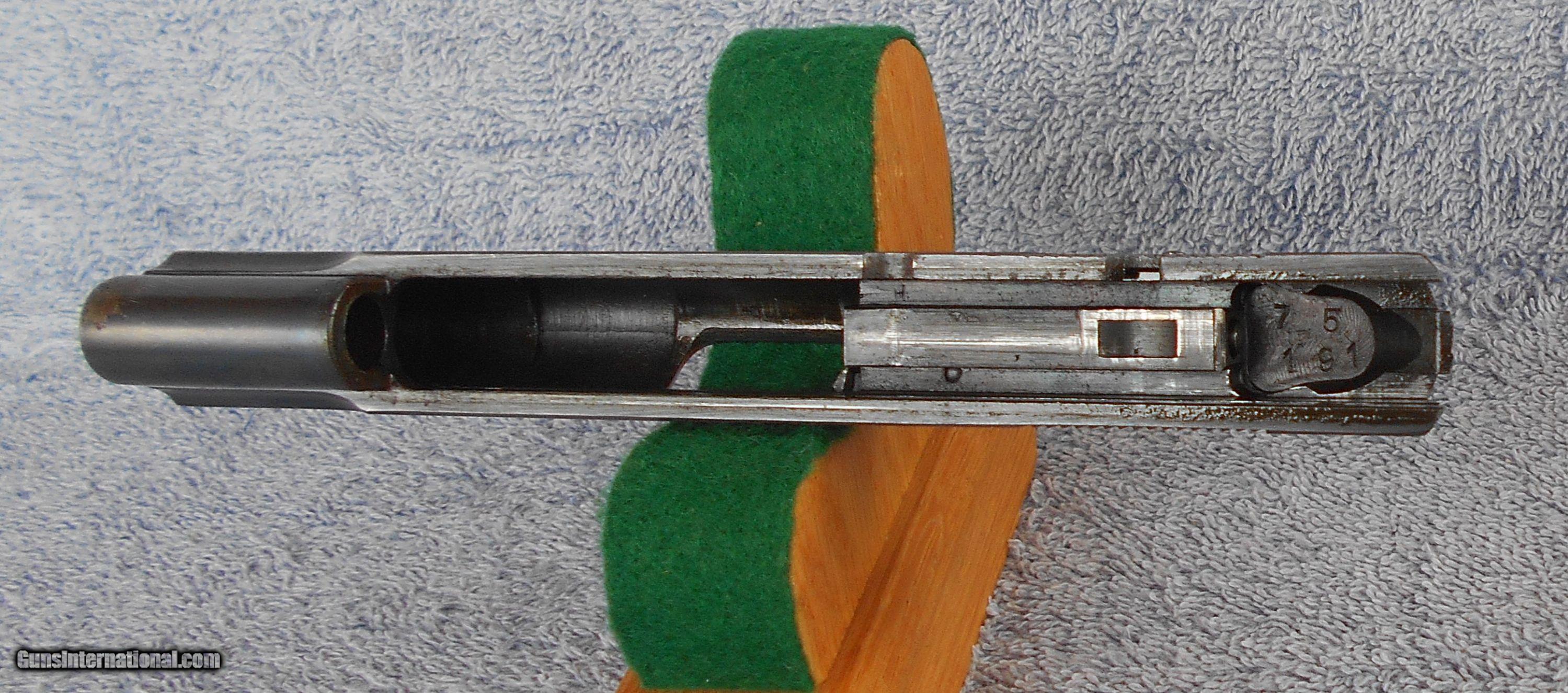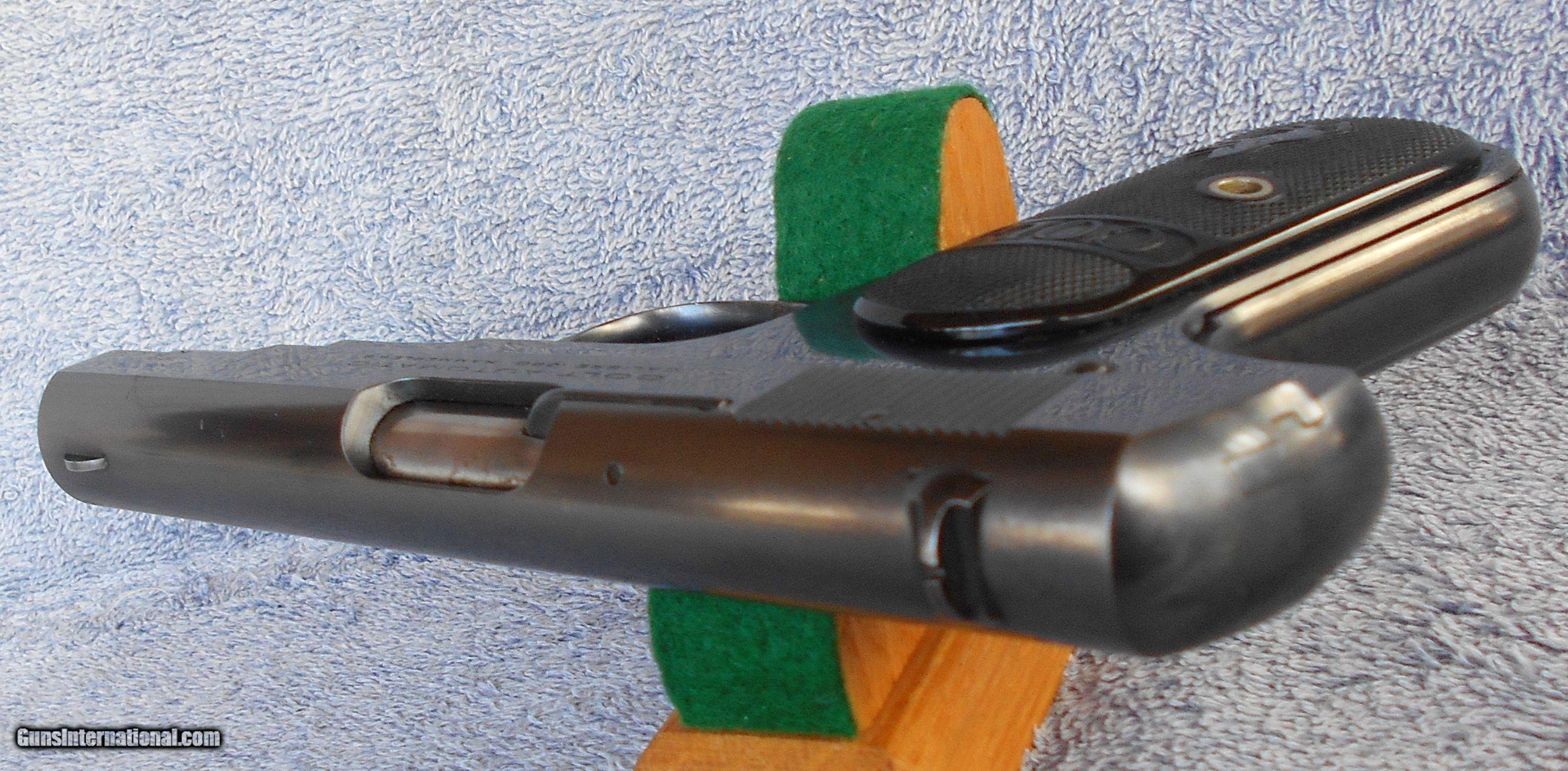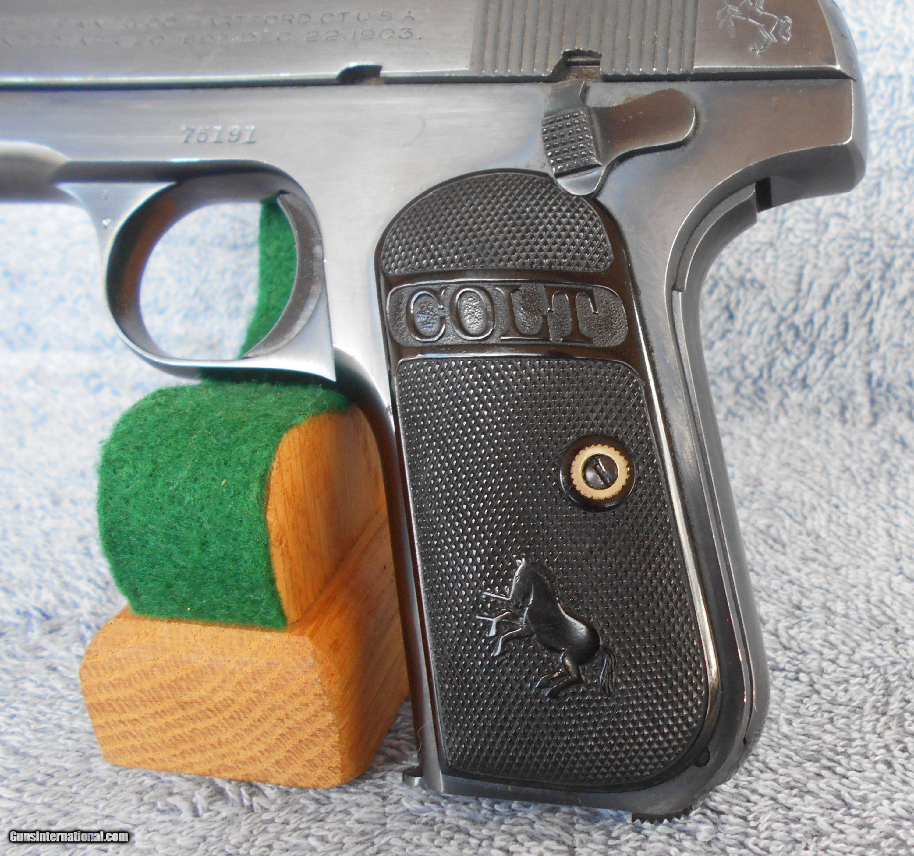 Description: Year of manufacture is 1925. This pistol is very close to being super nice. A high percentage of the original blue finish remains on the slide and receiver. Also the grip straps retain a very high percentage as well. This pistol shows little wear overall. Markings are clear and original. The bore is bright and shiny. It shows little wear and will rate a nine on a one to ten scale. Grips are excellent with no cracks or chips. Action is smooth and tight. It works perfectly. The only area you need to be aware of is the left side of the slide. It has a small amount of pitting and is discolored. I made the area look as bad as I could in the pictures. This Colt 1908 .380 is really close to being a great piece. It will make a super shooting addition to any collection. Please let me know if you would like additional pictures. American Arms & Antiques item #2012 SOLD Curio/Relic: Yes |
