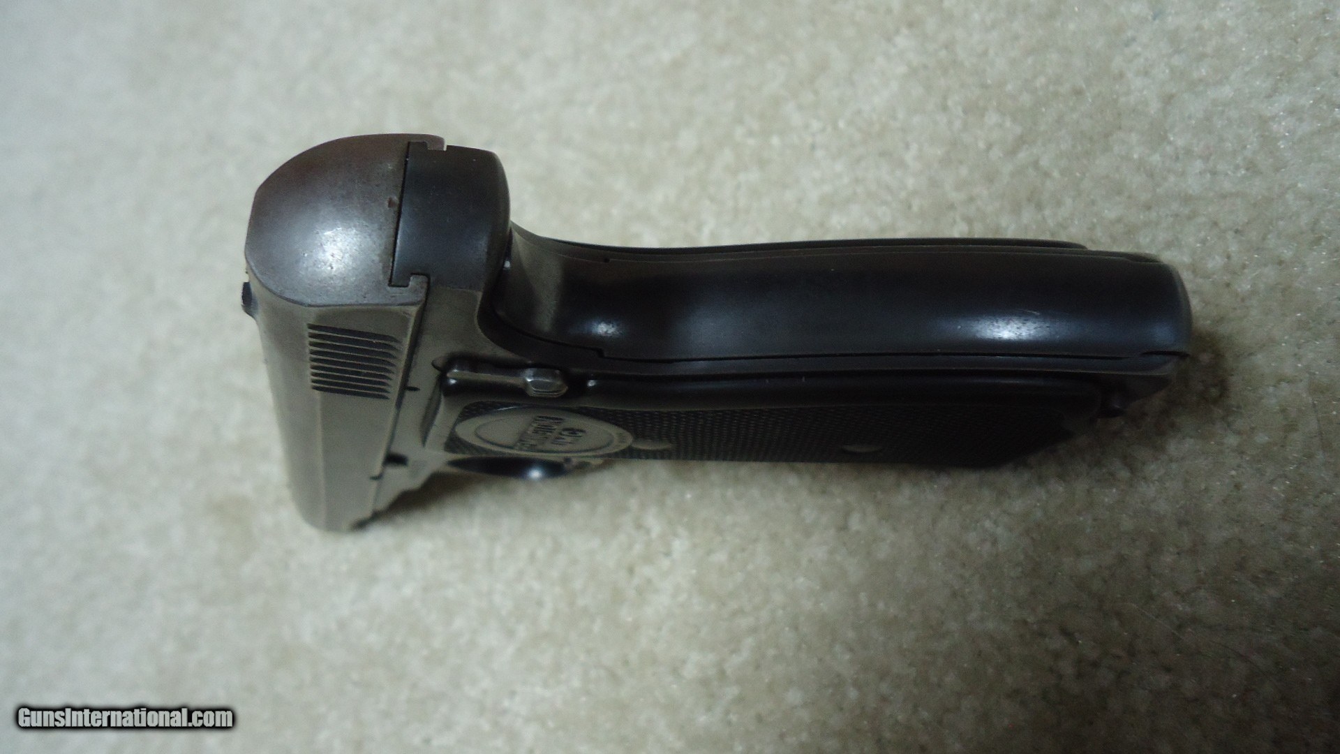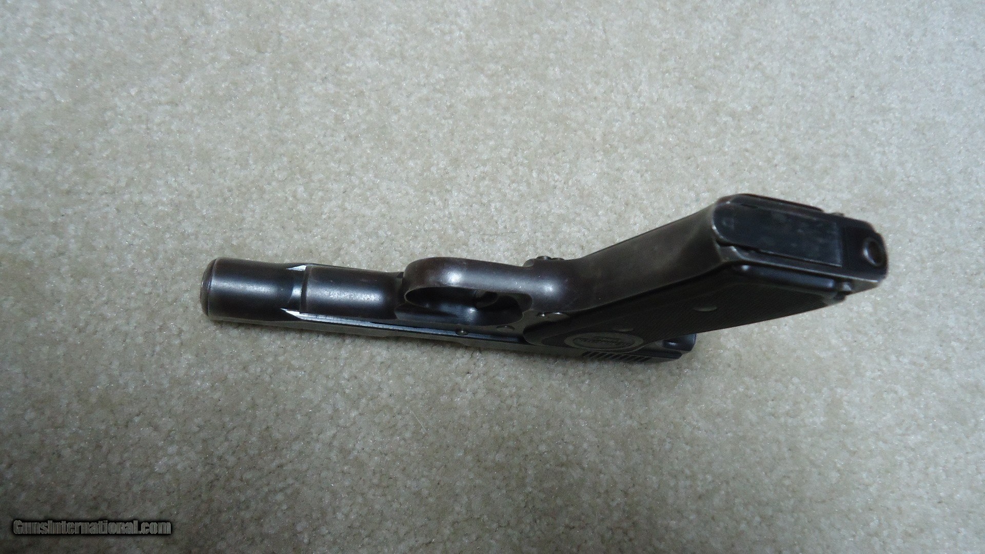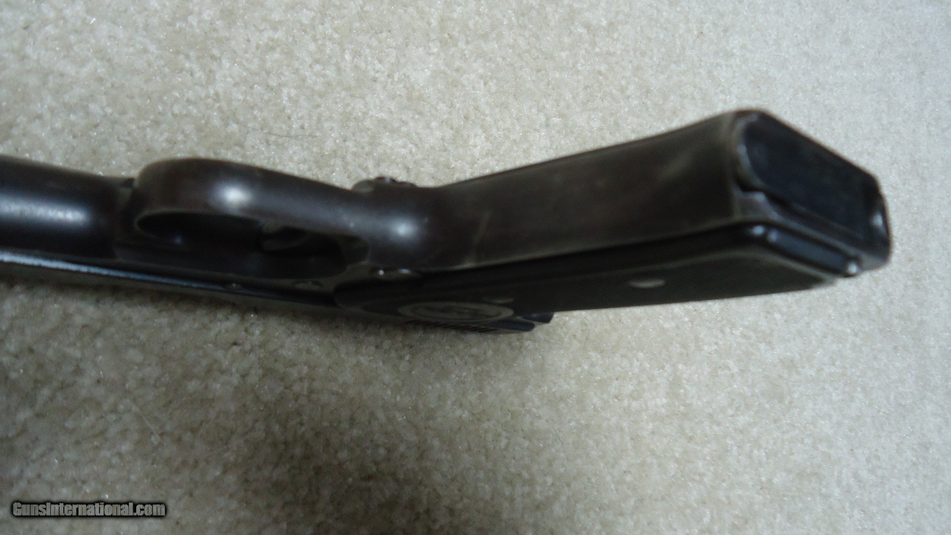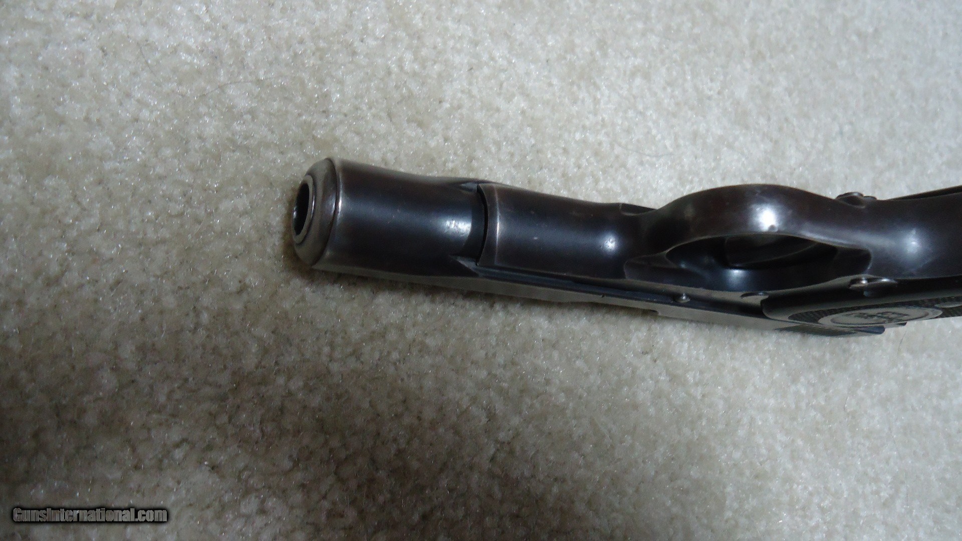 Description: EARLY MODEL 51 .380 ACP HAMMERLESS AUTO PISTOL, #4XXX. Considered one of the finest, if not the finest, of the pre-war pocket autos, the 7-shot M-51 was only made from 1918 - 1934. About 54,000 of these were made. The earliest examples have nine slide grooves with the later production having 15. This has the nine grooves and judging by the serial number was probably a first or second year production pistol. Overall fine condition showing normal light carry wear. The slide shows some blue dulling and edge wear, but retains good color as does the back strap. The front strap sand trigger guard also shows some blue ageing and dulling, but not gray or silver. Original Remington-UMC marked grips are fine, tight action, manual and grip safeties function properly, fine bore and original magazine. Early examples like this are difficult to find. SOLD Curio/Relic: Yes Handgun Caliber: .380 ACP (9x17mm Browning Short) Manufacturer: REMINGTON Model: MODEL 51 Serial Number: 4XXX Barrel Length: 3 1/2 Condition: FINE |