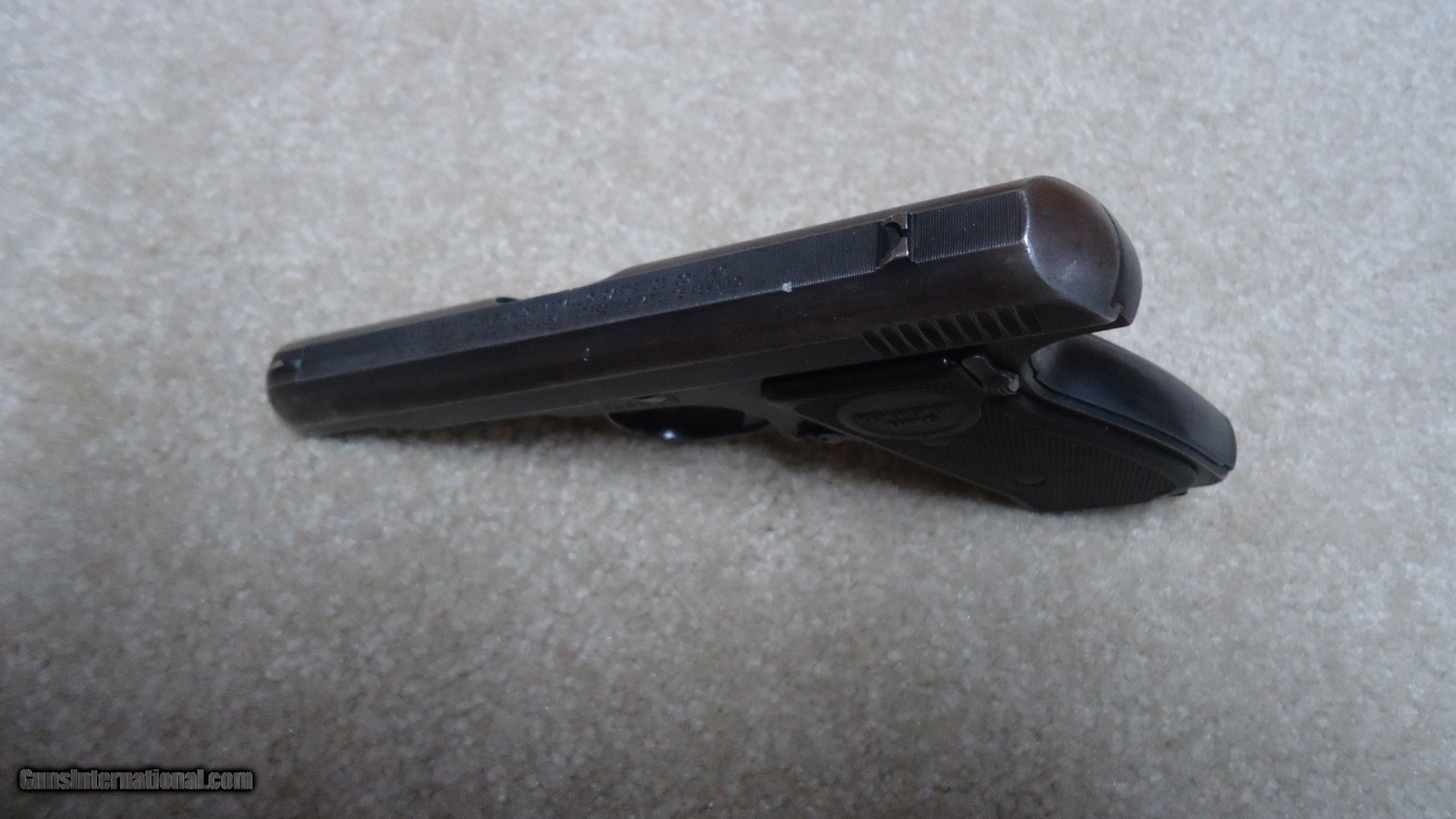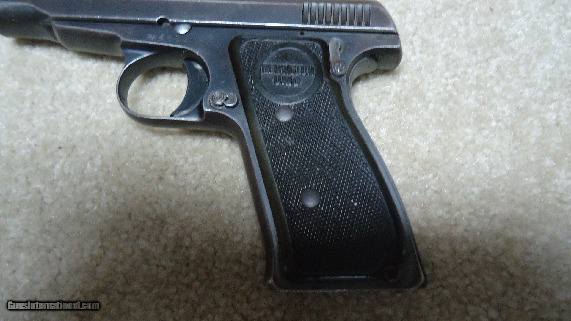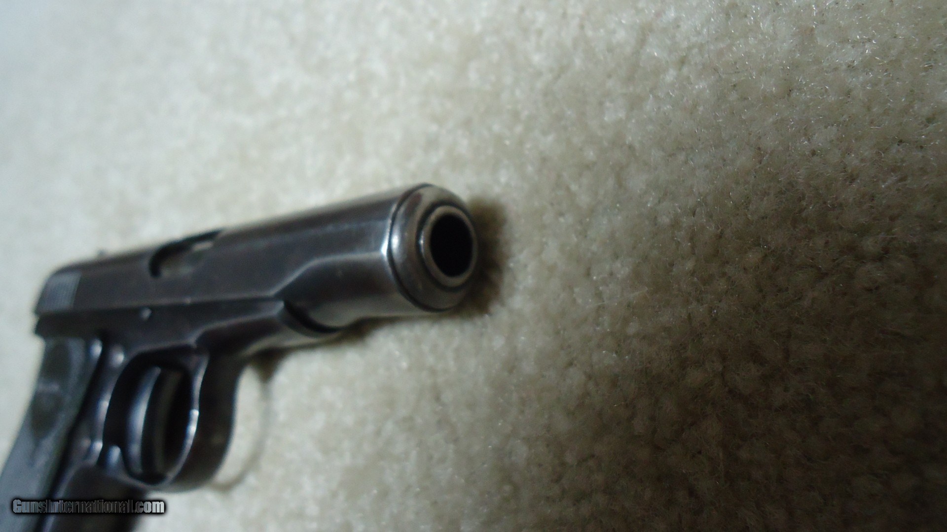 Description: EARLY MODEL 51 .380 ACP HAMMERLESS AUTO PISTOL, #4XXX. Considered one of the finest, if not the finest, of the pre-war pocket autos, the 7-shot M-51 was only made from 1918 - 1934. About 54,000 of these were made. The earliest examples have nine slide grooves with the later production having 15. This has the nine grooves and judging by the serial number was probably a first or second year production pistol. Overall fine condition showing normal light carry wear. The slide shows some blue dulling and edge wear, but retains good color as does the back strap. The front strap sand trigger guard also shows some blue ageing and dulling, but not gray or silver. Original Remington-UMC marked grips are fine, tight action, manual and grip safeties function properly, fine bore and original magazine. Early examples like this are difficult to find. SOLD Curio/Relic: Yes Handgun Caliber: .380 ACP (9x17mm Browning Short) Manufacturer: REMINGTON Model: MODEL 51 Serial Number: 4XXX Barrel Length: 3 1/2 Condition: FINE |