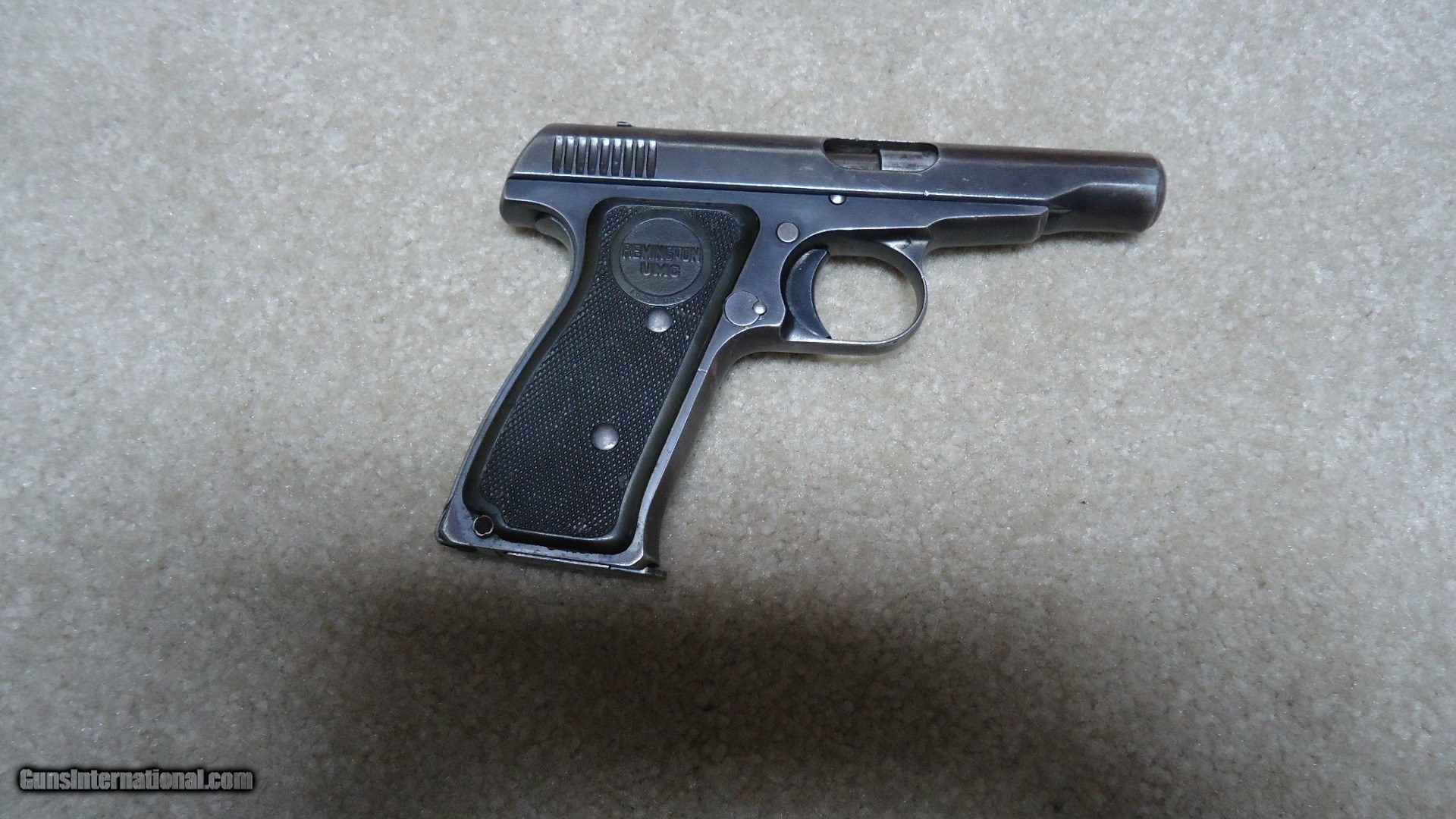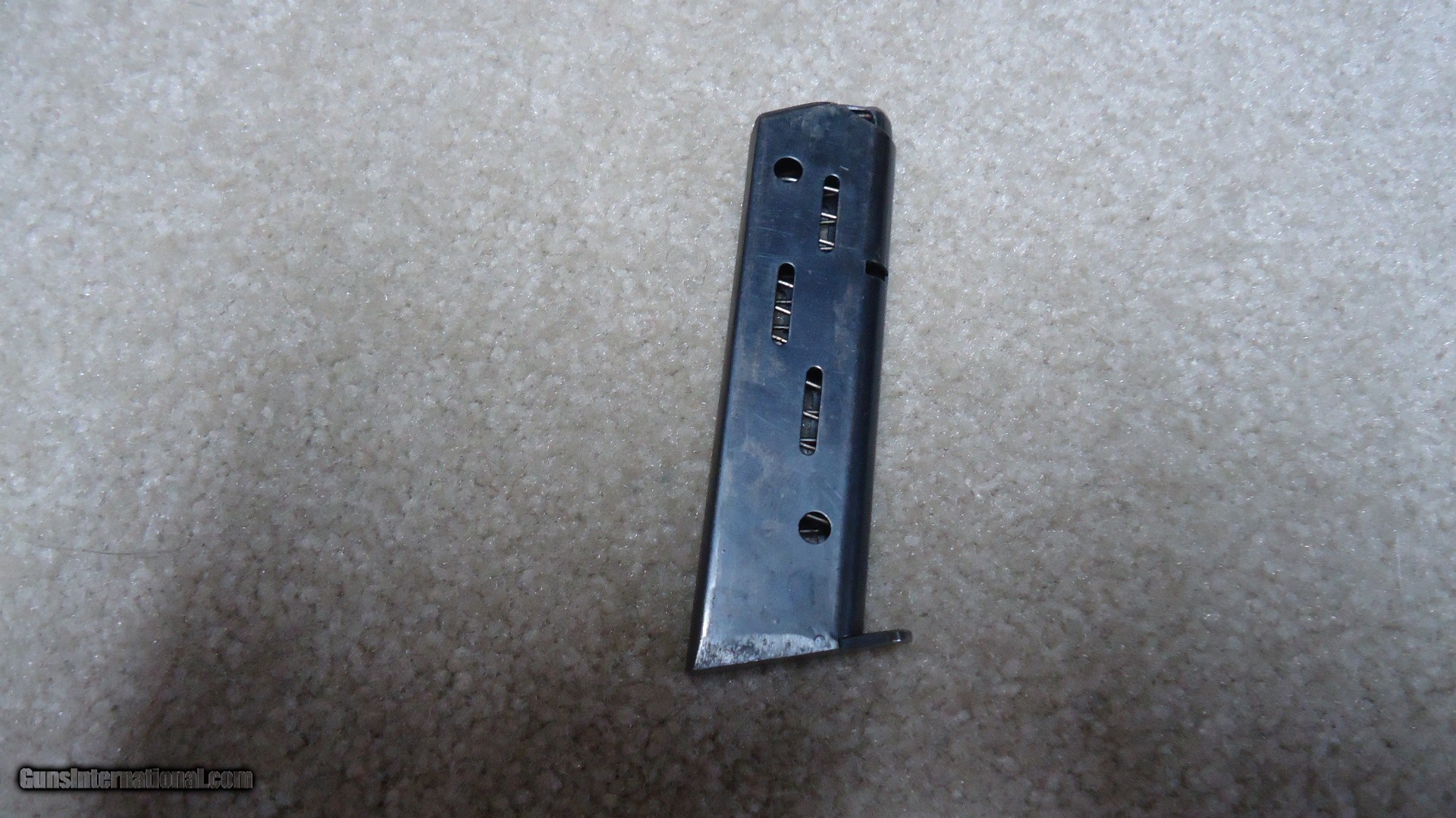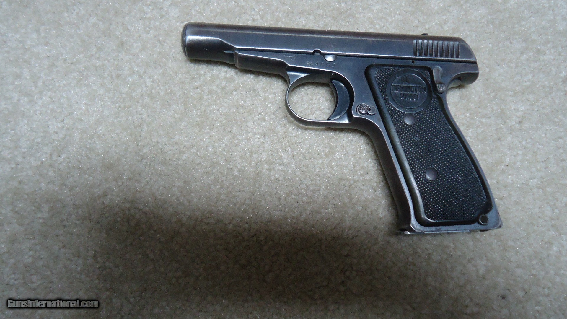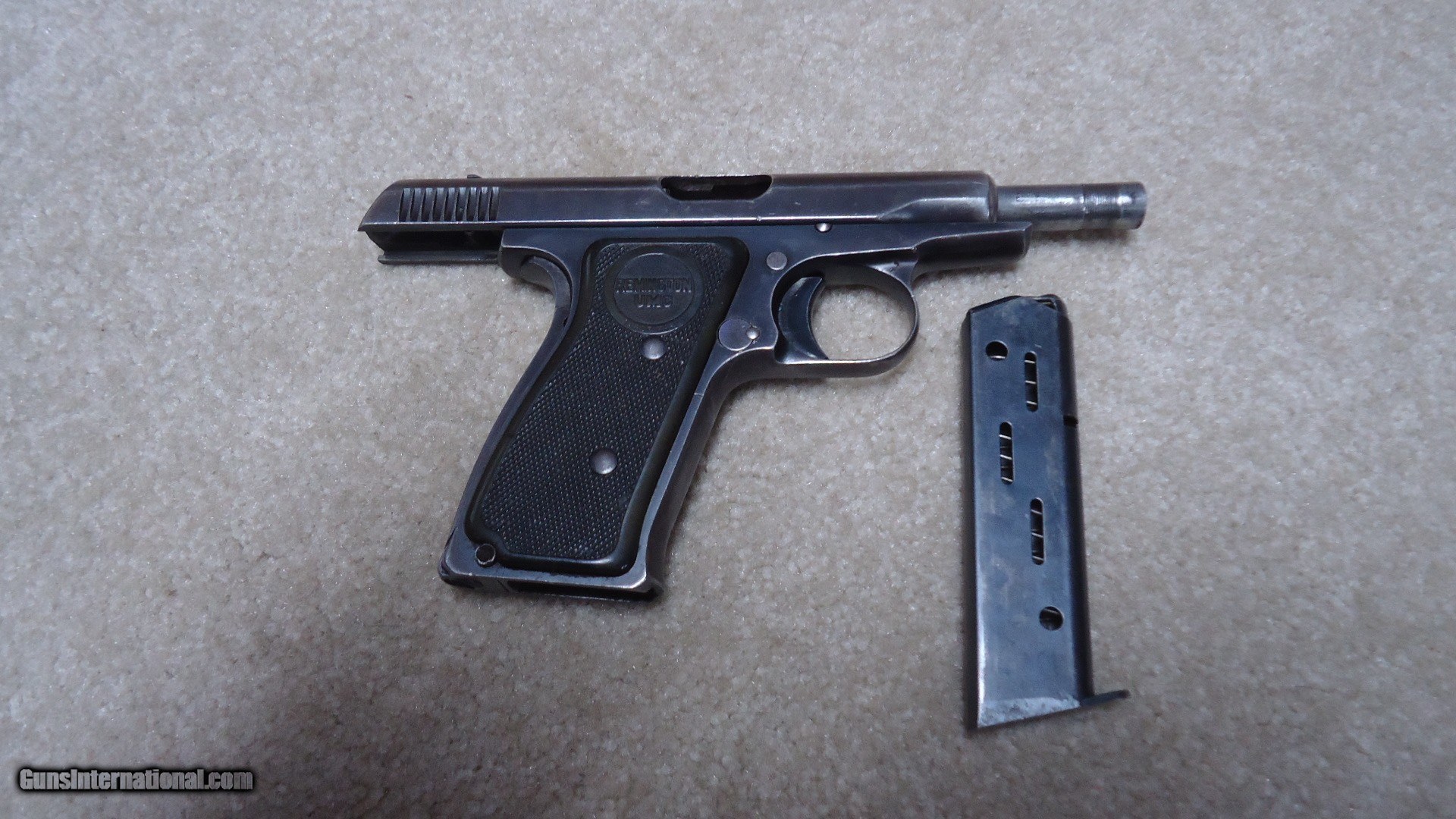 Description: EARLY MODEL 51 .380 ACP HAMMERLESS AUTO PISTOL, #4XXX. Considered one of the finest, if not the finest, of the pre-war pocket autos, the 7-shot M-51 was only made from 1918 - 1934. About 54,000 of these were made. The earliest examples have nine slide grooves with the later production having 15. This has the nine grooves and judging by the serial number was probably a first or second year production pistol. Overall fine condition showing normal light carry wear. The slide shows some blue dulling and edge wear, but retains good color as does the back strap. The front strap sand trigger guard also shows some blue ageing and dulling, but not gray or silver. Original Remington-UMC marked grips are fine, tight action, manual and grip safeties function properly, fine bore and original magazine. Early examples like this are difficult to find. SOLD Curio/Relic: Yes Handgun Caliber: .380 ACP (9x17mm Browning Short) Manufacturer: REMINGTON Model: MODEL 51 Serial Number: 4XXX Barrel Length: 3 1/2 Condition: FINE |