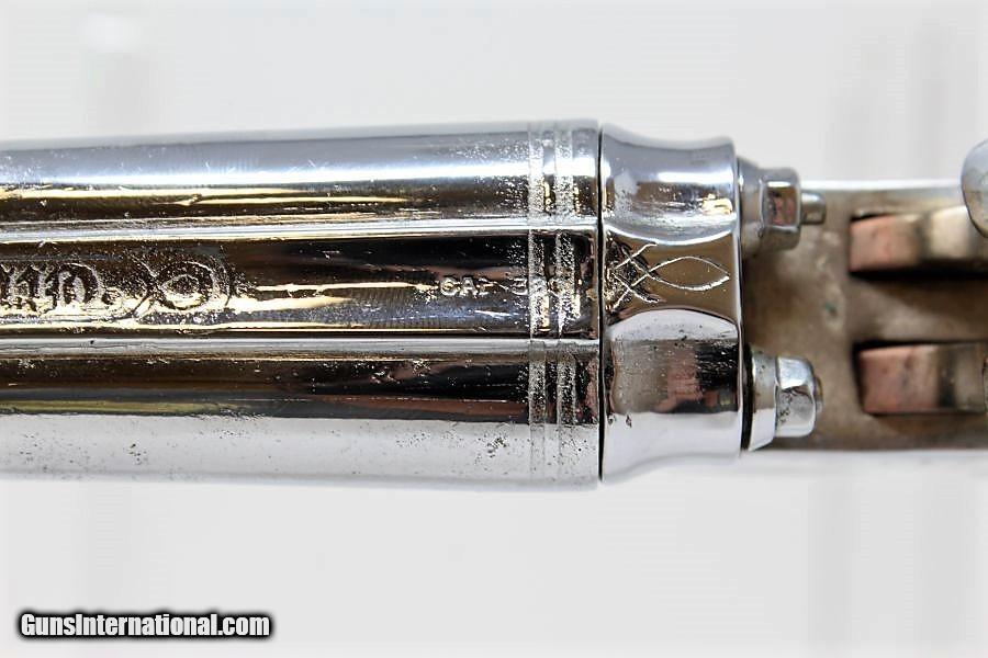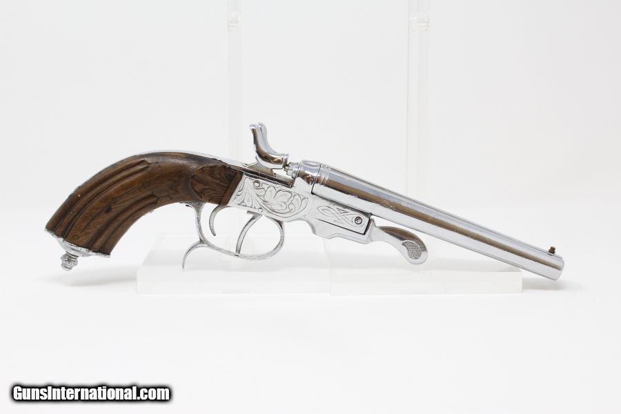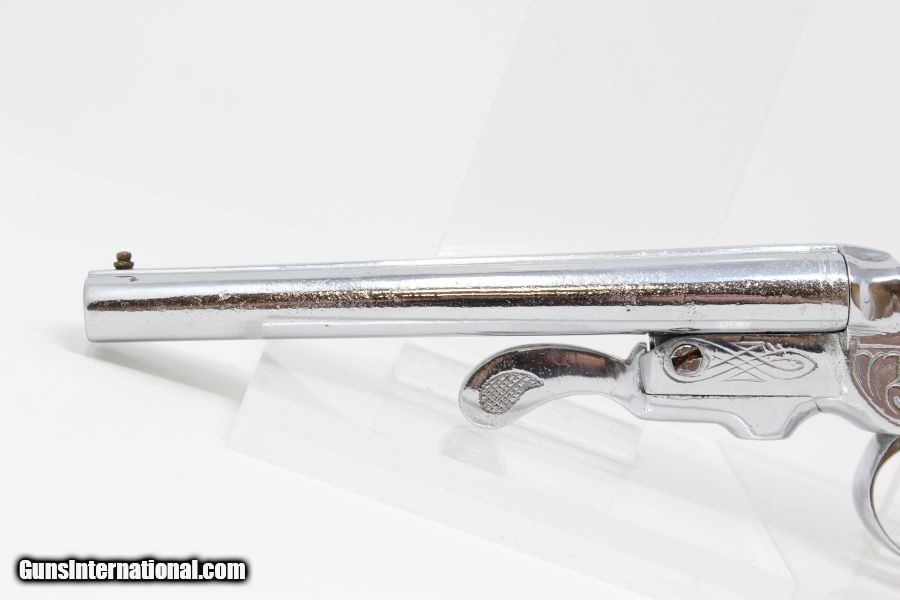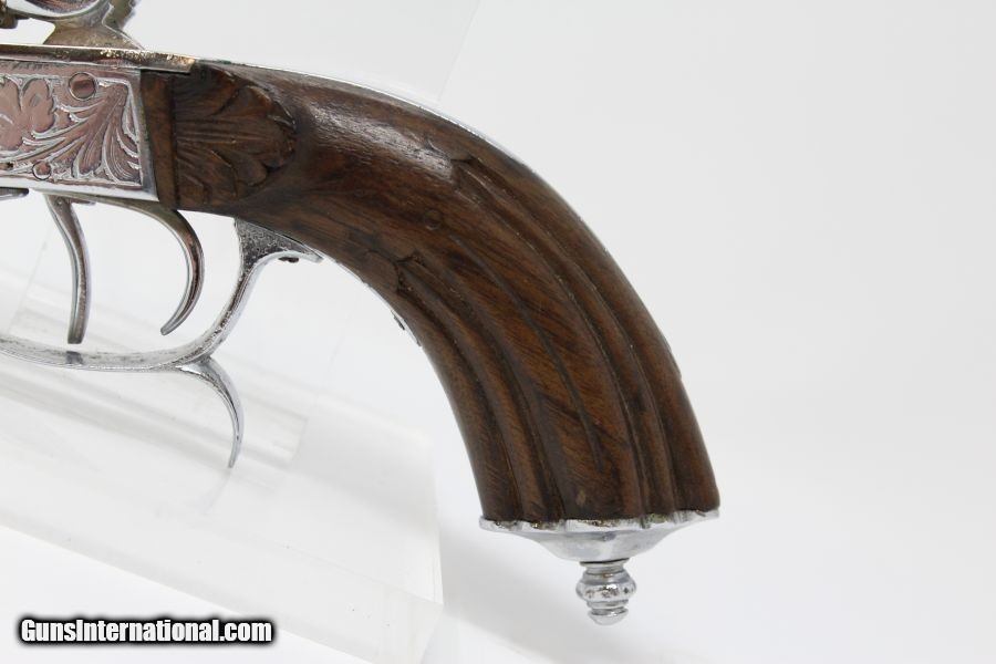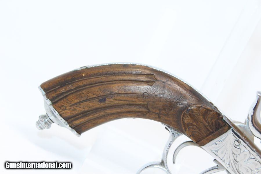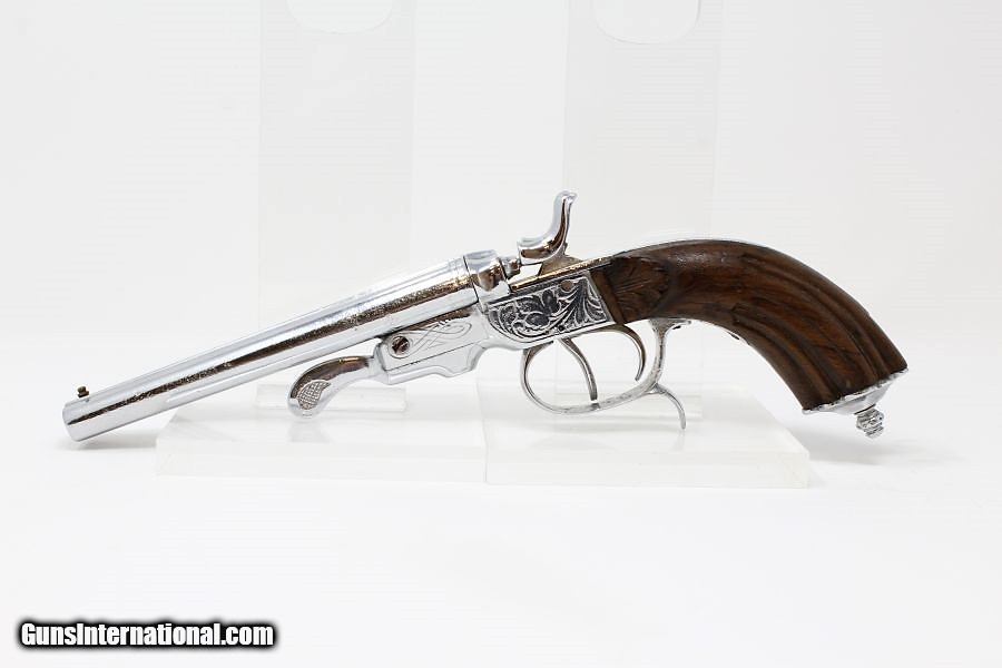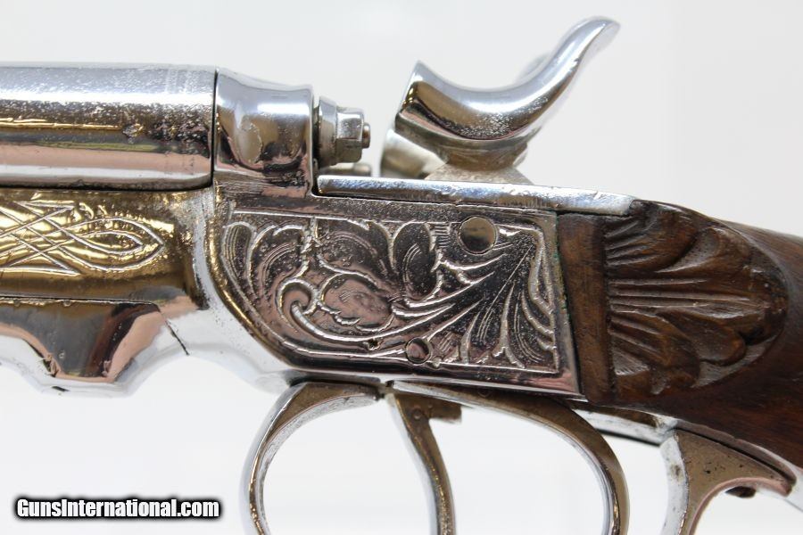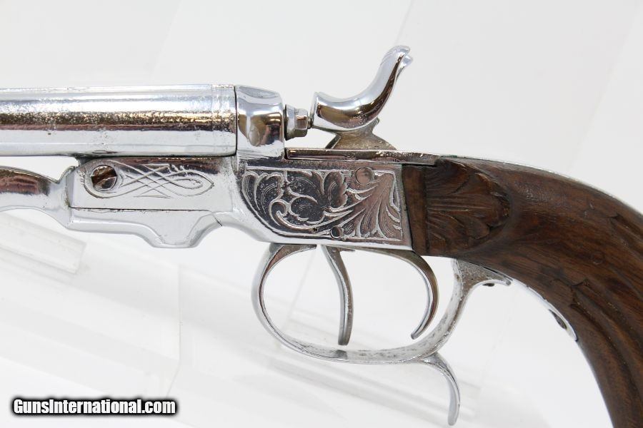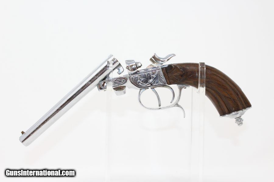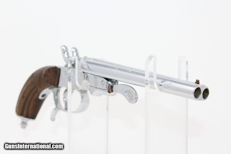 Description: Engraved Belgian DOUBLE BARREL SxS .380 Pistol Late 19th early 20th Century Self-Defense Pistol Here we present a nicely engraved Belgian made Double Barrel, Side by Side pistol, made circa 1893 to the early 1900s in Liege, Belgium. This little pistol was made for self-defense and would have provided two shots of .380 caliber. The metal has nice engravings along with an engraved grip. The barrel rib is marked “CAL .380” and there are Liege proof marks throughout and under the barrels. The overall condition is good. The later nickel finish is 98% complete. The markings are legible. The walnut grips are in great shape. The bores are clear. The action on this pistol is fair. The hammers/triggers do function, though the left mainspring is weak while the right is quite strong. This firearm is classified as a Curio & Relic. Barrel is 5-1/2 inch. Caliber: .380 Revolver Overall condition as seen in photos. Very Fast. Very Safe. FREE SHIPPING. Will need to be sent to your local FFL or C&R licensee. This firearm is classified as a Curio & Relic. Guaranteed AUTHENTIC & Includes CERTIFICATE OF AUTHENTICITY. ancestryguns $635 #8448 SOLD Curio/Relic: Yes |