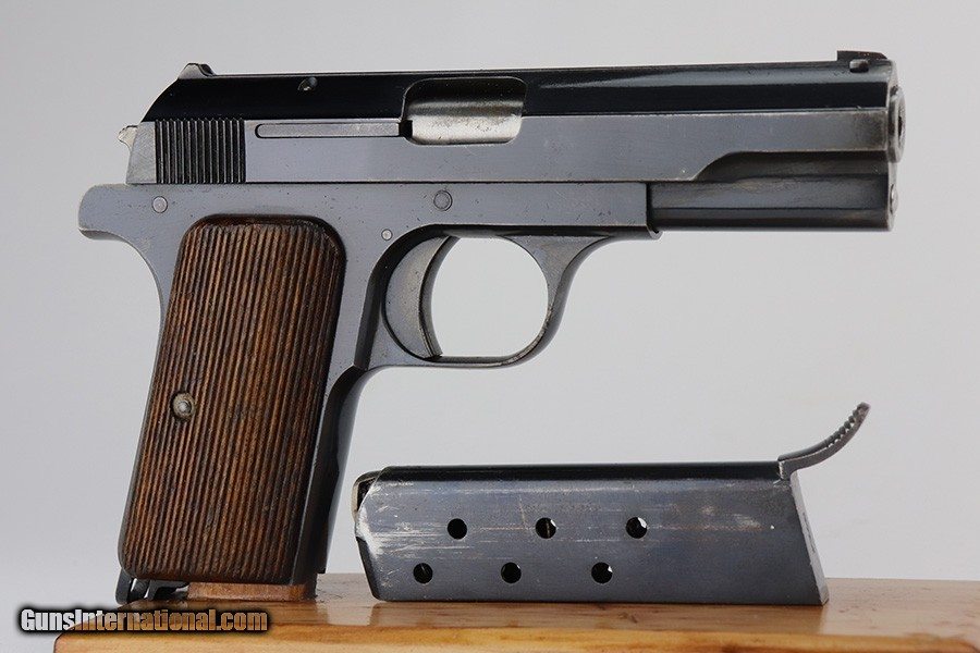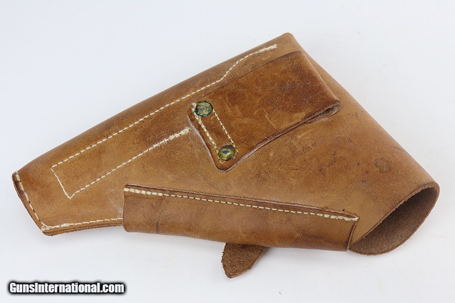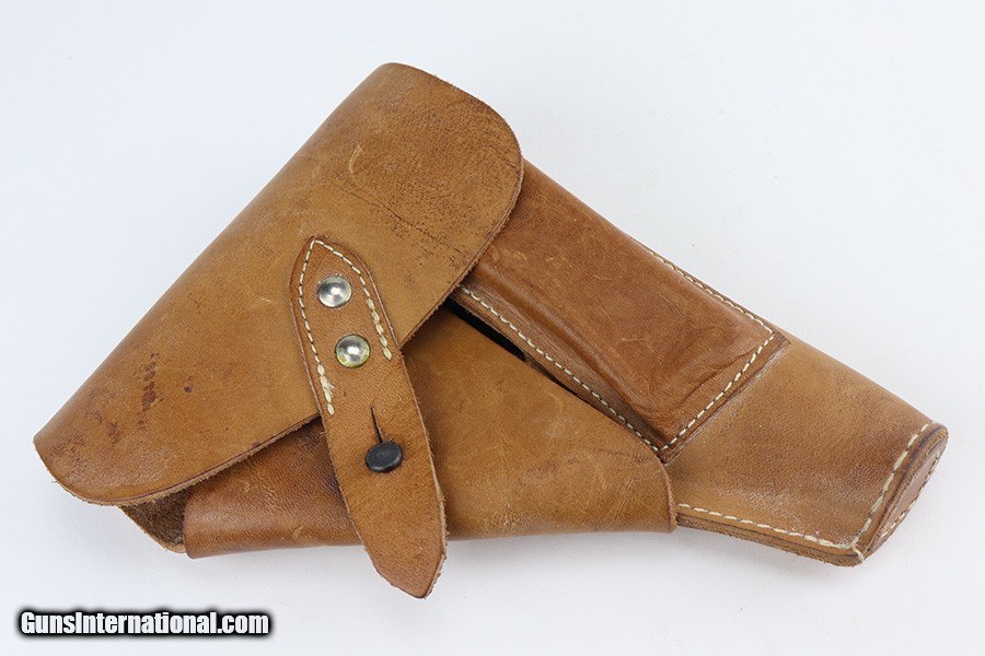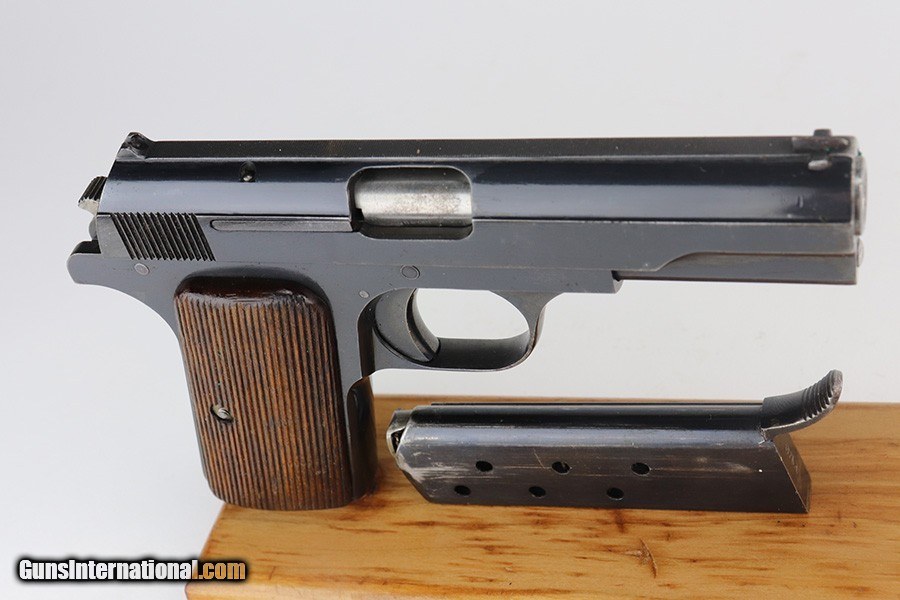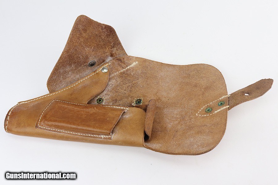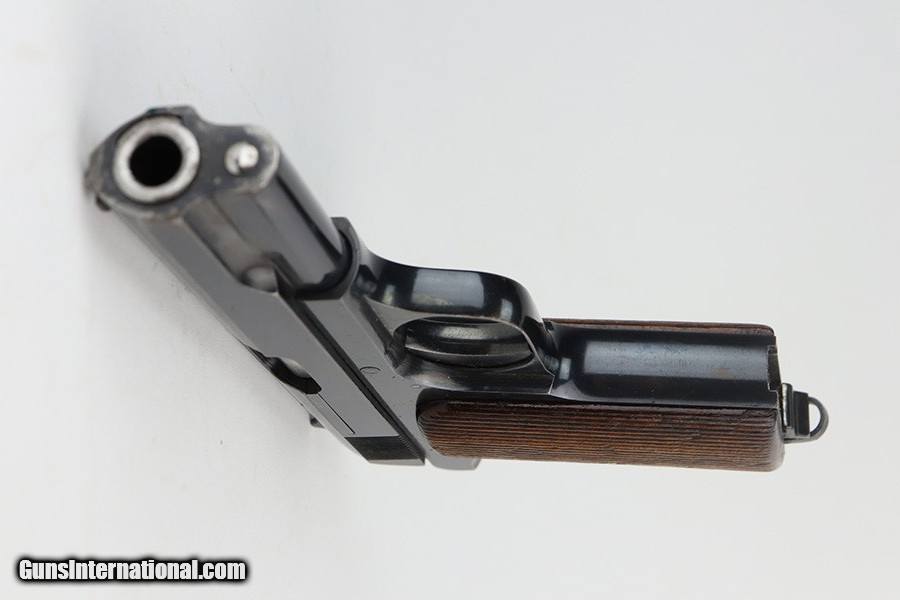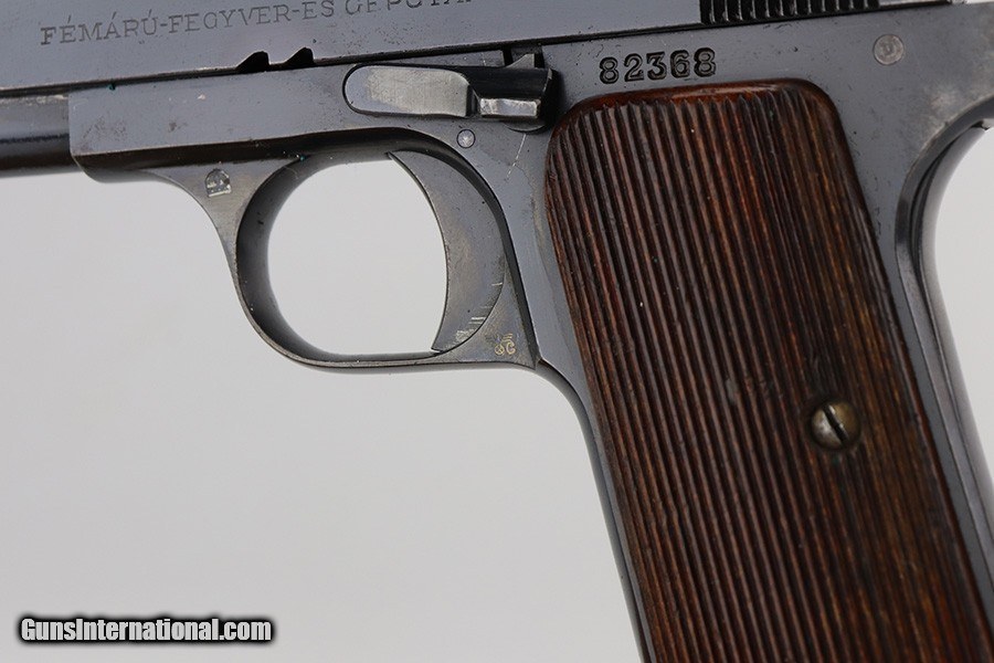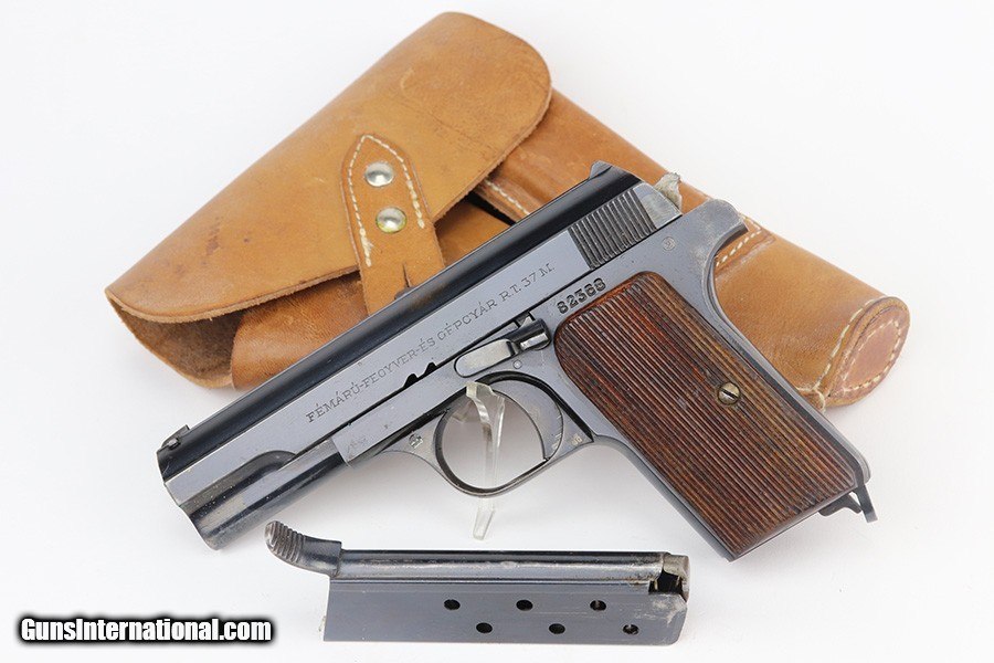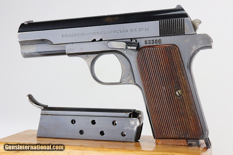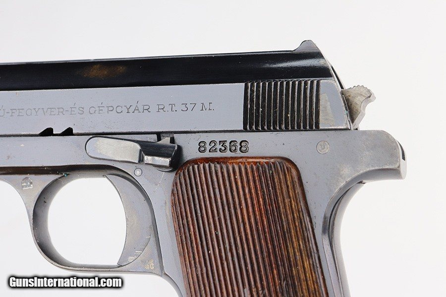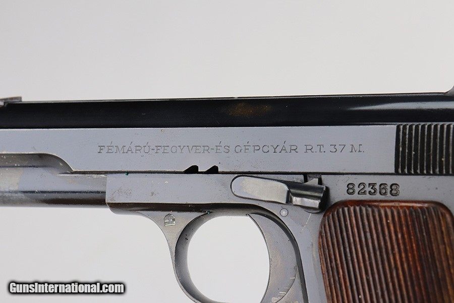 Description: This is an excellent example of a Pre-WW2 Hungarian Femaru Model 37 rig. It is matching and has the proper Hungarian proofs. It also has a Nazi-era police "Eagle C" marking on the trigger guard. The marking looks correct but we couldn't find any documented examples so likely not correct. The rig comes with one period-correct magazine and a generic holster that fits the gun. The gun has retained about 97% of its original high polish finish. There are areas of minor wear around the muzzle, straps, and tang. An area of light patina on the top of the slide. Excellent grips. The bore has fairly weak rifling with minor pitting throughout. SOLD Handgun Caliber: .380 ACP (9x17mm Browning Short) Bore: 6/10 Condition: ~97% |