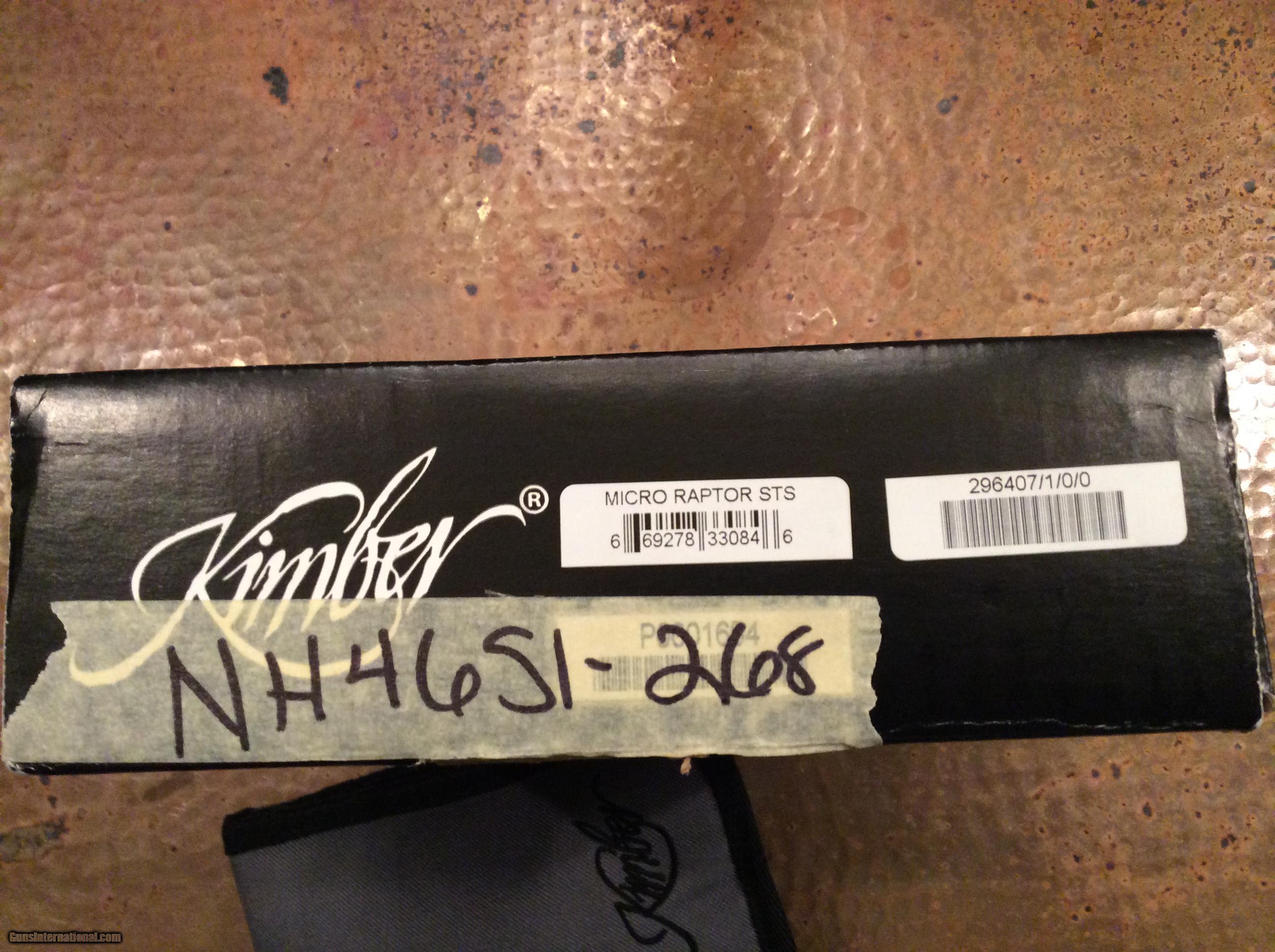 Description: KIMBER MICRO .380 Stainless Raptor. New/unfired/unhandled in box and case with all accessories and paperwork. I'm not a dealer and will only ship to a FFL License Holder. Shipping is $25. If shipped to California add $50 more for paperwork. For questions call 307 587-7845. SOLD Manufacturer: Kimber Model: Micro 380 Stainless Raptor Serial Number: POOO1654 Caliber Info: .380 Condition: New Metal Condition: New Wood Condition: New Bore Condition: New Sights: Night |