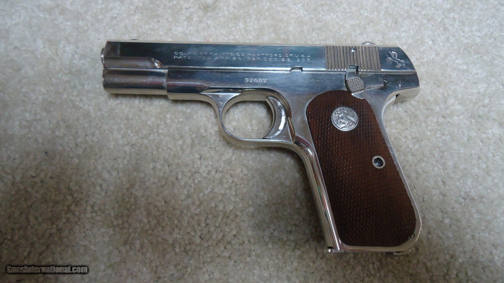 Description: RARELY SEEN AND HIGH CONDITION 1908 POCKET HAMMERLESS .380 ACP IN FACTORY NICKEL FINISH, #92007 (JUST THE NUMBER FOR JAMES BOND’S GRANDFATHER!), MADE 1928. The .380 auto was made from 1908 to W.W.II in much fewer numbers than the more popular Model 1903 .32 ACP pistol. They now seem so popular with collectors and shooters that finding one today is difficult. Nickel finish was an extra option that was rarely ordered and nickel examples now are seldom encountered. This one retains nearly all the original bright nickel with only a tiny scuff or two that you’d have to look carefully to notice. All markings are sharp and clear and the correct checkered walnut grips with Colt medallions are sharp and excellent. It retains the original Colt marked magazine, tight mechanically with exc. bore. Comes with an equally rare “Audley patented Oct. 13, 1914” marked leather holster with metal spring clip on the inside to hold the pistol firmly in place. Only the belt loop is missing from the back of this exc. condition and very scarce holster. Overall, a great set from the last days of the Roaring Twenties which ended with the Stock Market Crash of 1929 and the Great Depression which followed. SOLD Curio/Relic: Yes Manufacturer: COLT Model: 1908 POCKET HAMMERLESS .380 AUTO Serial Number: 92007 Caliber Info: .380 ACP Condition: Excellent Finish: NICKEL |