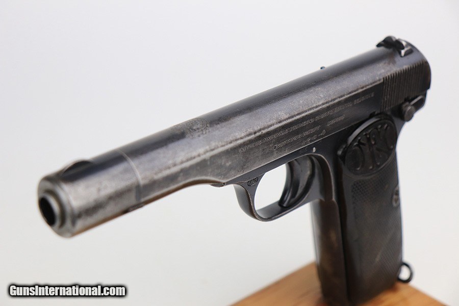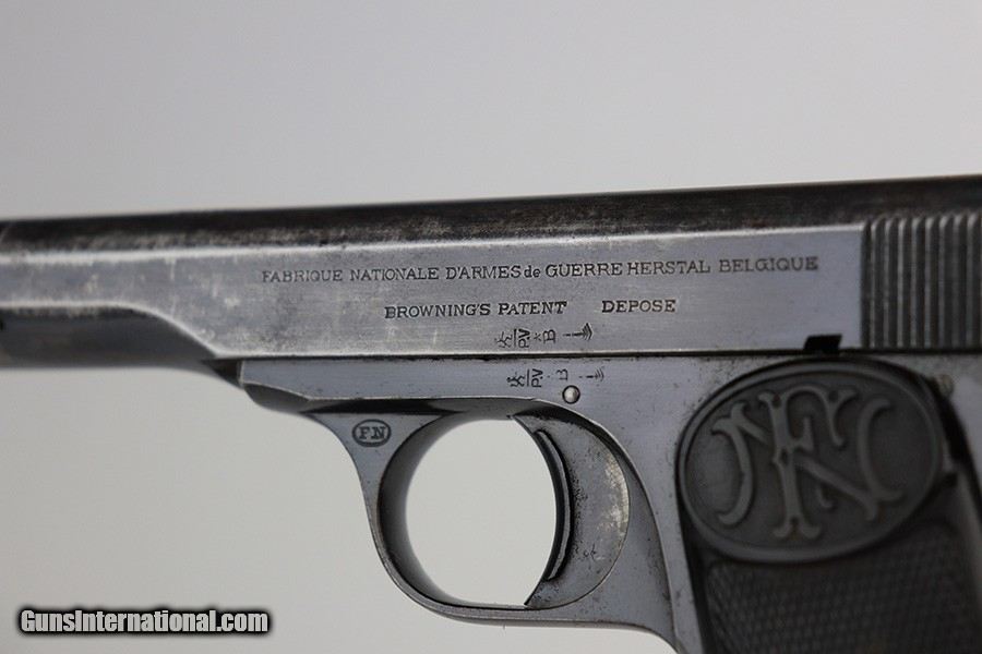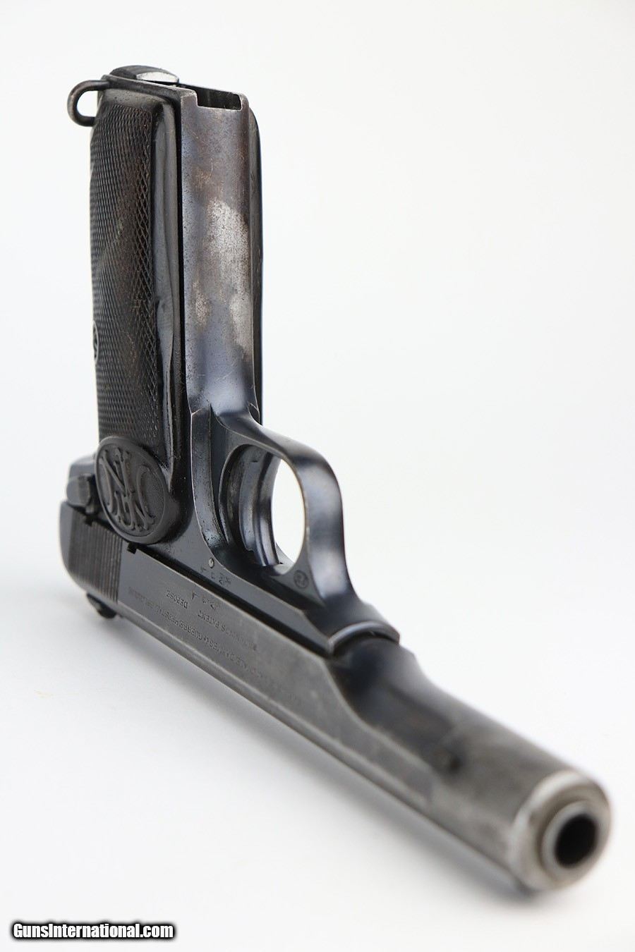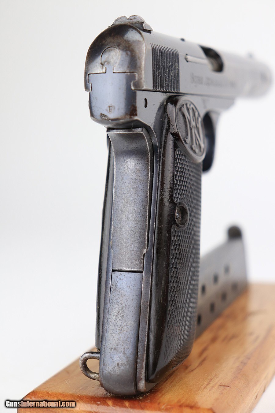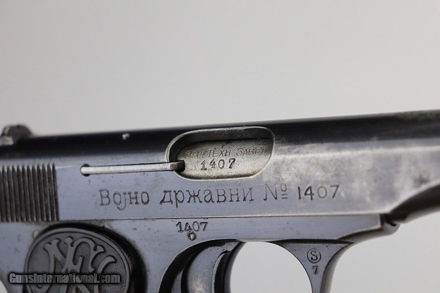 Description: This is a scarce FN Model 1922 that was part of a Yugoslavian military contract order. It has a low serial number, likely dating it to the 1920s. The right side of the slide features an inscription indicating Yugoslavian Army State issue, and the top of the slide features the Yugoslav crest as applied to all Army State and Officers' pistols. The gun is all matching and original but shows obviously thinning in several areas. Original grips show some smoothing and handling wear but no cracks or chips. Bore has good rifling but some frost and freckling in the grooves. Comes with an unmarked holster. SOLD Curio/Relic: Yes Handgun Caliber: .380 ACP (9x17mm Browning Short) Bore: 7/10 Condition: ~60% |