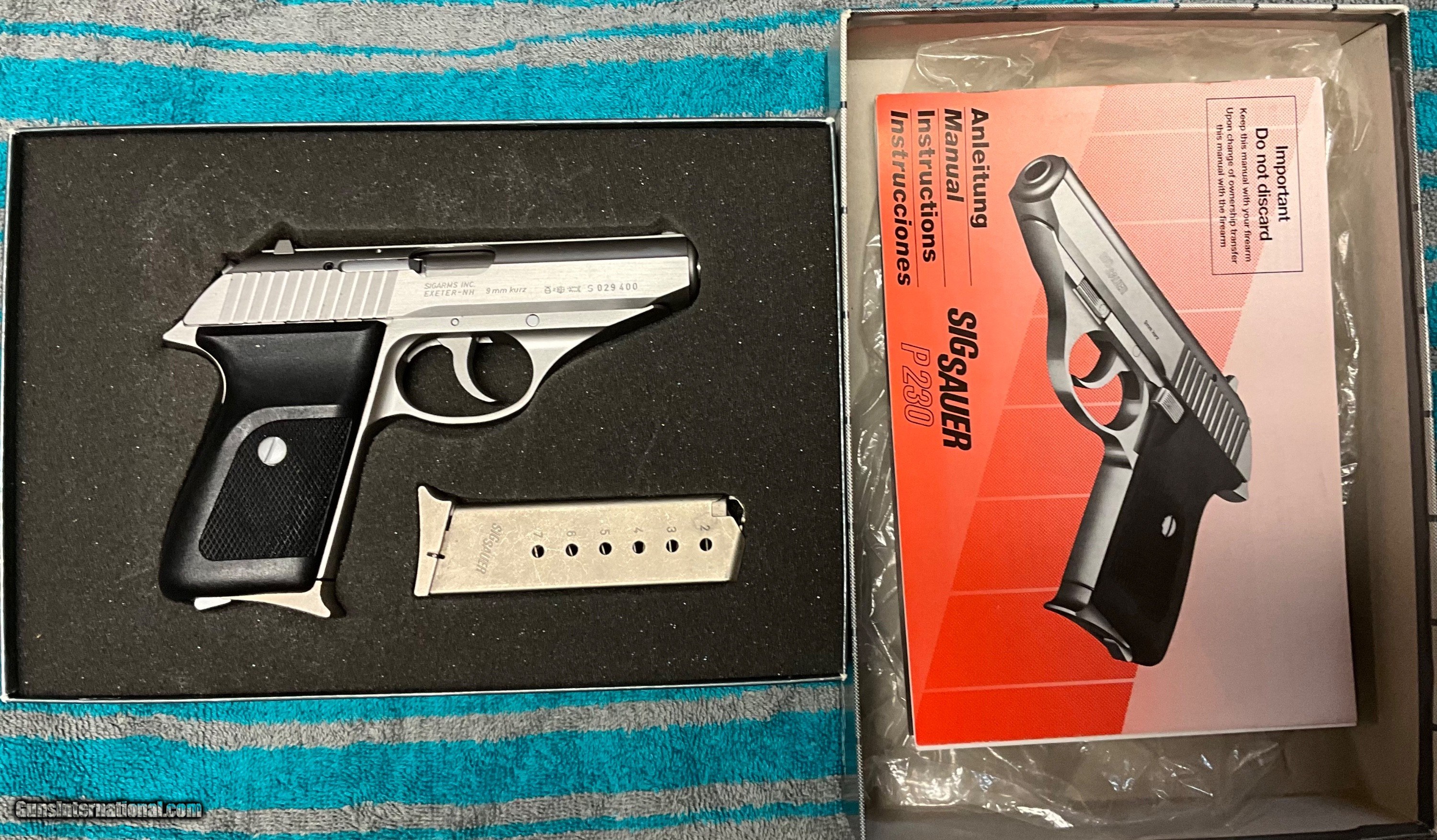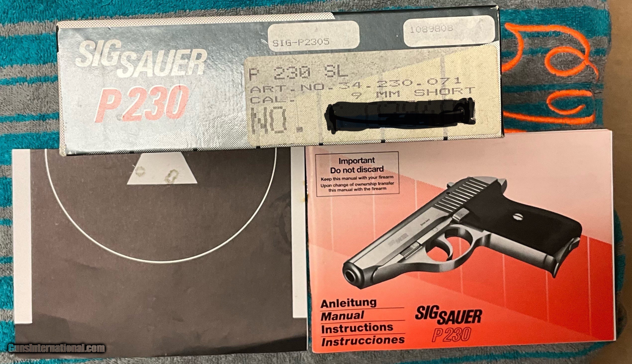 Description: PRICE REDUCED! $$$ AS NEW IN BOX SIG P230 SL (STAINLESS STEEL) MADE IN WEST GERMANY. PISTOL COMES WITH ALL ORIGINAL PAPERS, BOX AND ONE EXTRA MAGAZINE. BUYER PAYS SHIPPING AND INSURANCE TO YOUR FFL. THREE DAY INSPECTION. SOLD Handgun Caliber: .380 ACP (9x17mm Browning Short), .401 Herters PowerMag Manufacturer: Sig Sauer Model: P230 SL Condition: AS NEW IN BOX Metal Condition: 100% Bore Condition: 100% Action: Semi auto. |