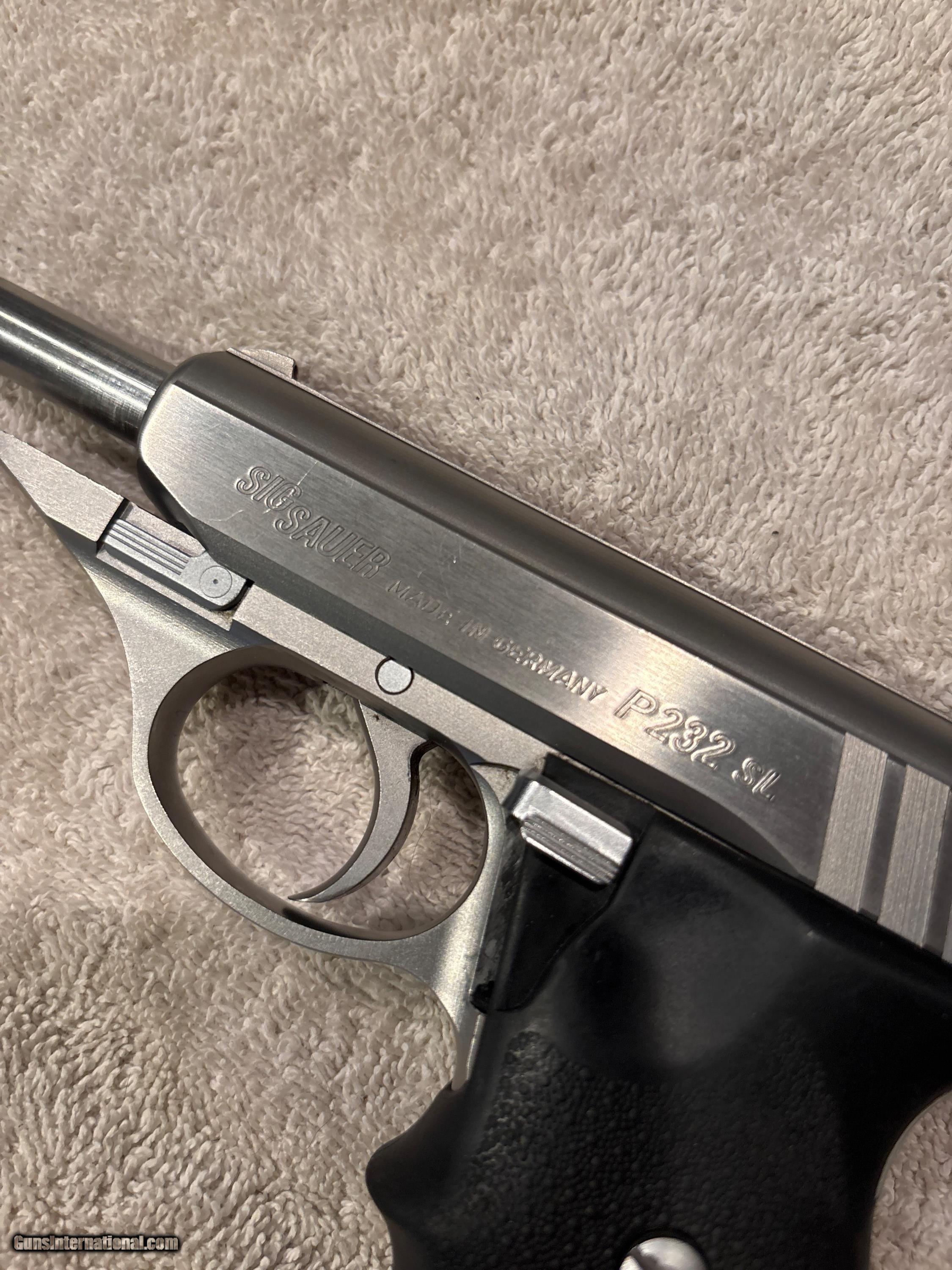 Description: Excellent shape Sig Sauer P232 SL .380 I purchased new 20 years ago. It has a very low round count and sat in a safe its entire life. Comes with box, 2 magazines, extra grips and manuals. Buyer is responsible for all shipping expenses SOLD Handgun Caliber: .380 ACP (9x17mm Browning Short) Manufacturer: Sig Sauer Model: P232 SL Serial Number: S254081 Condition: Excellent Metal Condition: excellent |