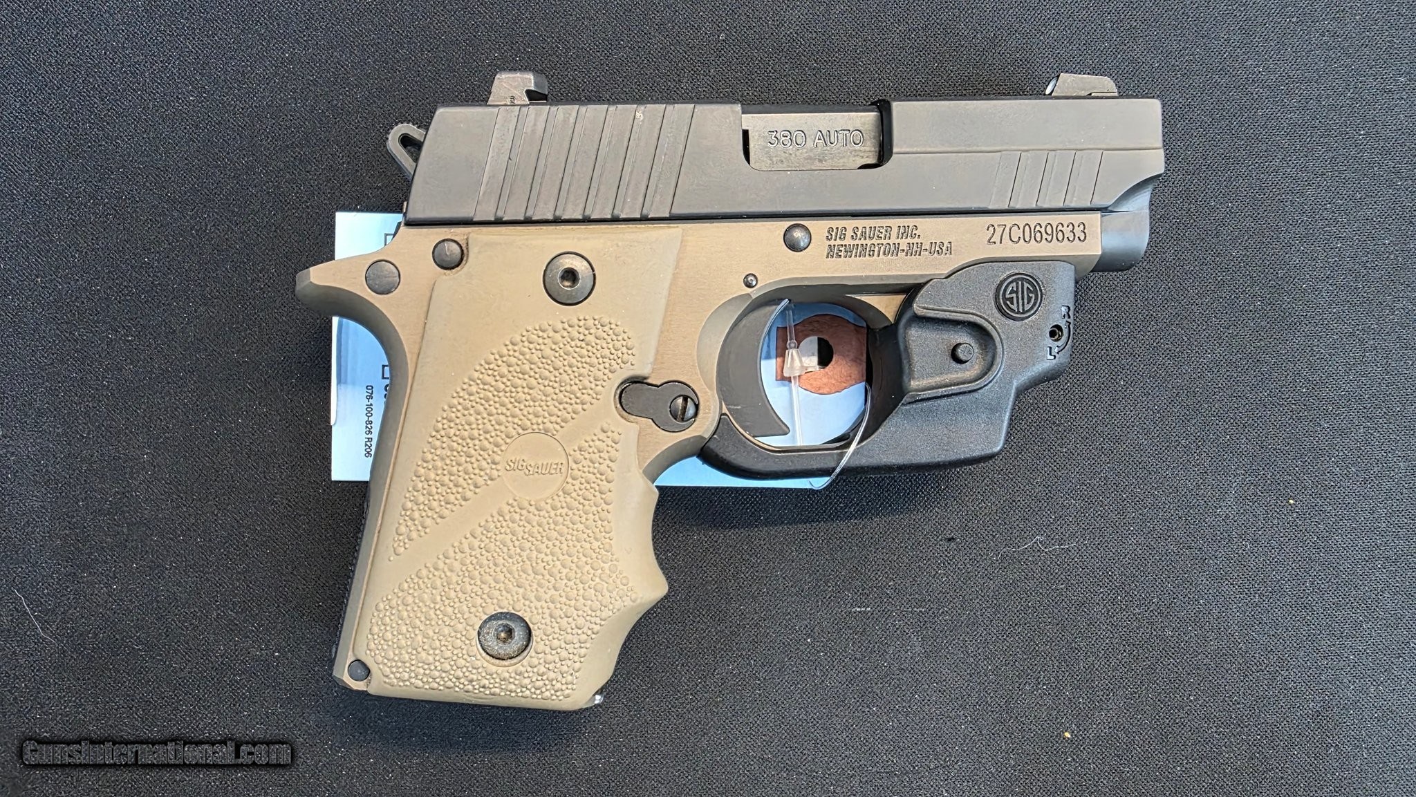 Description: Guns Listing ID: 613603 The Sig Sauer P238 Combat Pistol is the newest addition to Sig Sauers line of P238 pistols. Chambered for 380 Auto and featuring a two-tone, flat dark earth (FDE) finish, and a custom one-piece wraparound Hogue FDE rubber grip, the P238 is the ultimate firepower in an all metal frame concealed handgun. The Sig Sauer Lima38 Laser provides rapid, accurate target acquisition, resulting in the ideal sighting solution for self defense, conceal carry and home defense. The Lima38 is compatible with any Sig Sauer P238 and P938 pistol. This P238 ships with the original box. Manufacturer: SIG SAUER Model: P238 COMBAT Caliber Info: .380 ACP Condition: Used - Non-Certified Barrels: 2.75" BARREL Action: SEMI AUTOMATIC Finish: coyote tan Price: $749.99 Contact Seller |
