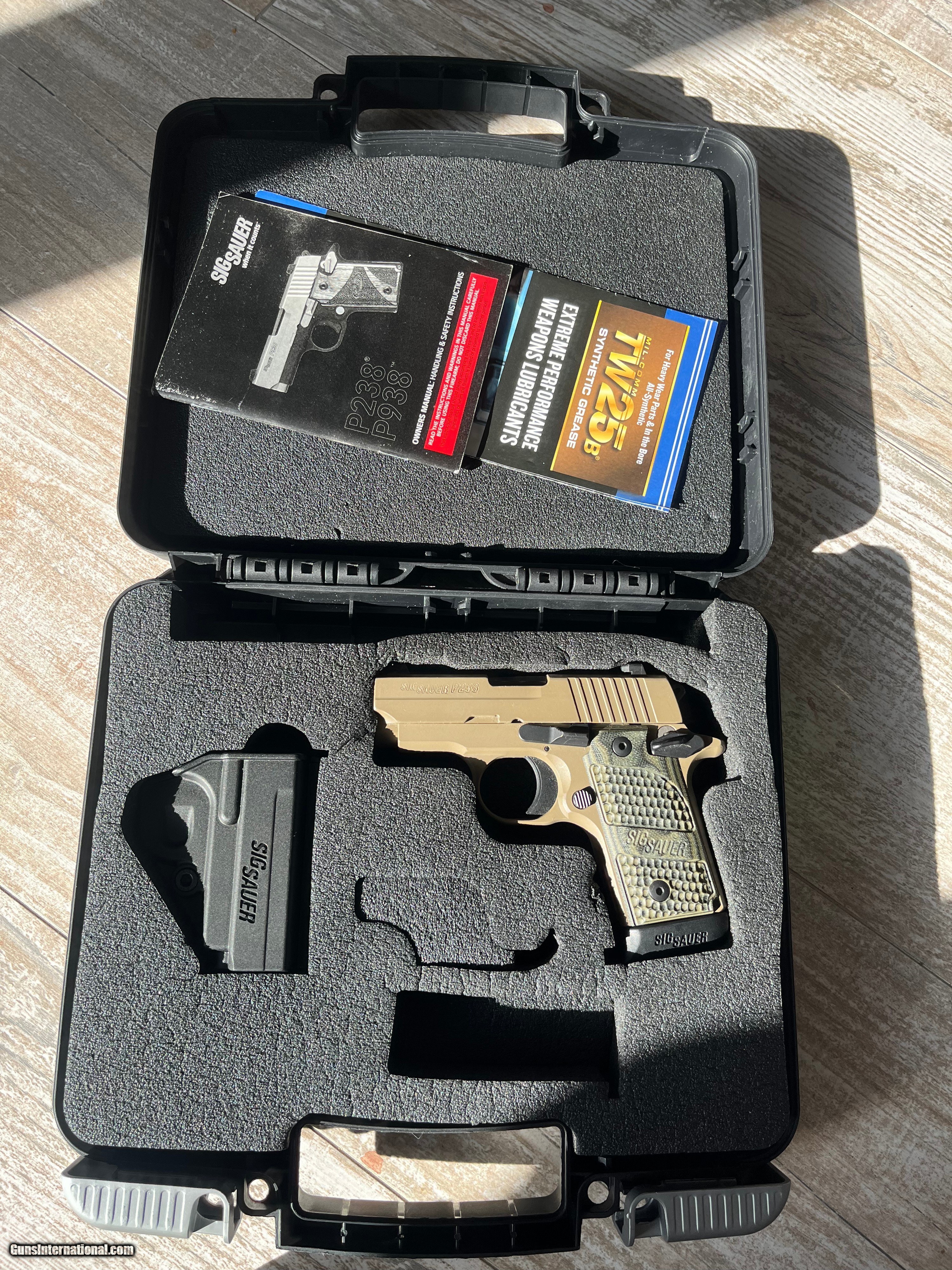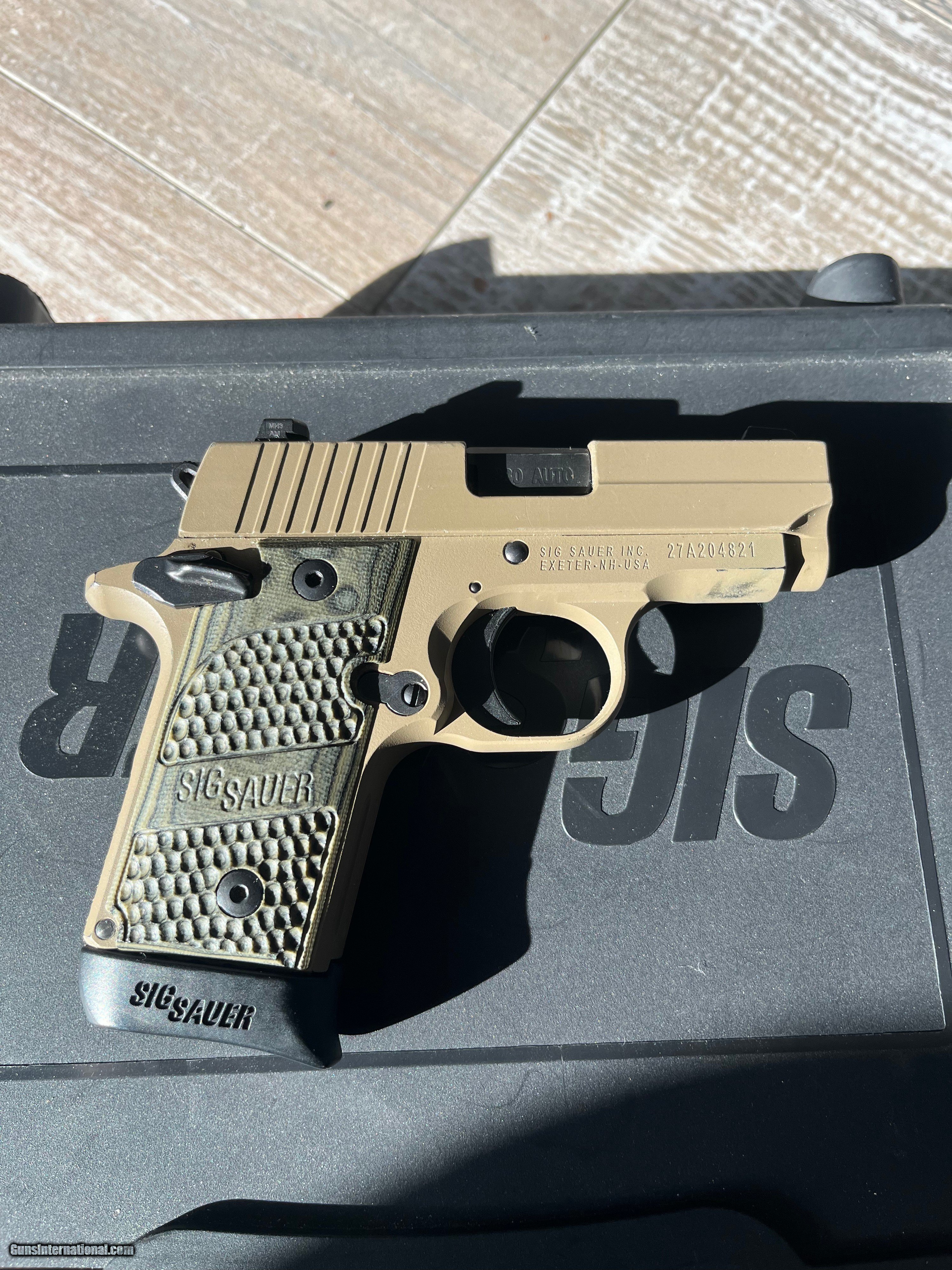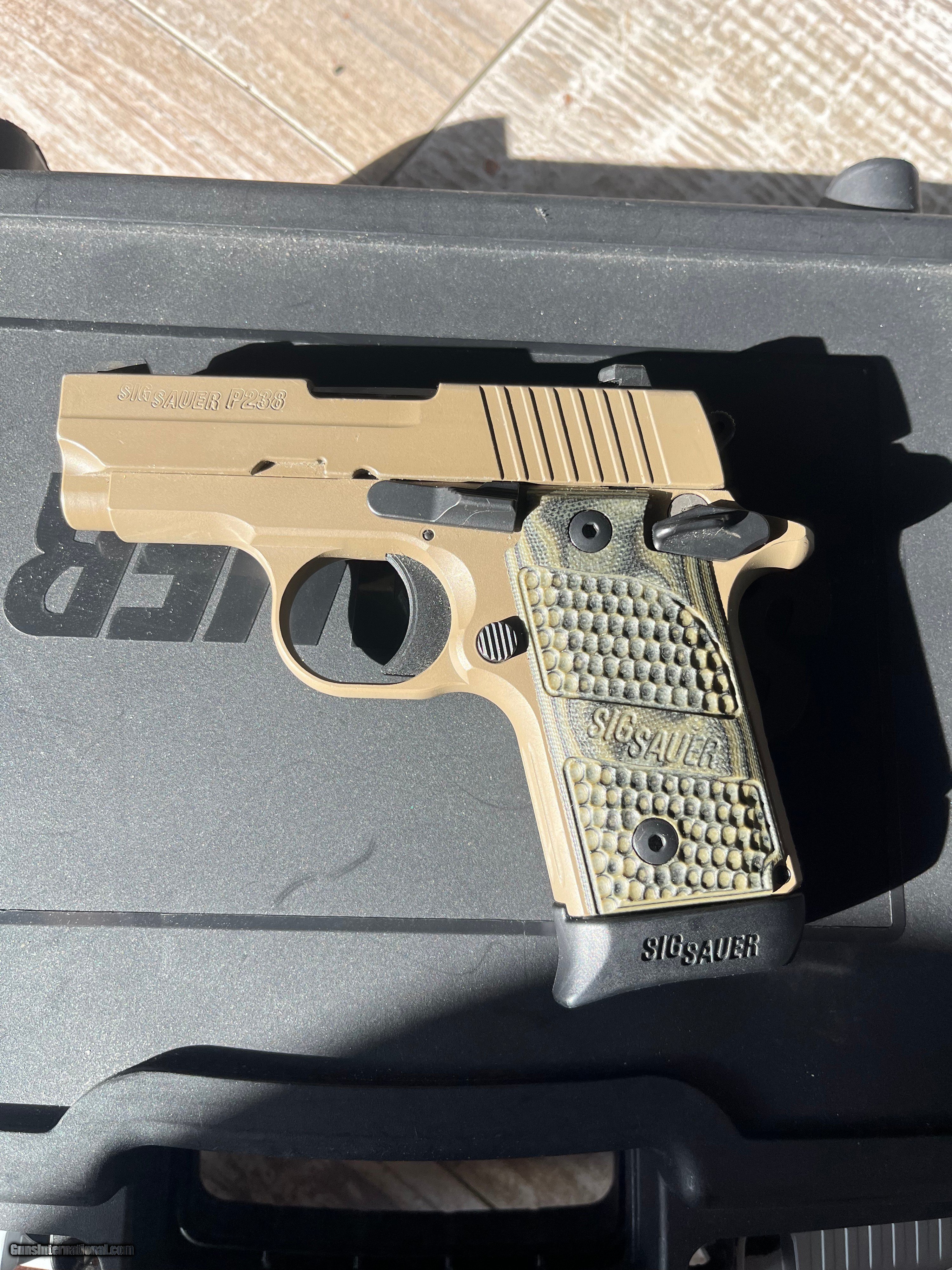 Description: Excellent condition Sig Sauer P238 Scorpion. Barely used and verified accurate shooter. 6 round and 7 round mag with original case included. Coyote Cerakote Steel Slide and Alloy Frame. Custom G10 Grips from HOGUE. SIGLite Night Sights. Only one owner. Call Tom at 501-366-7254. SOLD Handgun Caliber: .380 ACP (9x17mm Browning Short) Manufacturer: Sig Sauer Model: P238 Condition: Excellent Metal Condition: Excellent Bore Condition: Excellent |