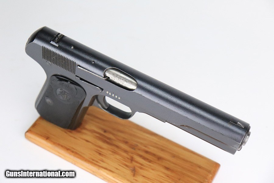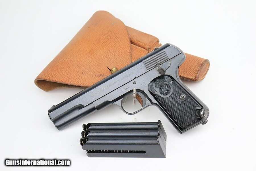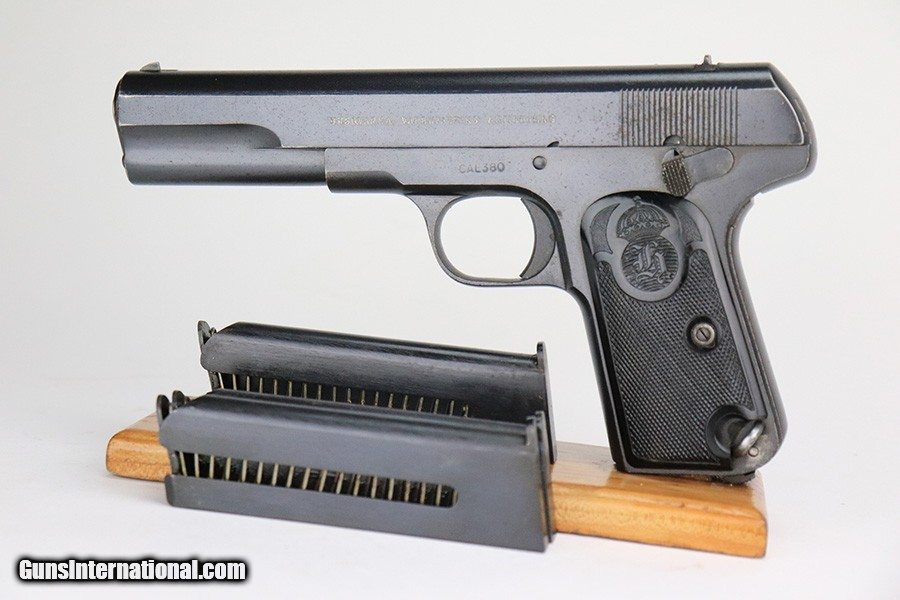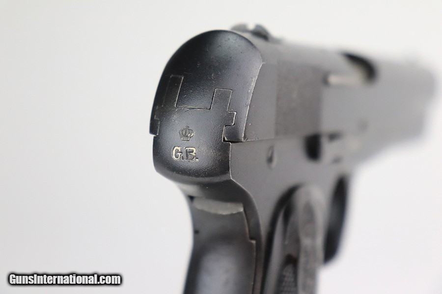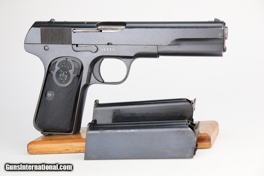 Description: This is a somewhat uncommon find, the Swedish Husqvarna Model 1907 pistol. The origin story on these handguns dates back to the early 1900s, as they were being produced by Fabrique Nationale under the designation of Model 1903. FN had been licensed to produced Browning’s .32 caliber pocket hammerless for the European market, while Colt had the U.S. rights, hence why this pistol looks like an oversized Colt M1903. Several countries reportedly wanted a larger service pistol on the same FN design that could accommodate the 9x20mm Browning Long cartridge, so FN lengthened the barrel to five inches, and added a slide stop on the right side of the frame. Sweden adopted the pistol as their military sidearm in 1907, and imported them from FN under the designation of Model 1907. FN then produced these pistols for Sweden until Germany captured their factory in 1914, and later Sweden procured licenses to produce them at the Husqvarna factory in 1917. This production continued until 1940, when the Lahti took over as preferred sidearm. Tucked away by the Swedish military, these pistols eventually hit the export market and many ended up in the states, such as the one listed here. They were then re-chambered to .380 ACP, and this one was likely imported before all firearms required import marks as none are present. This one is matching, has a Crown GB marking on the tang, and comes as a rig with a mint holster and three proper magazines. It has retained nearly all of its finish with hints of wear on the high edges and light freckling on the straps. Excellent black bakelite grips. Mint bore. SOLD Curio/Relic: Yes Handgun Caliber: .380 ACP (9x17mm Browning Short) Bore: Mint Condition: ~98% |