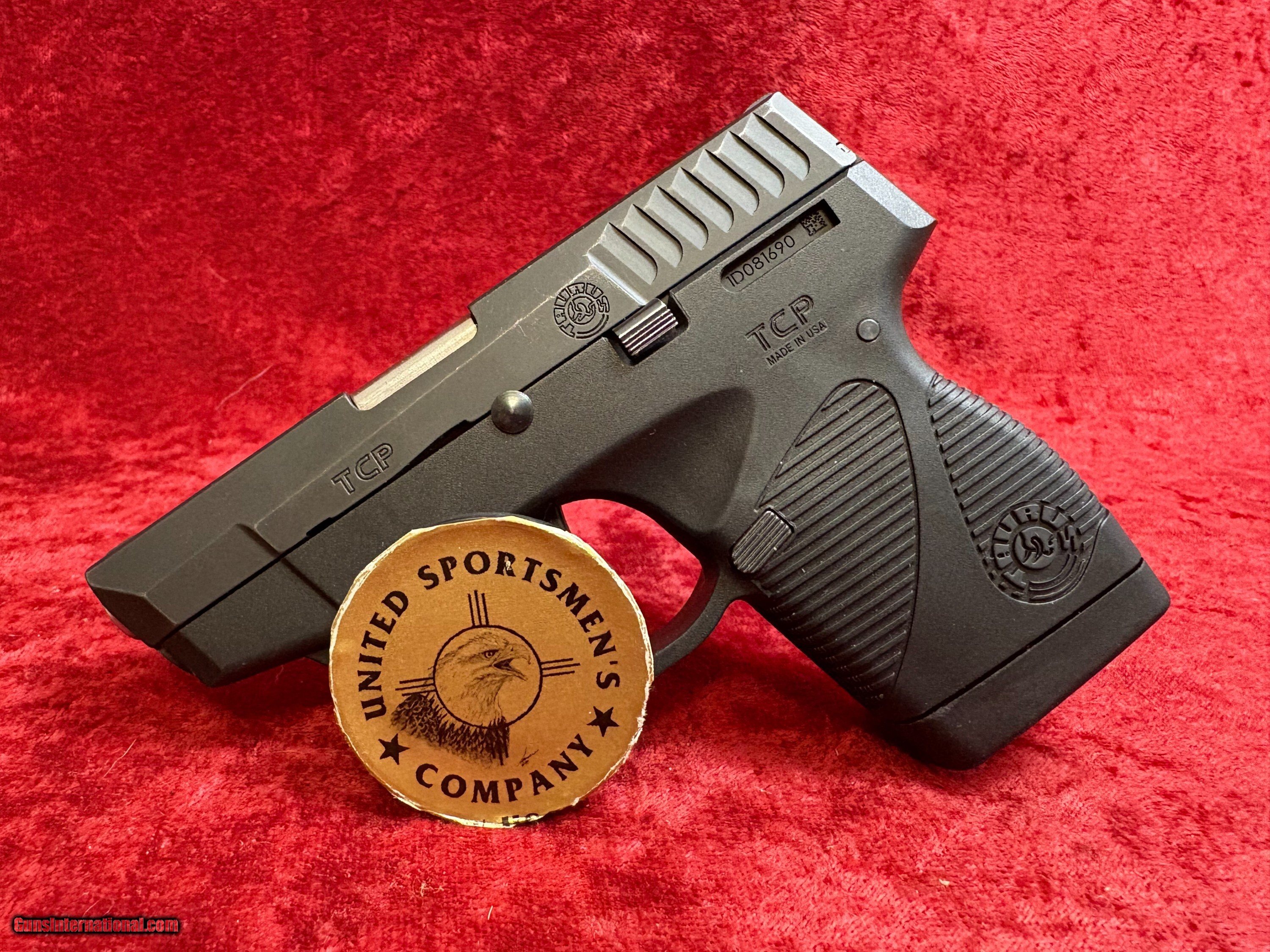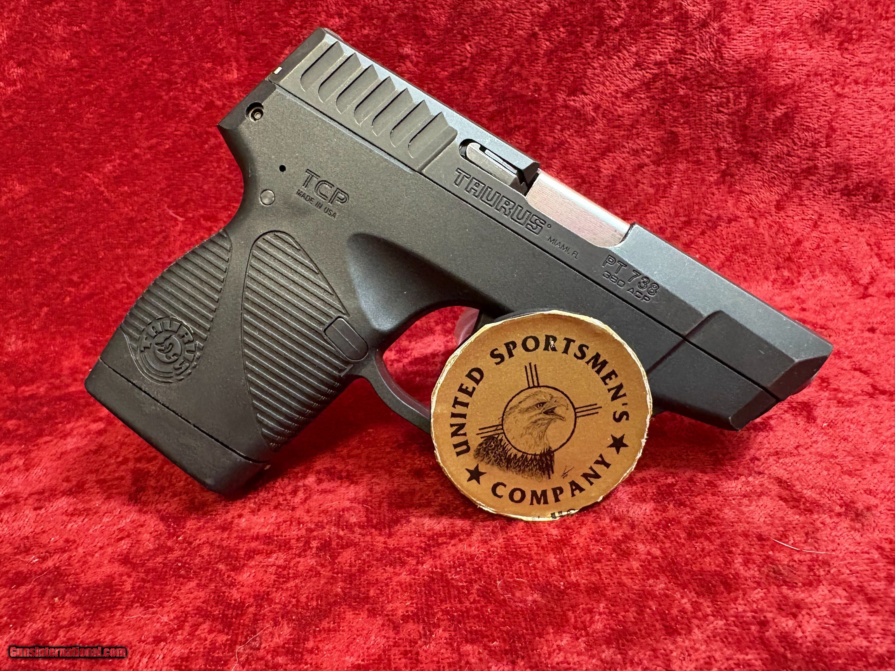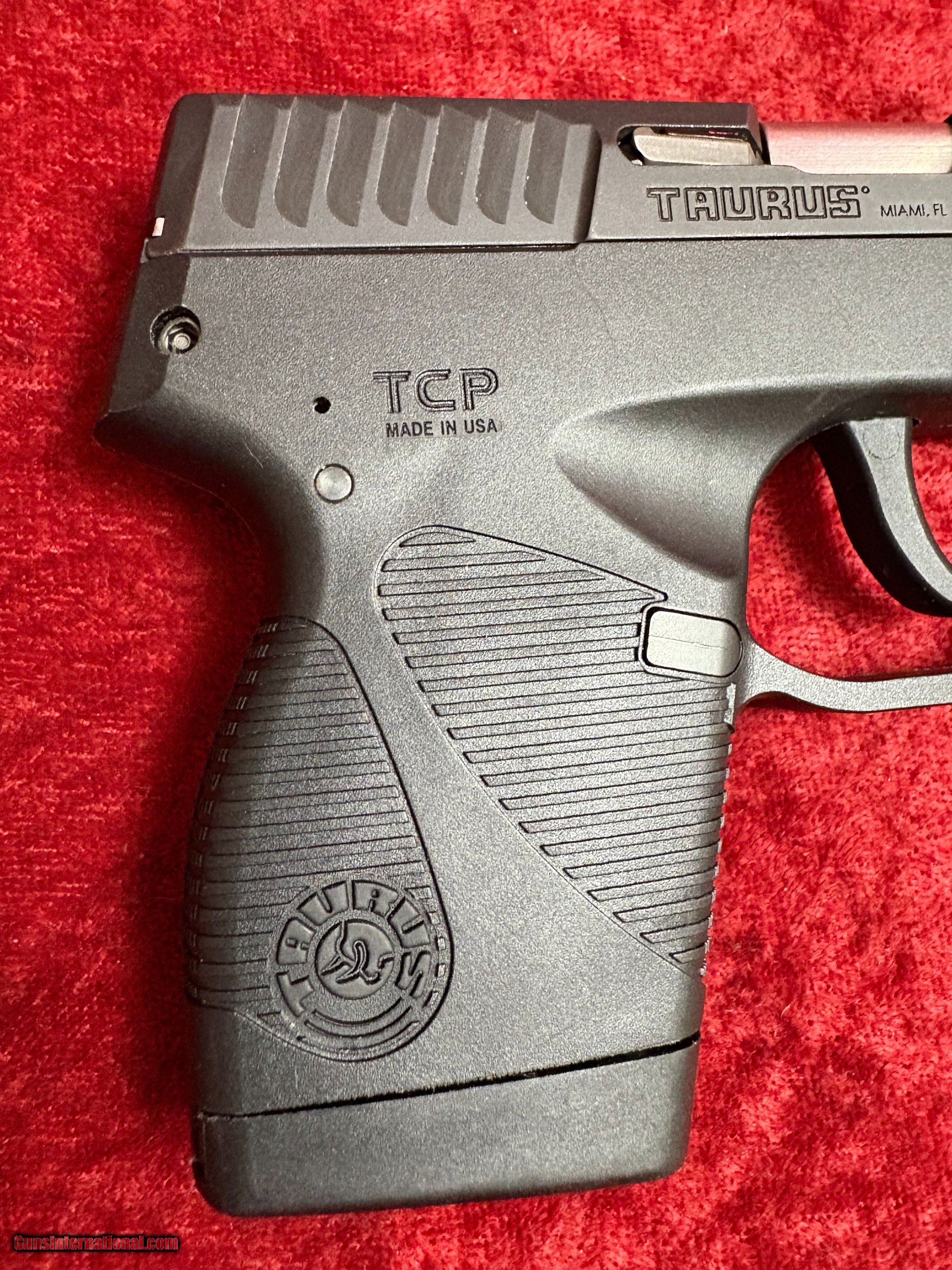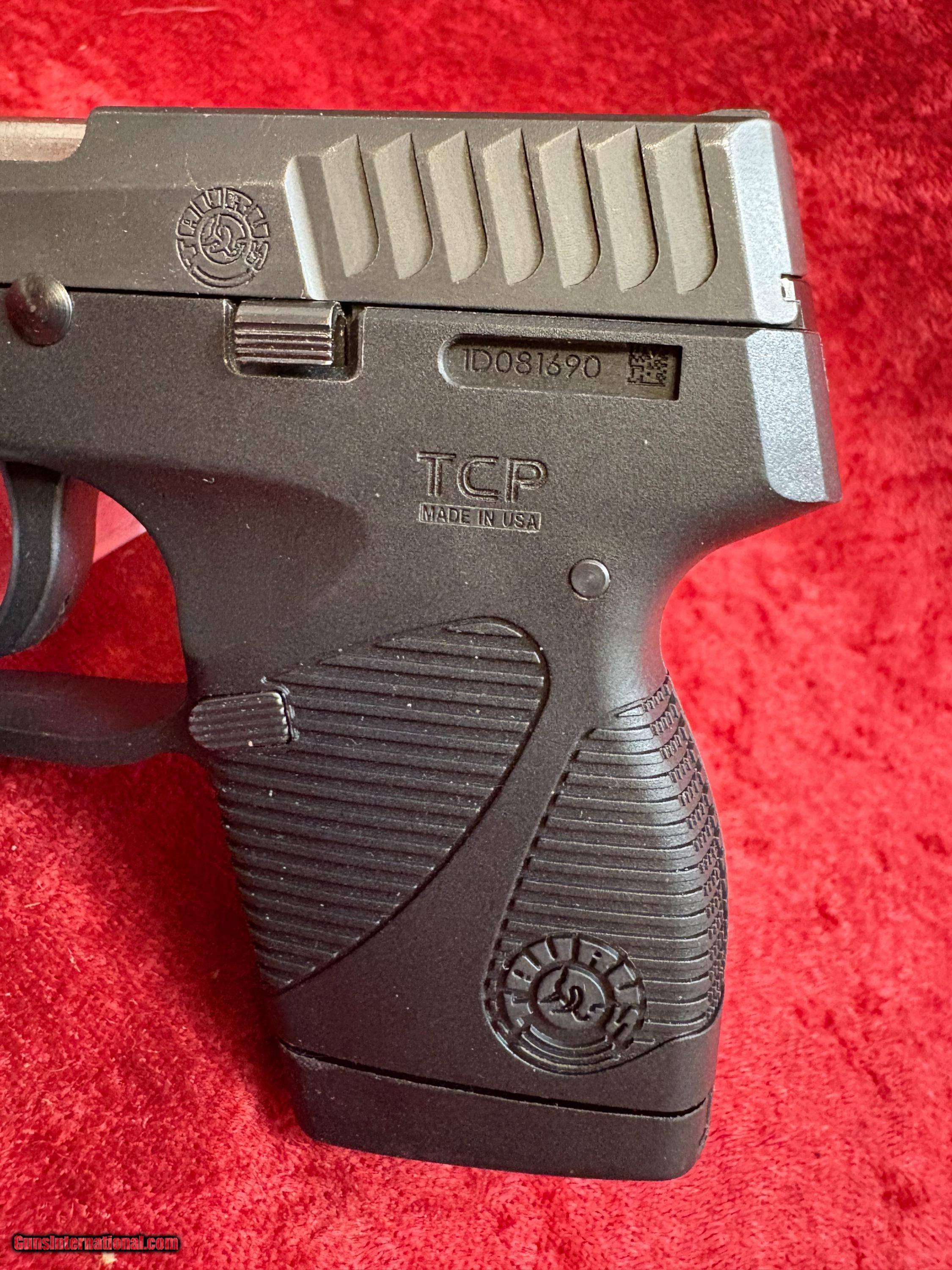 Description: Taurus TCP 738 .380 semi-auto pistol compact/conceal carry Great compact conceal carry pistol!! Given the pluses and minuses of a small gun, the TCP is actually a pretty impressive representative of the genre. It is a double-action-only, locked breech, modified Browning semiautomatic similar in size and appearance to the Ruger LCP and Kel-Tec P3AT. The 3.25-inch long barrel is stainless steel with six lands and grooves, and integral to the barrel is the feed ramp, which is slightly polished to improve feeding. This used pistol appears to be unfired, and shows light handling marks from storage and handling. Please see pictures of actual pistol you will receive. Comes with (1) mag. NO paperwork or box.