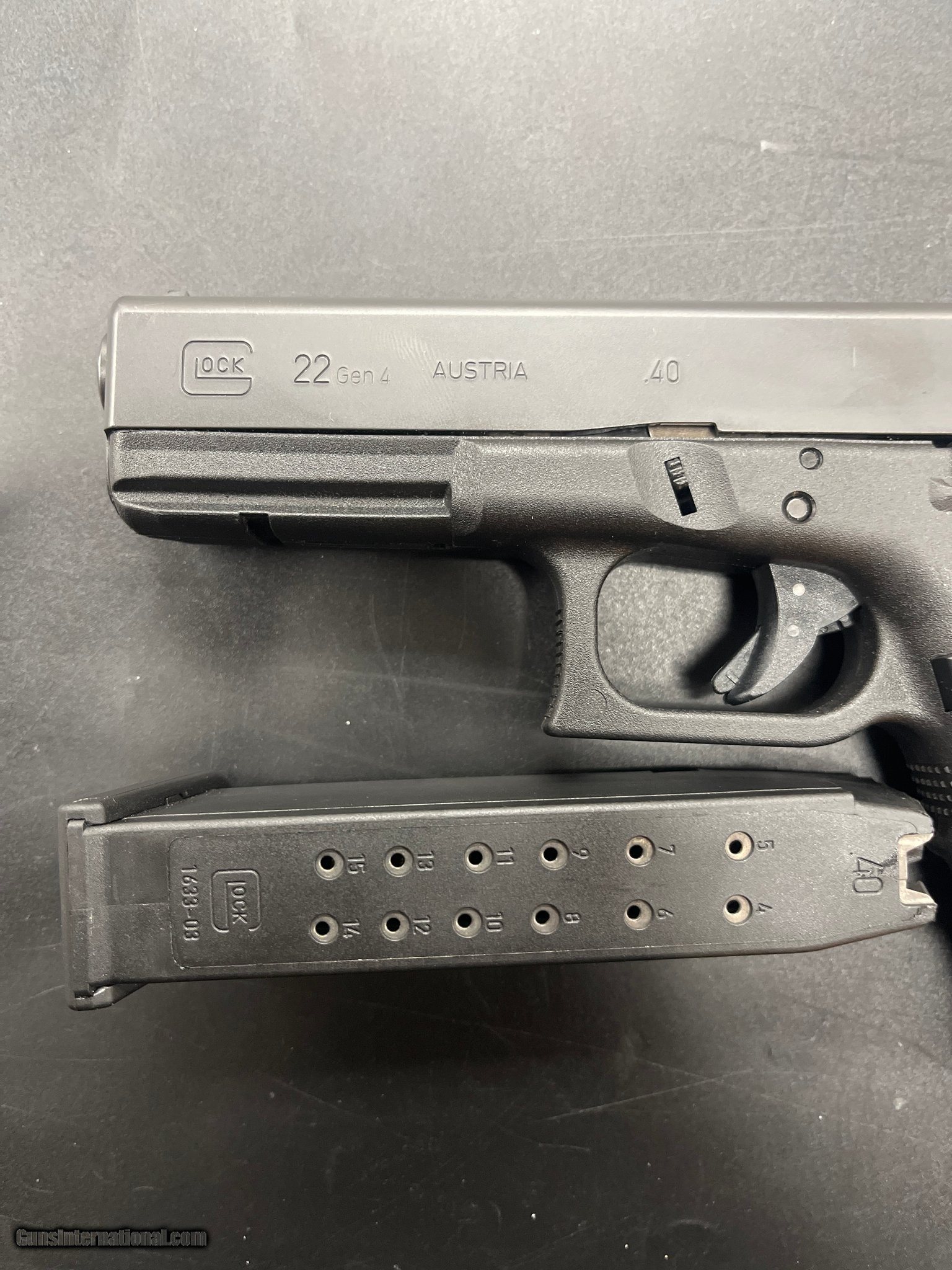 Description: Guns Listing ID: 588878 Original hard case Three magazines L165158A SOLD Manufacturer: GLOCK Model: G22 Gen 4 Caliber Info: .40 CALIBER Condition: Used - Non-Certified Barrels: 5" BARREL Action: SEMI AUTOMATIC |