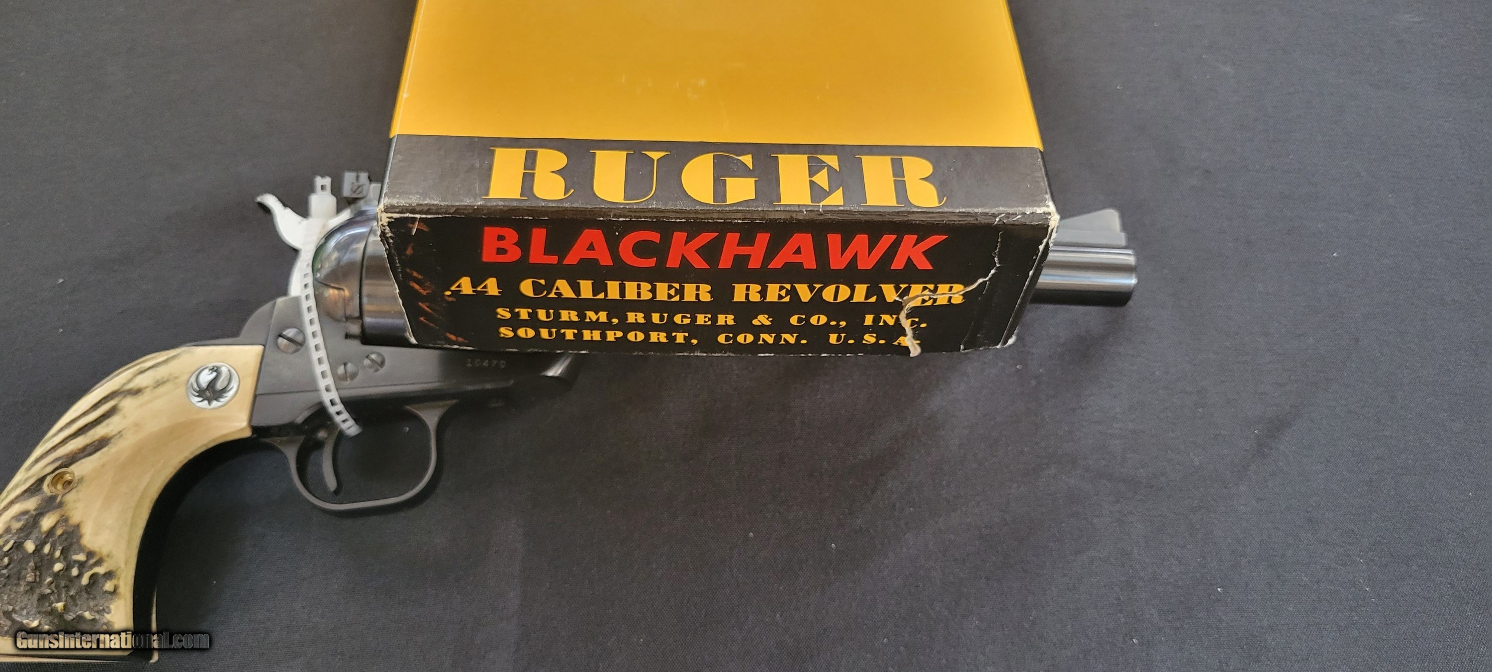 Description: Beautiful new in box ruger Blackhawk in 44 magnum. Gun was made in 1959 and is early 3 screw flattop edition with rare factory stag grips. This gun has the 6 1/2 inch barrel. Hurry this won't last. Comes with factory box and no other paperwork. Shipping $45 insured. Cc fee 3% SOLD Handgun Caliber: .44 Remington Magnum Manufacturer: Ruger Model: Blackhawk Barrel Length: 6 1/2 inch Condition: Lnib Manufacture Date: 1959 |