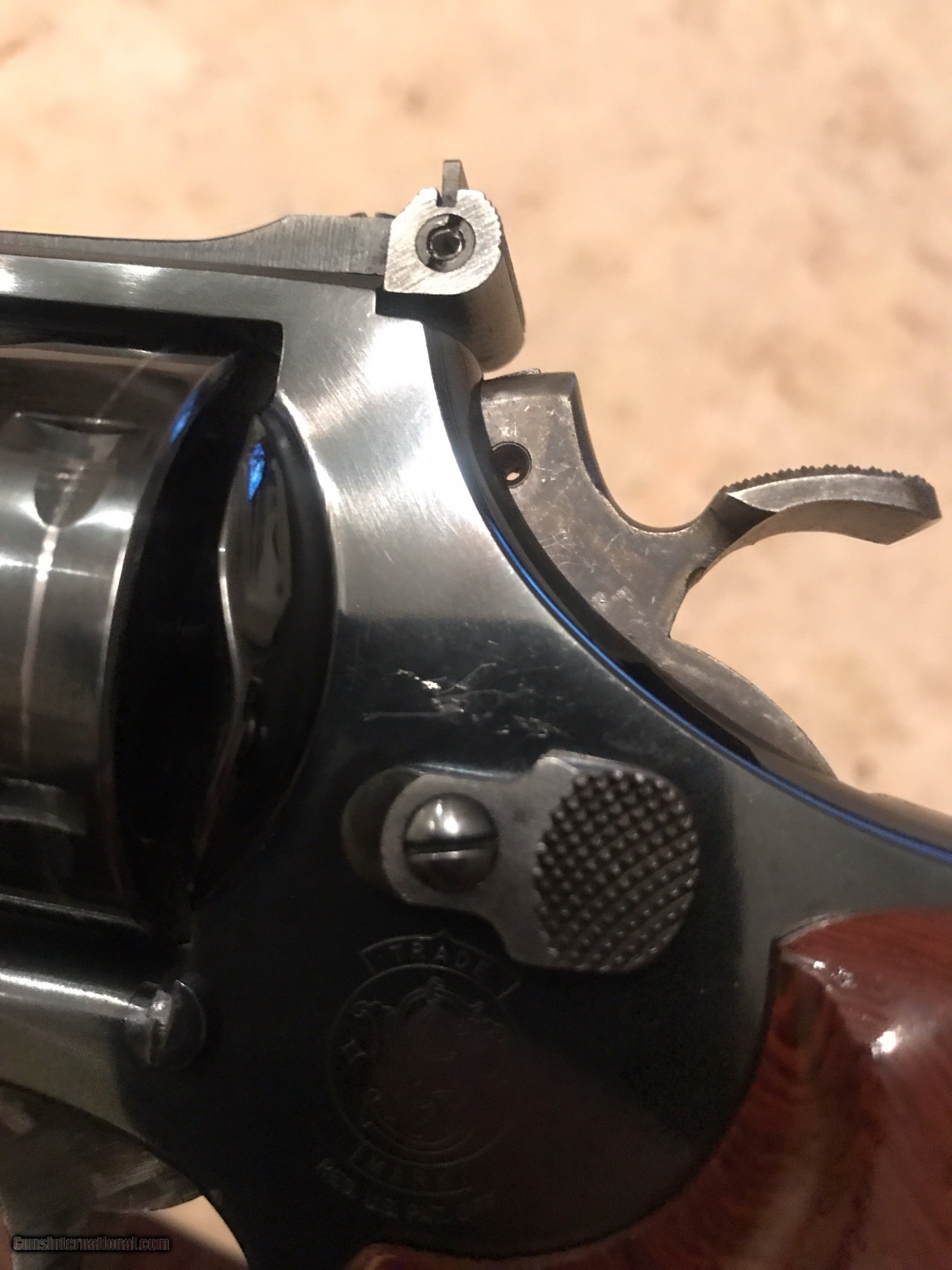 Description: Another fine 29. This one is an excellent shooter. 4 inch barrel, white outline rear sight, red ramp front sight, wide hammer and wide trigger. Gun has a gorgeous set of aftermarket finger groove grips. Gun shows signs of wear on the barrel and cylinder. Some light scratches on the left side of the frame behind the cylinder shield (see photos). Nonetheless, a fine piece. NO BOX. Please email with questions. Shipping included SOLD Manufacturer: Smith and Wesson Model: 29-5 Caliber Info: .44 magnum Condition: used Metal Condition: very good Wood Condition: excellent Bore Condition: excellent Action: double Finish: blue Sights: target Item Location: 37075 |