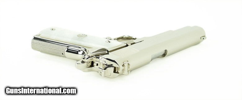 Colt Government .45 ACP caliber pistol. Customized with bright nickel finish and Pearlite grips. New