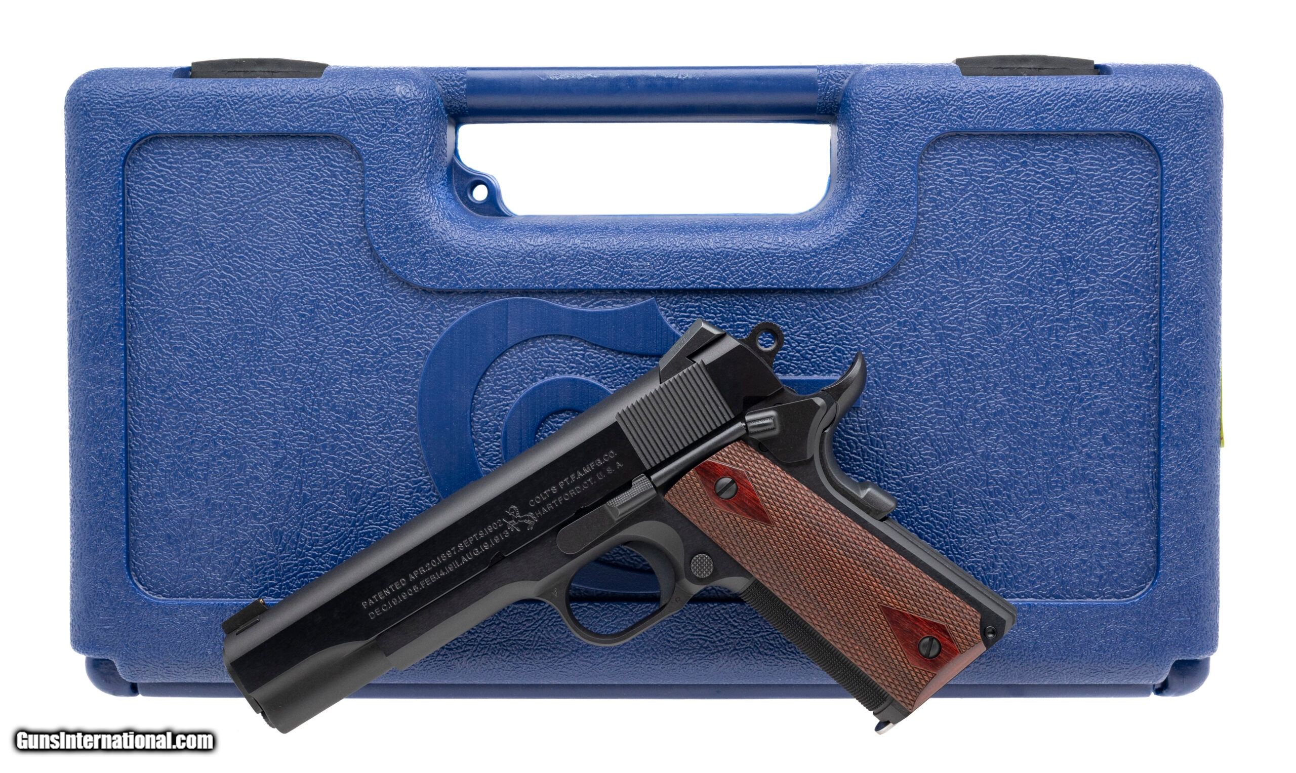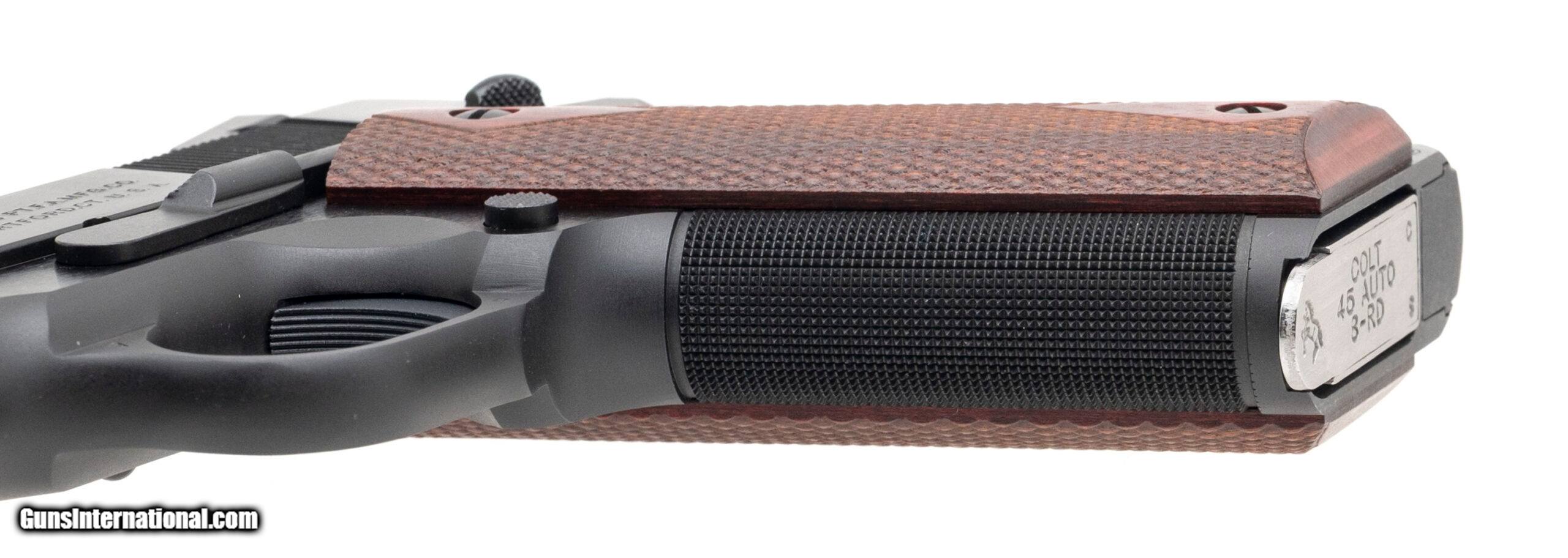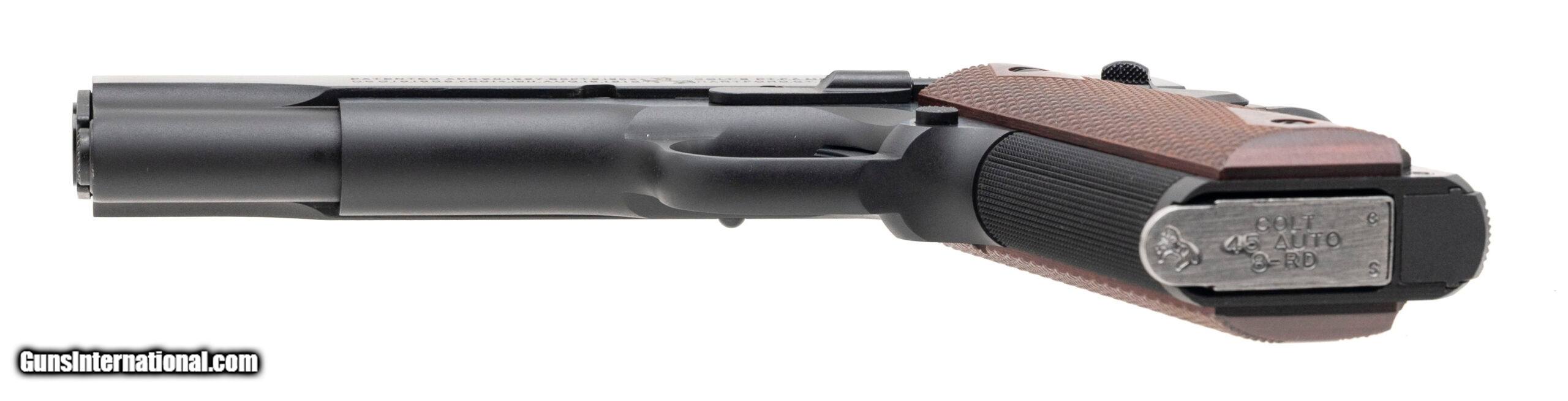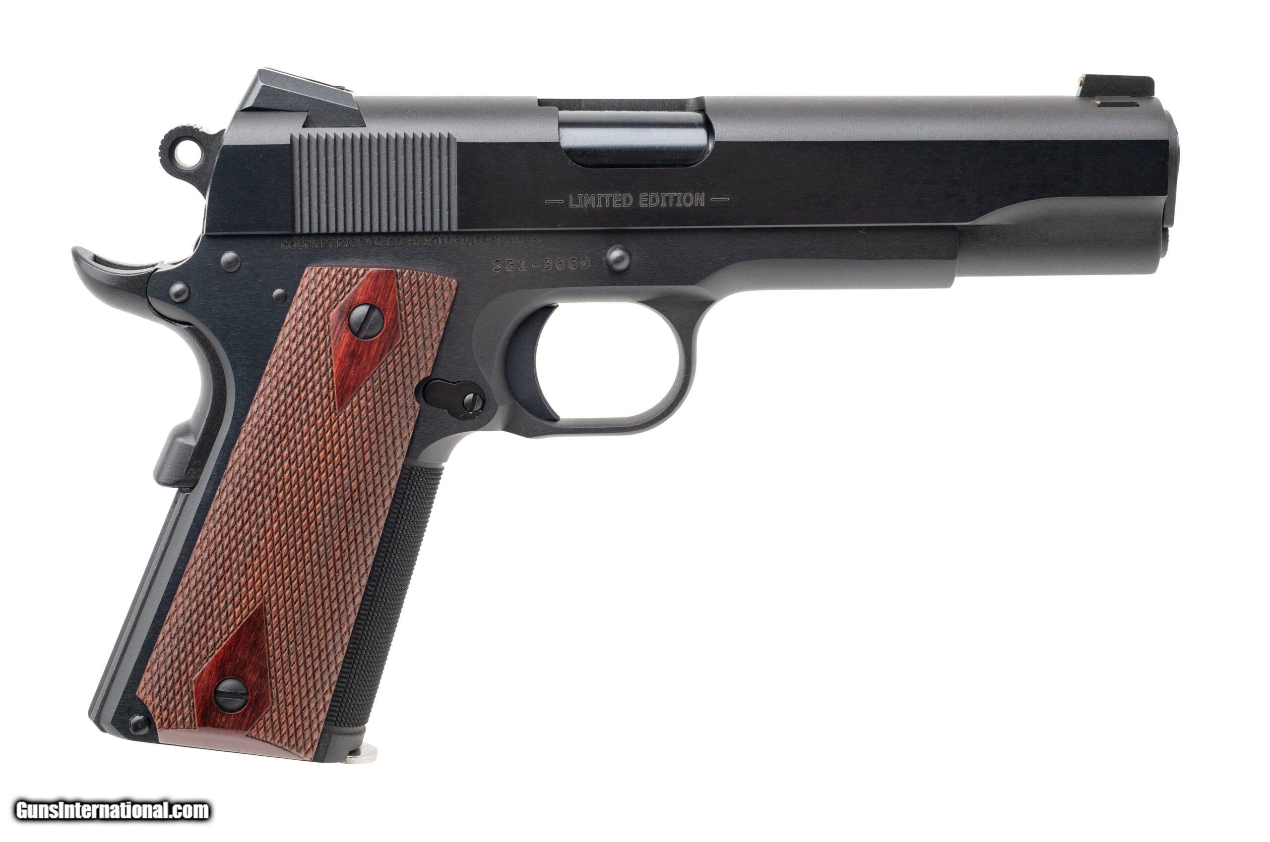Description: "SN: SE1-3669. Modern production semi-auto 1911 pistol in 45 auto with a 5"" barrel, Novak sights with gold front bead, beavertail safety and checkered front strap. Blued finish with diamond checkered walnut grips in excellent condition. Comes with original box and 1 Colt stainless magazine. Price: $1,195.00 Contact Seller |