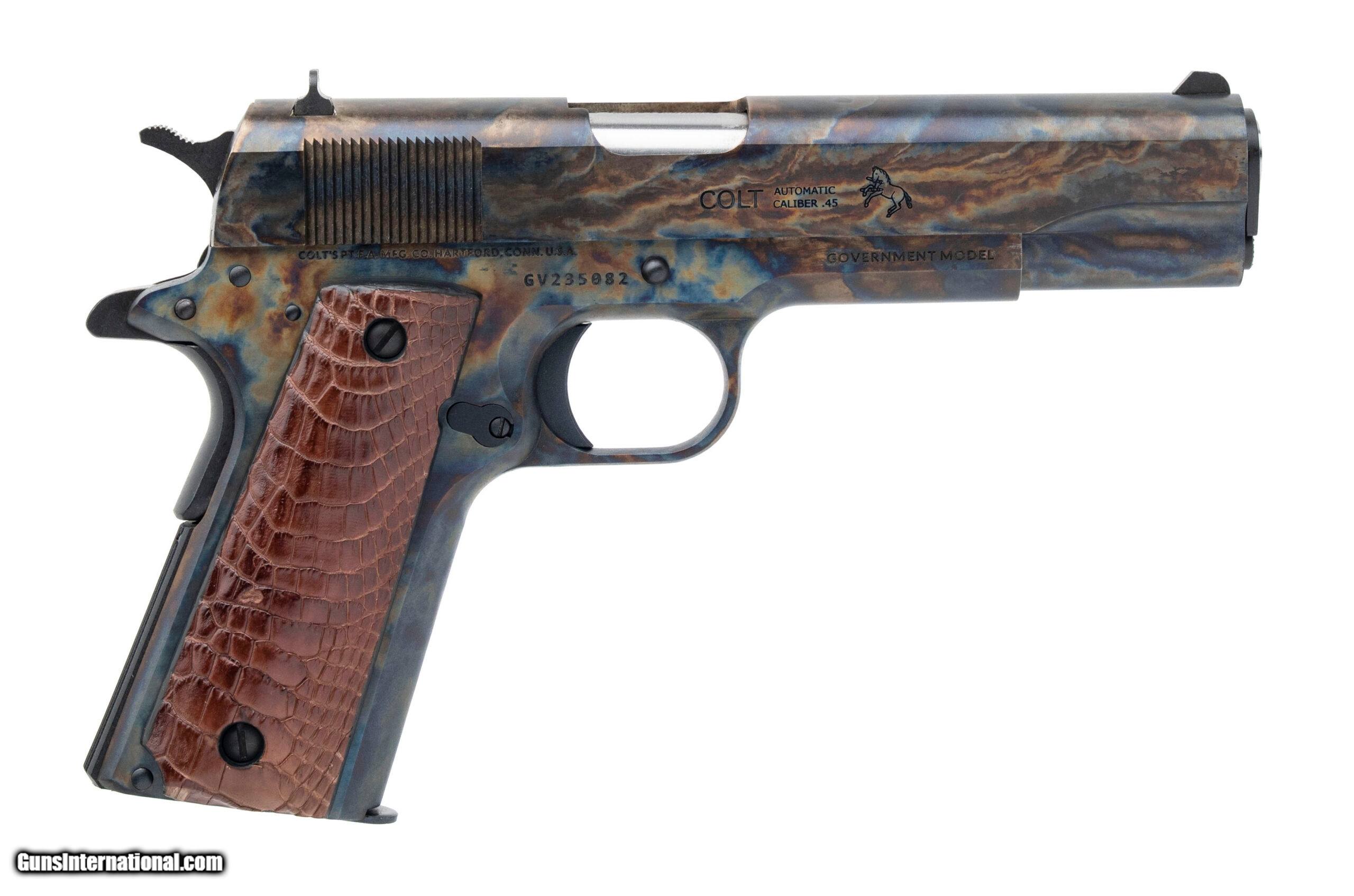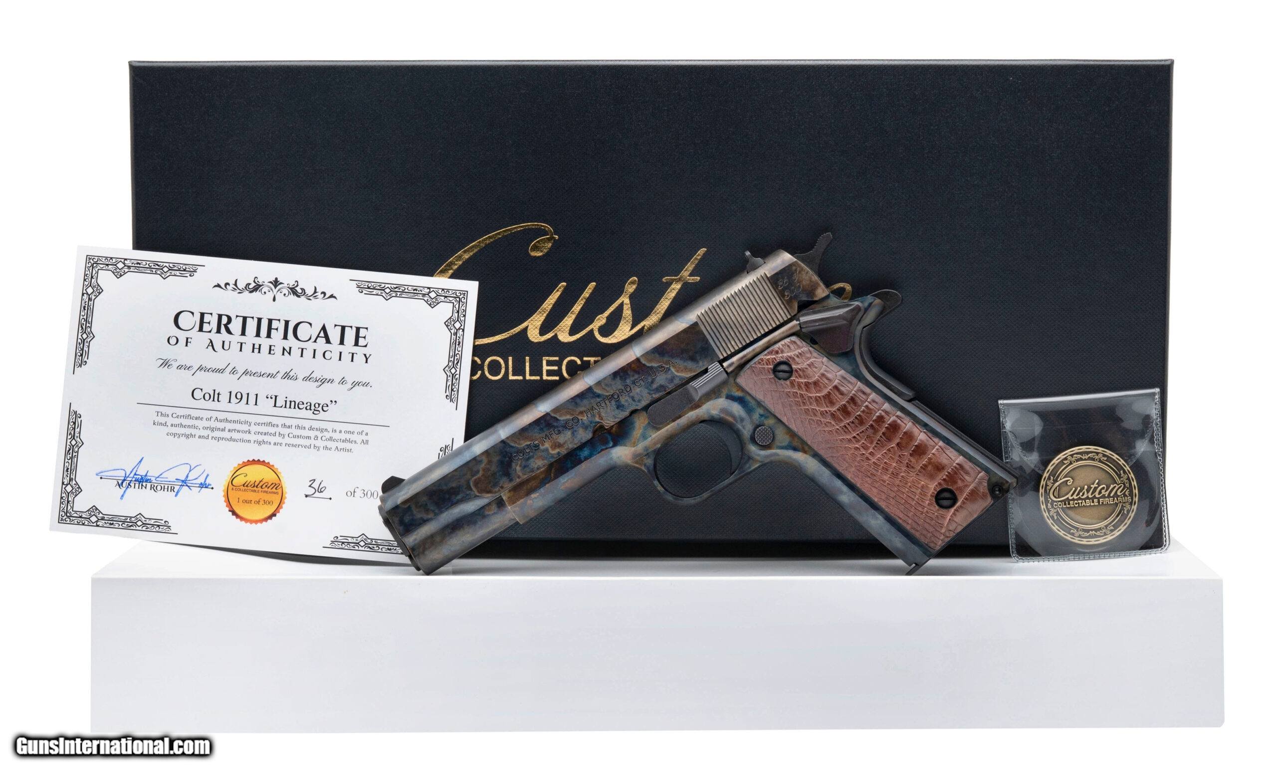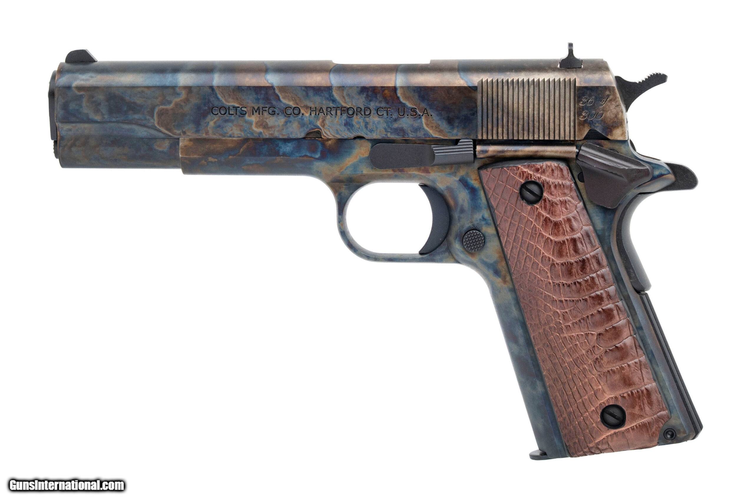 Description: "One of 300 Made Custom 1911 Pistol with a 5"" Barrel. Government Size, Color Case Hardened Metal, Genuine Alligator Grips, and Blacked Out Sights. Includes 1-9rd Magazine and Collectible Coin. NEW. UPC: 199284487017 Price: $2,299.95 Contact Seller |