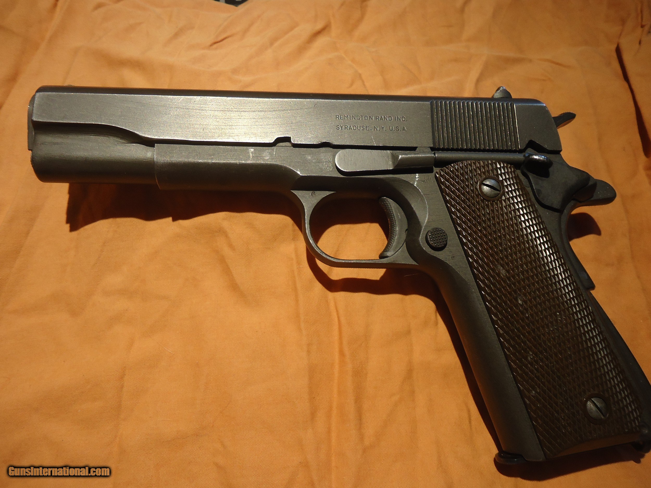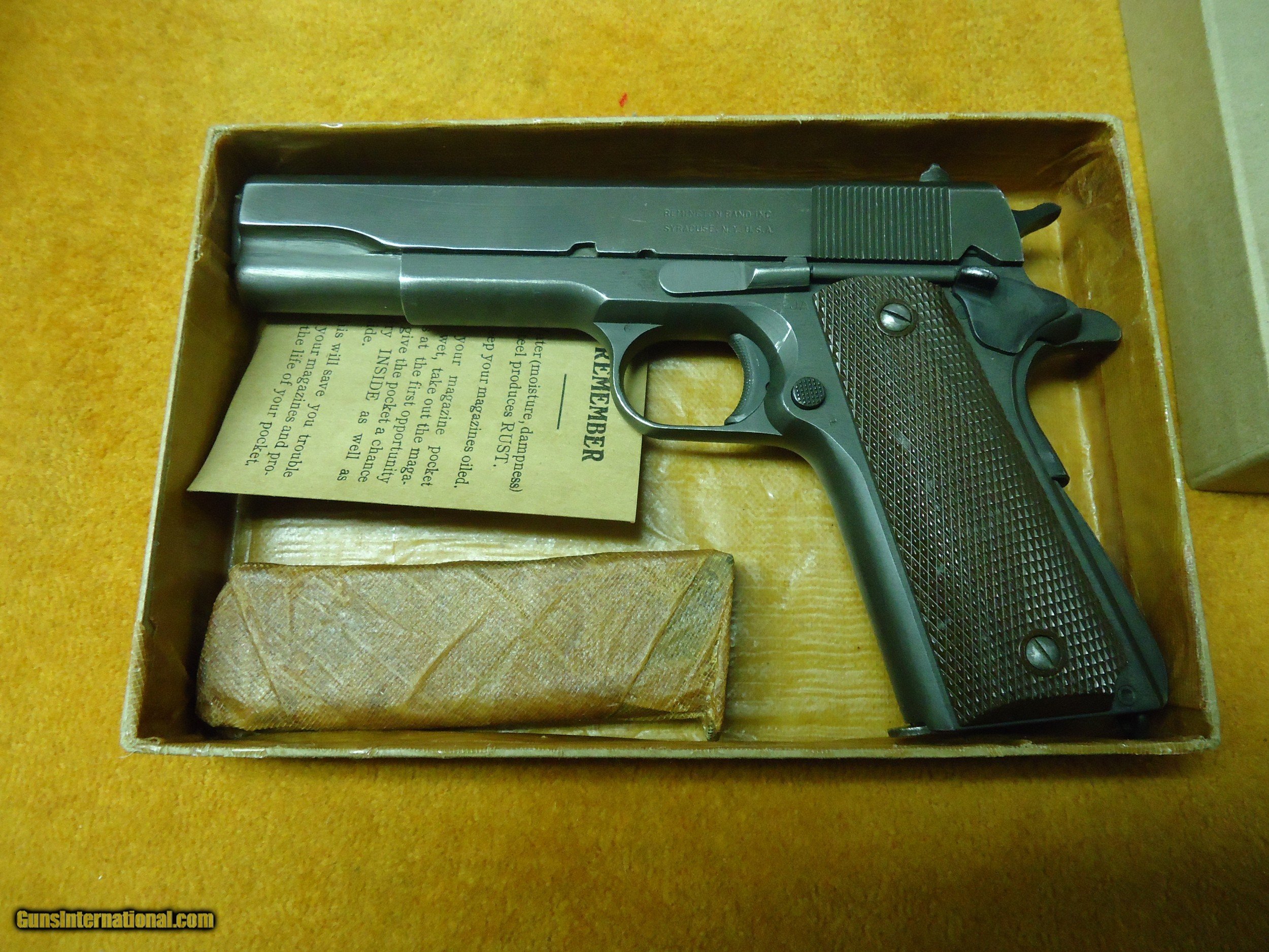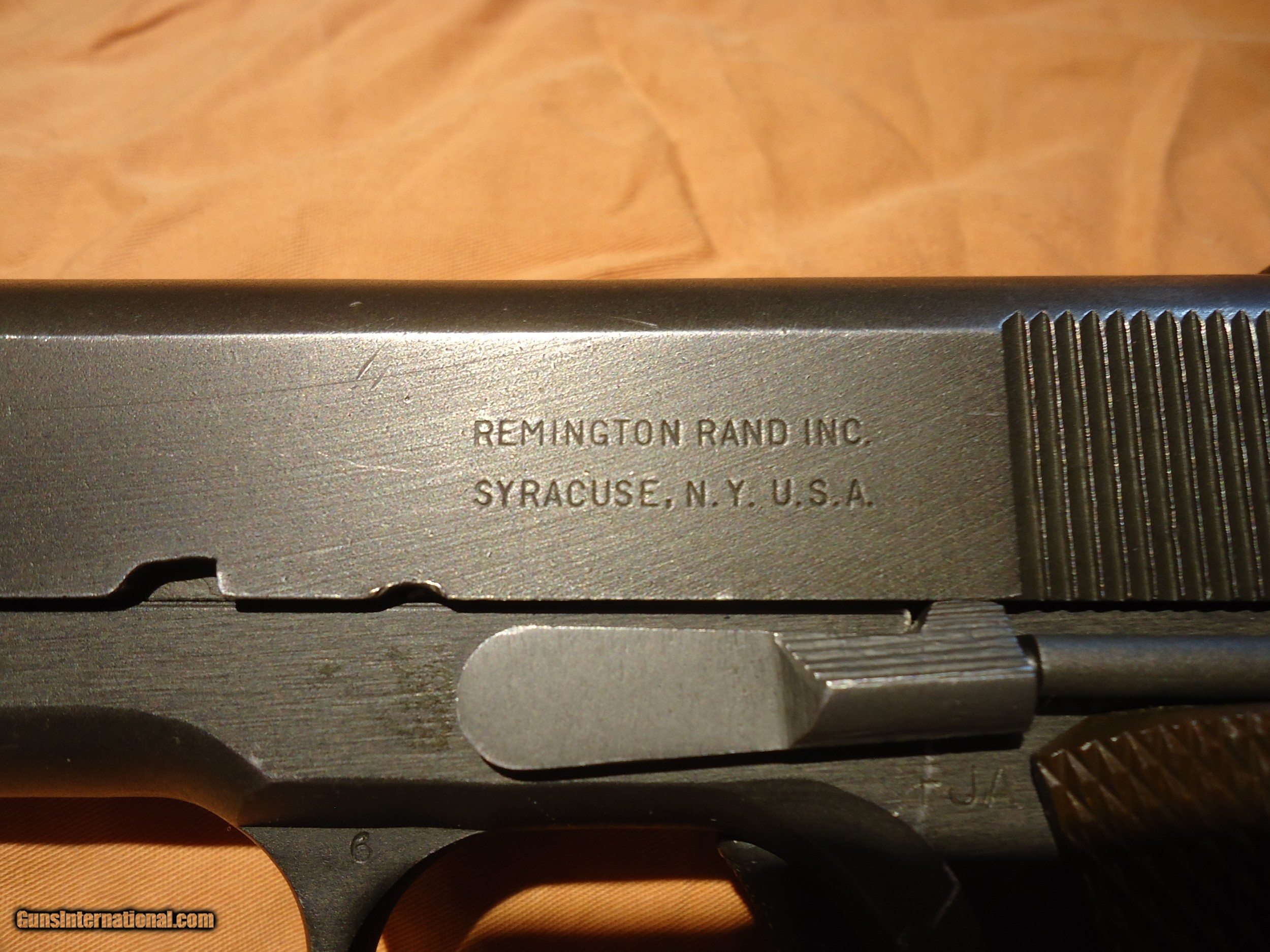Description: 1911 A1 Reminton Rand US Army with assecories.. This is definitely a collector gun. All correct. Made in 1945. Parkerizing is beautiful correct magazine. Comes with correct period holster and belt with magazine pouch with 2 unmarked WWII magazines, Kraft paper box with anti rust paper linner and magazine in original wrapping, also includes cleaning rod.. Send a check or money order to: RJC Ltd 114 West 12th Pueblo, CO 81003 Be sure to include an FFL for where you want it shipped We can take a credits card but the company nicks us 5% so we pass that on to you. That would add $124.75. If you want to use a card call the store at (719) 545-9704. Our hours are 10 to 5 Wednesday, Thursday and Friday. SOLD Curio/Relic: Yes Manufacturer: Remington Rand Model: 1911 Serial Number: 2136524 Caliber Info: 45 acp Bore: Near New Condition: 95% Metal Condition: very good |