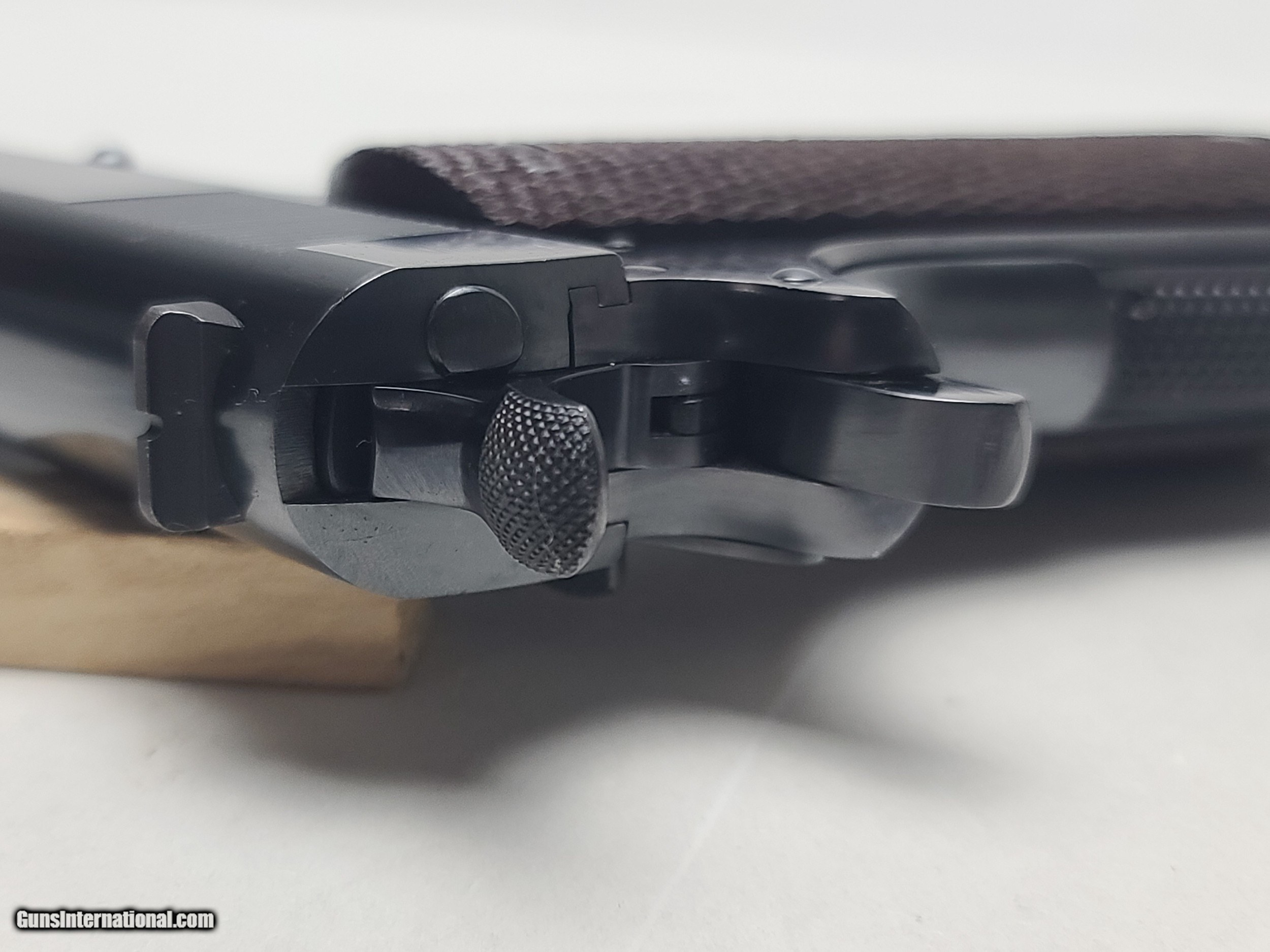Description: Available for your consideration here is a very desirable Colt 45 auto commercial 1911, hard to come by in this good correct original condition. A great deal of time and effort went into the finish on 1911 pistols of this era as sales were slow during the depression. This particular firearm is well preserved for 86 years with nice clean straight lines and prominent sharp edges, very nice refined roll mark depth and definition, and not really a re-assembly mark under the slide lock.. as pictured. The serial number is stamped into end of slide under firing pin stop, and the correct original barrel is in excellent condition with strong lands and groves, and colt 45 auto stamped. There is NO purple haze in the bluing, virtually no muzzle wear, no significant marks or wear on slide top or frame bottom.. there are some tiny black spots around the grip area, the grip straps are in excellent condition with little wear otherwise, and the grips are correct original full checkered walnut in excellent condition with No damage. Magazine is correct 2 tone 7 round. Please see pictures for best description of condition and please ask questions. Fedex 2-day ship is 45.00 to anywhere in the USA, insured. Transfer is FFL to FFL only, C & R is OK on this item, Please let me know if you have any questions or concerns. SOLD Handgun Caliber: .45 ACP (.45 Auto) Manufacturer: Colt Model: 1911 Barrel Length: 5 Condition: 97+ |