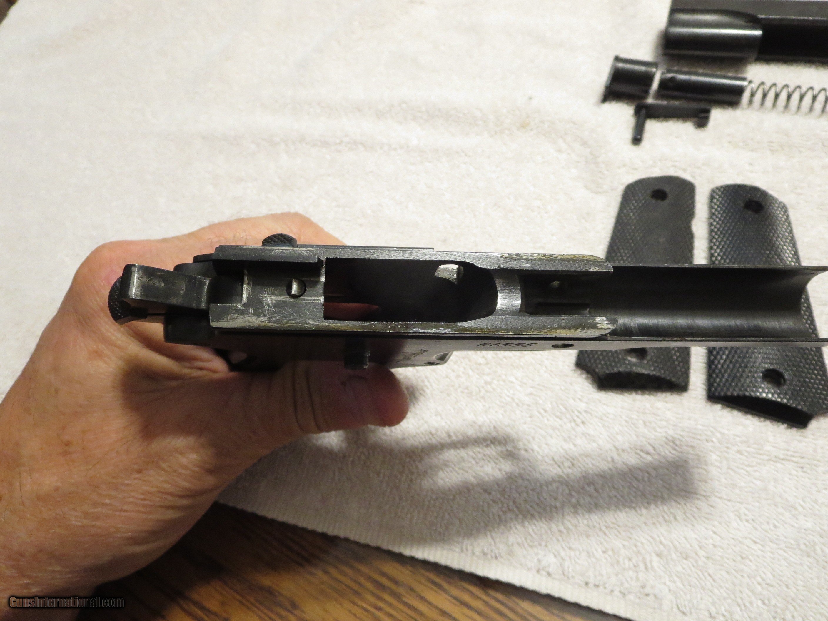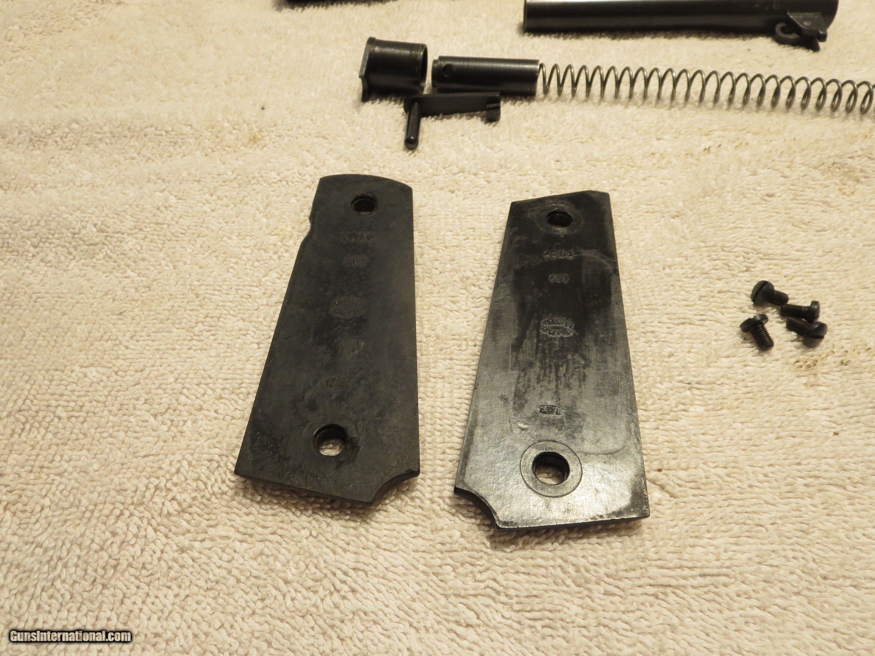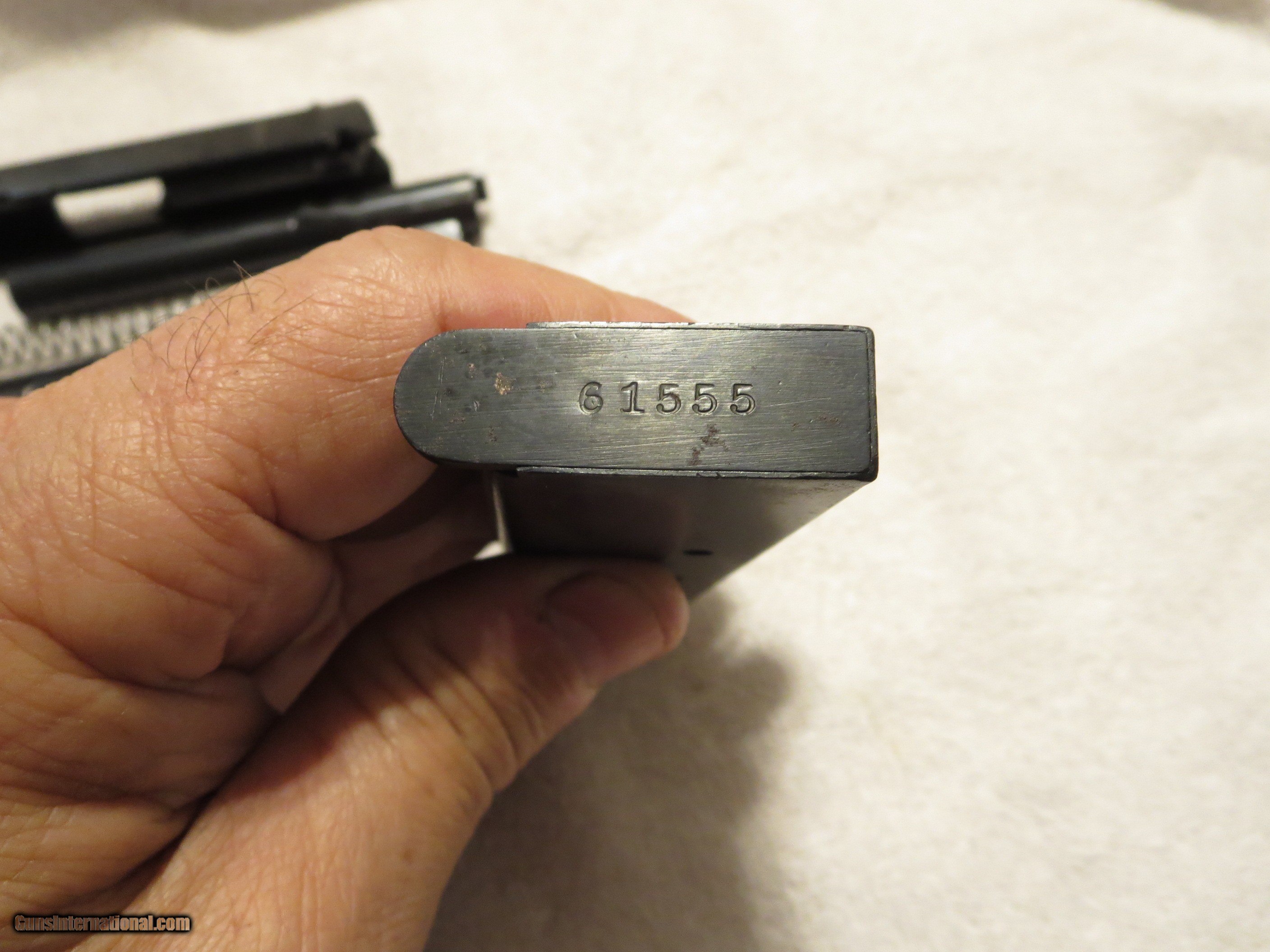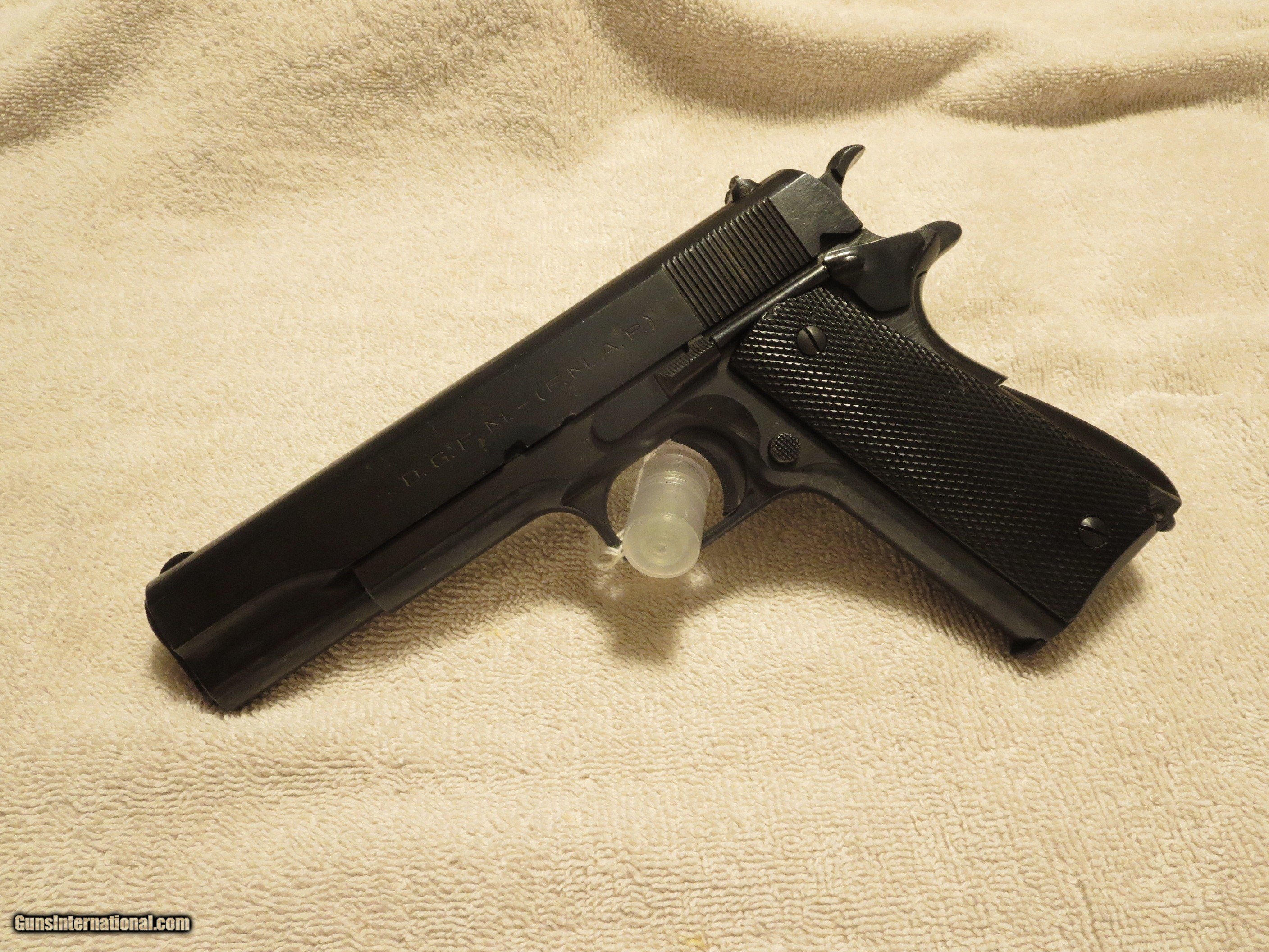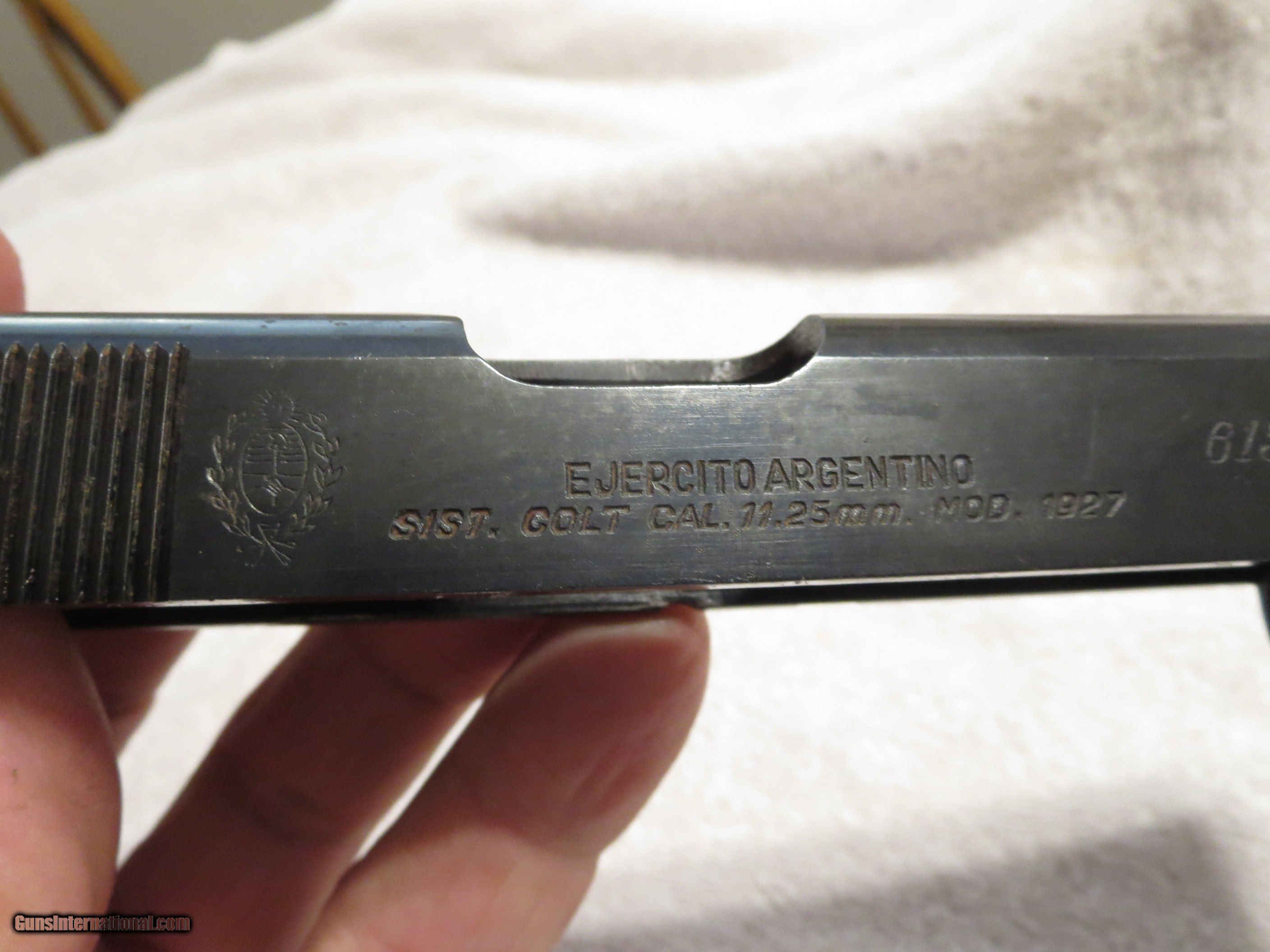Description: For Sale: 1950 Argentina Sistema Mod 1927 1911 pistol in 45 ACP. These pistols are of the utmost quality per a manufacturing contract with Colt. Do a Google search and read many hours of history of these pistols. This one has the original finish in excellent condition except some micro-pitting where grip panels fit to the frame. All stampings are in pristine condition. This is an Army model. Slide, frame and barrel have matching serial numbers including the magazine. Barrel bore is bright/shiny with sharp rifling. Wears original solid black rubber grips. Simple and honest layaway plans available. More photos can be emailed. Make an offer. SOLD Manufacturer: D.G.F.M.-(F.M.A.P.) Model: Model 1927 Serial Number: 61555 Condition: Very Good Metal Condition: Very Good Bore Condition: Very Good |