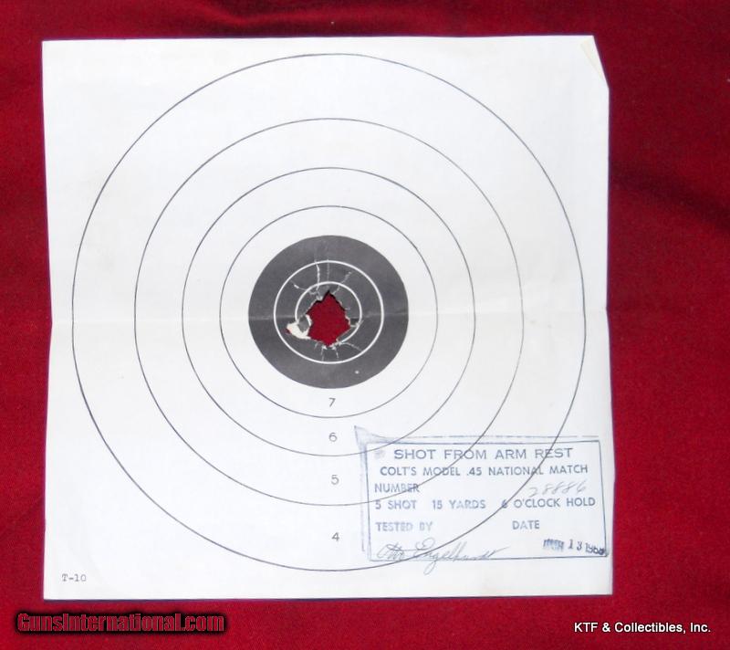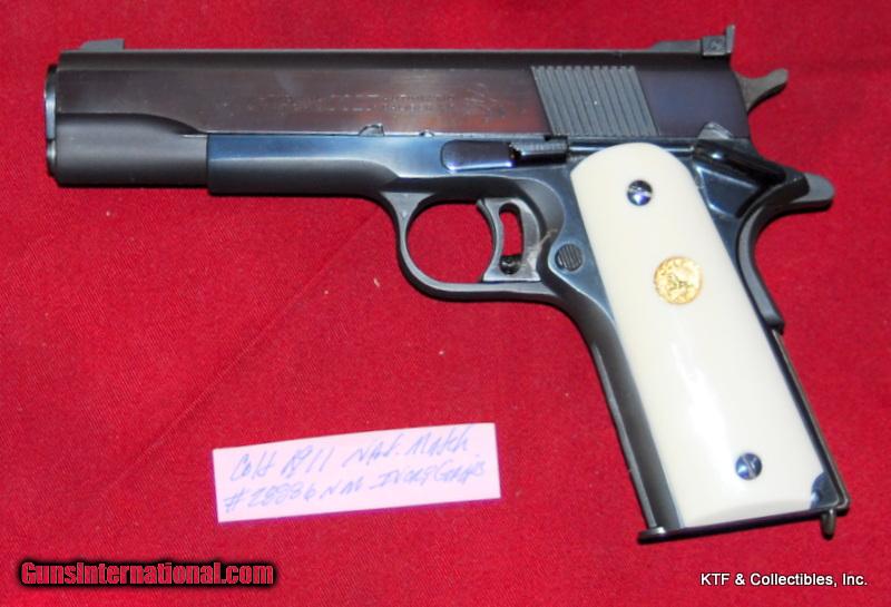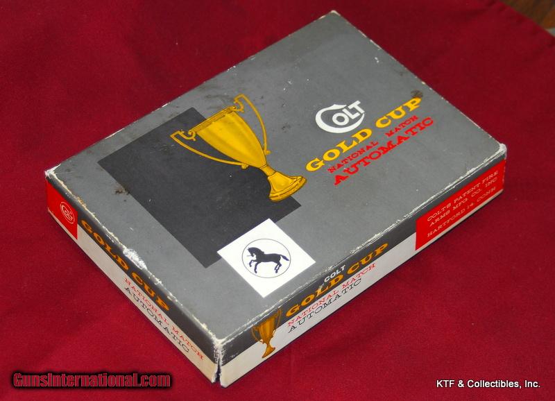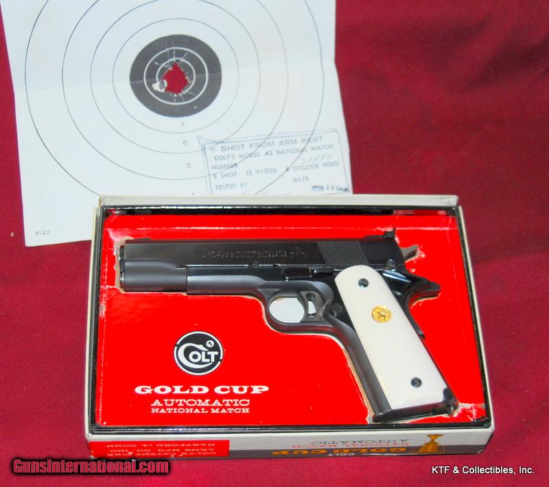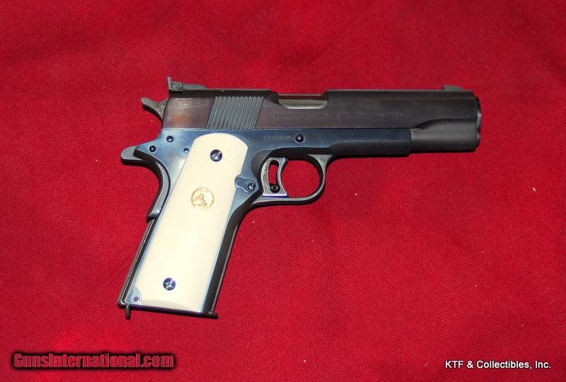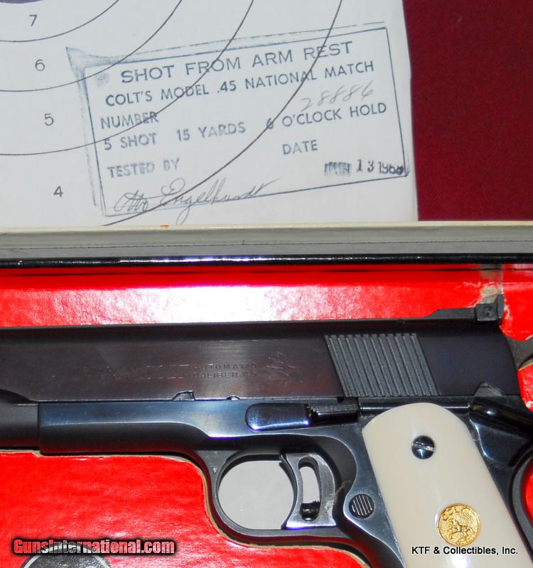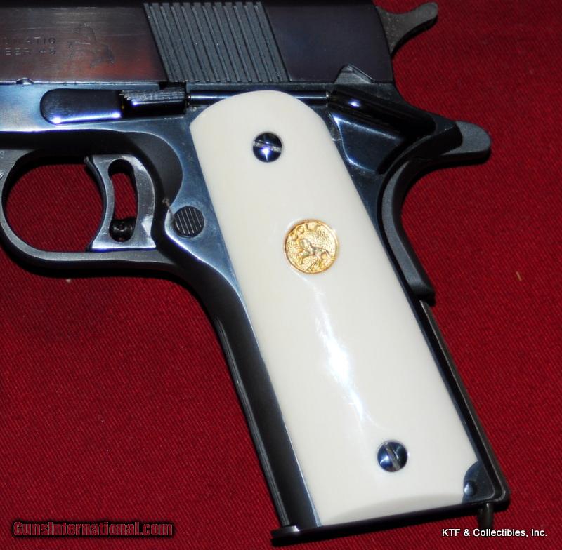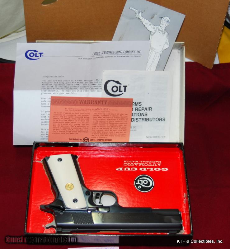 Description: Offered is a shiny new Colt Gold Cup National Match .45 AC, new in the original box with all the papers including the factory test target showing five bull's eye. The finish is brilliant blue with elephant ivory grips (real ivory). The gun is unfired and new in the box since 1968 when it was tested by Colt. This gun is a remarkable 100%. The original box shows some wear but is still beautiful. This is a very hard to find item in new condition. We will ship the gun to the lower 48, except California, for $60 fully insured. If you have questions please call Perry Tong at KTF & Collectibles, Inc. We offer a five day inspection period on the conditions that the gun is not fired and you pay freigth and insurance both ways. At this price we reserve the right to sell at our gun store if s do not come forward. SOLD Manufacturer: Colt Model: Gold Cup National Match 1911 Caliber Info: .45 AC Condition: New In Box Metal Condition: perfect Manufacture Date: 1964 -1968 Item Location: Fort Worth, Texas |