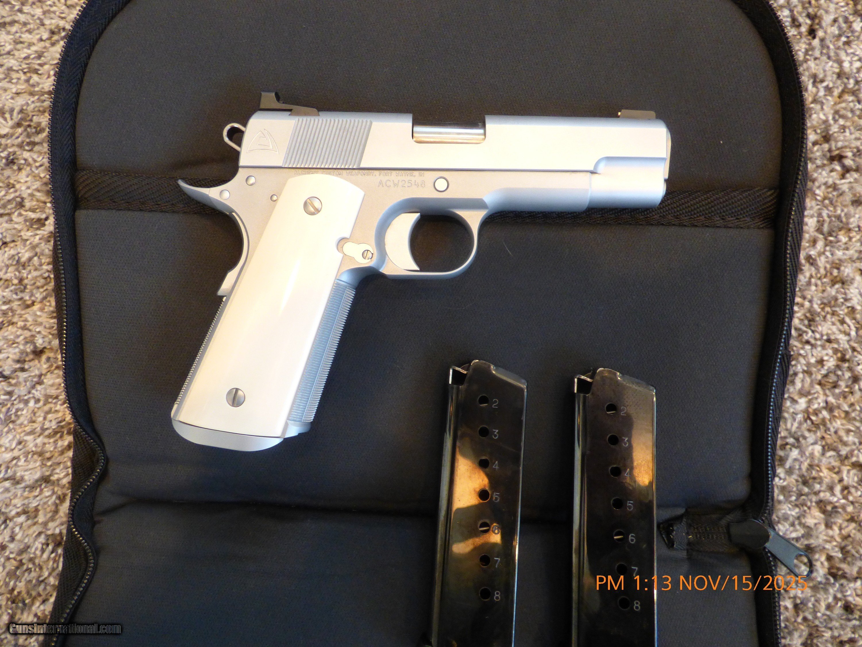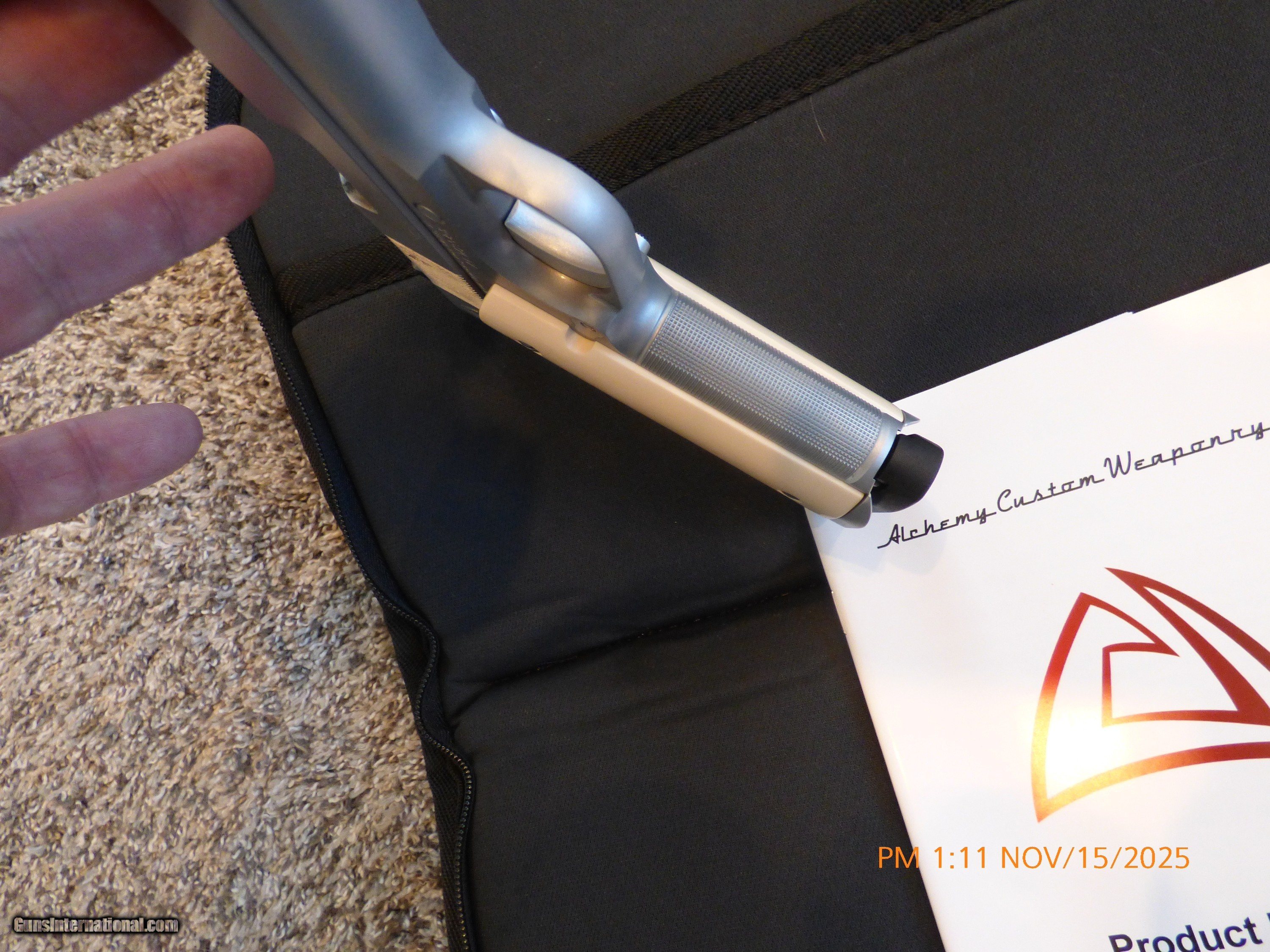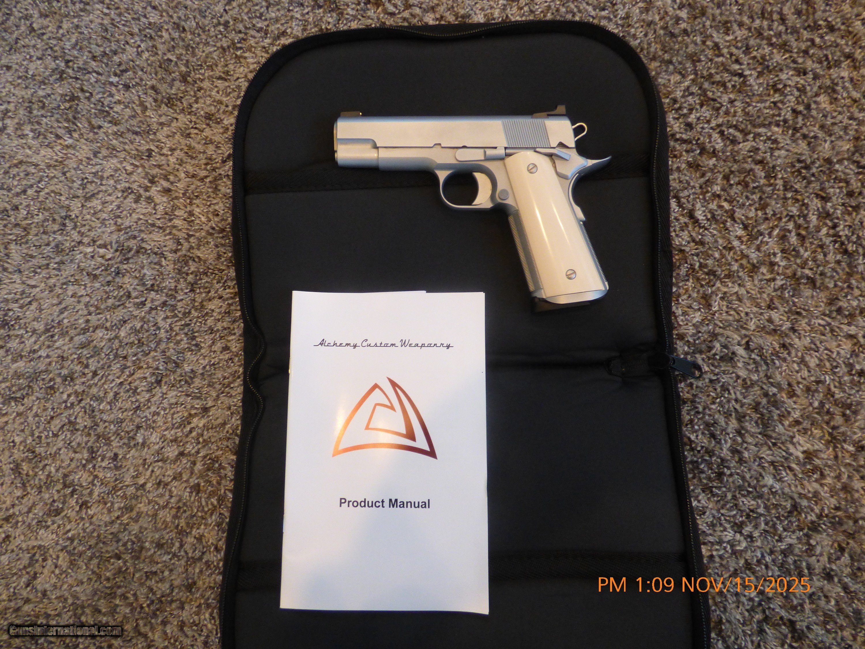 Prime Elite Carry 45 acp with upgrades. ACW full chrome matte finish. Frame slide and small parts. $495 upgrade. Remove Alchemy Custom Weaponry markings from slide $100 upgrade. ACW ball cuts $125 upgrade. As beautiful as it is accurate. You cannot buy an ACW in hard chrome anymore. That finish is discontinued. Ordered this in February of 2024. Less than 100 rounds fired. I have all the paperwork from the purchase also. Comes with carry case, wrench, lock and two mags. Gold bead front sight. Commander style hammer. Checkering, fit and finish are superb. 1 extra set of wood grips will be included. Very accurate and reliable. Just a top notch 45 acp thats not even broken in yet.. PIstol is in as new condition. Buyer pays $75 shipping to your FFL. All questions welcome. Check out my other s as Im selling some nice ones.