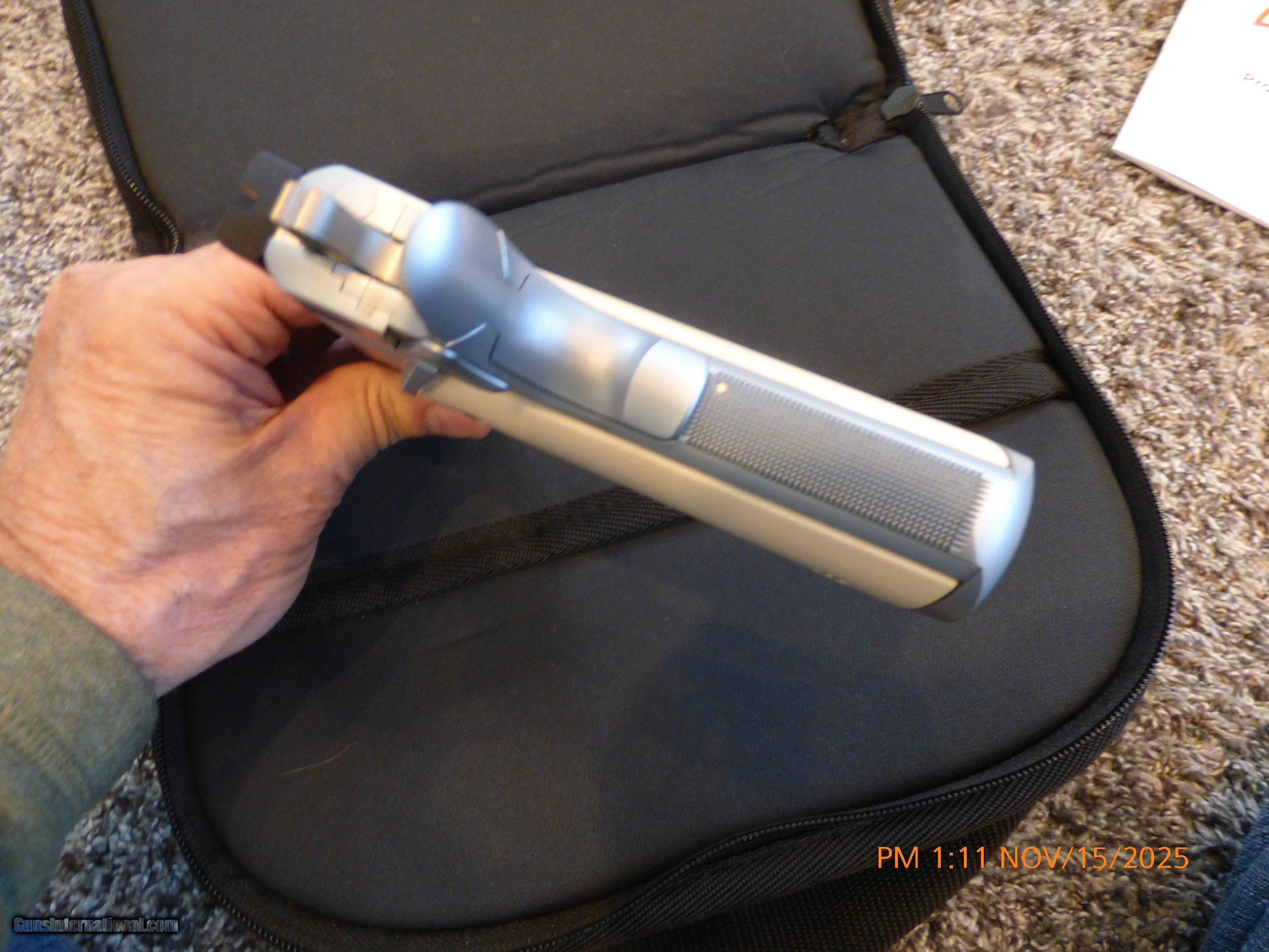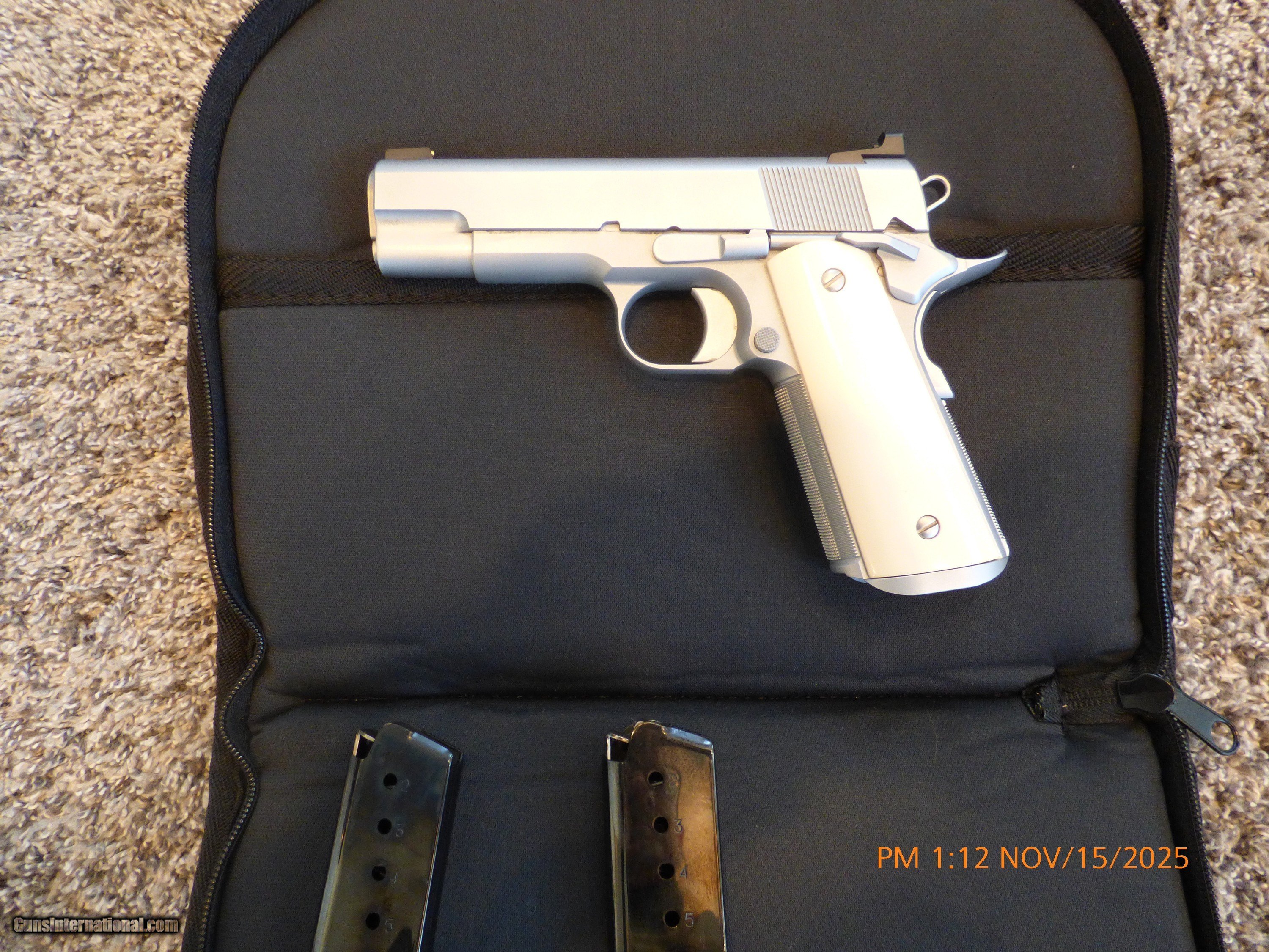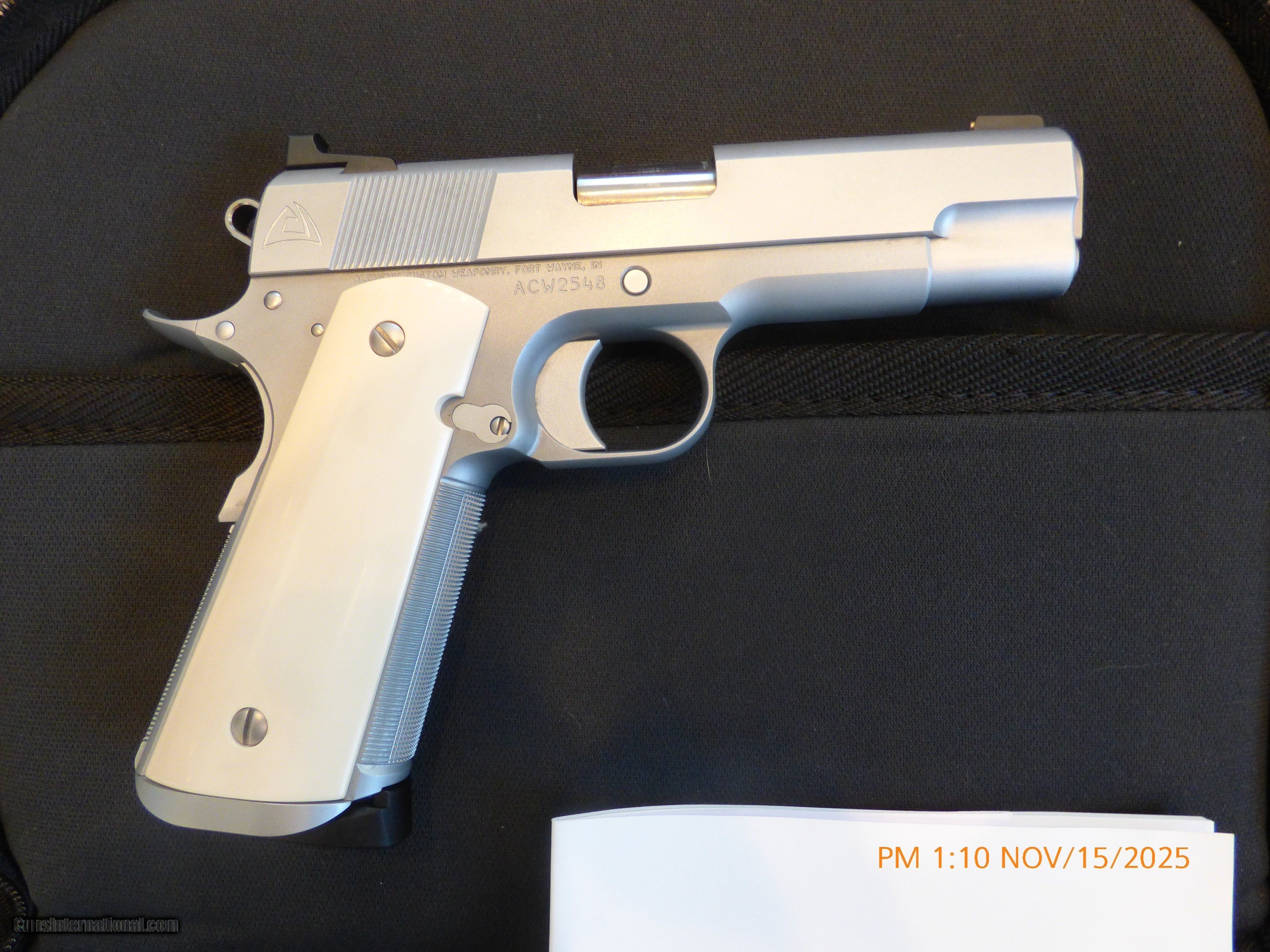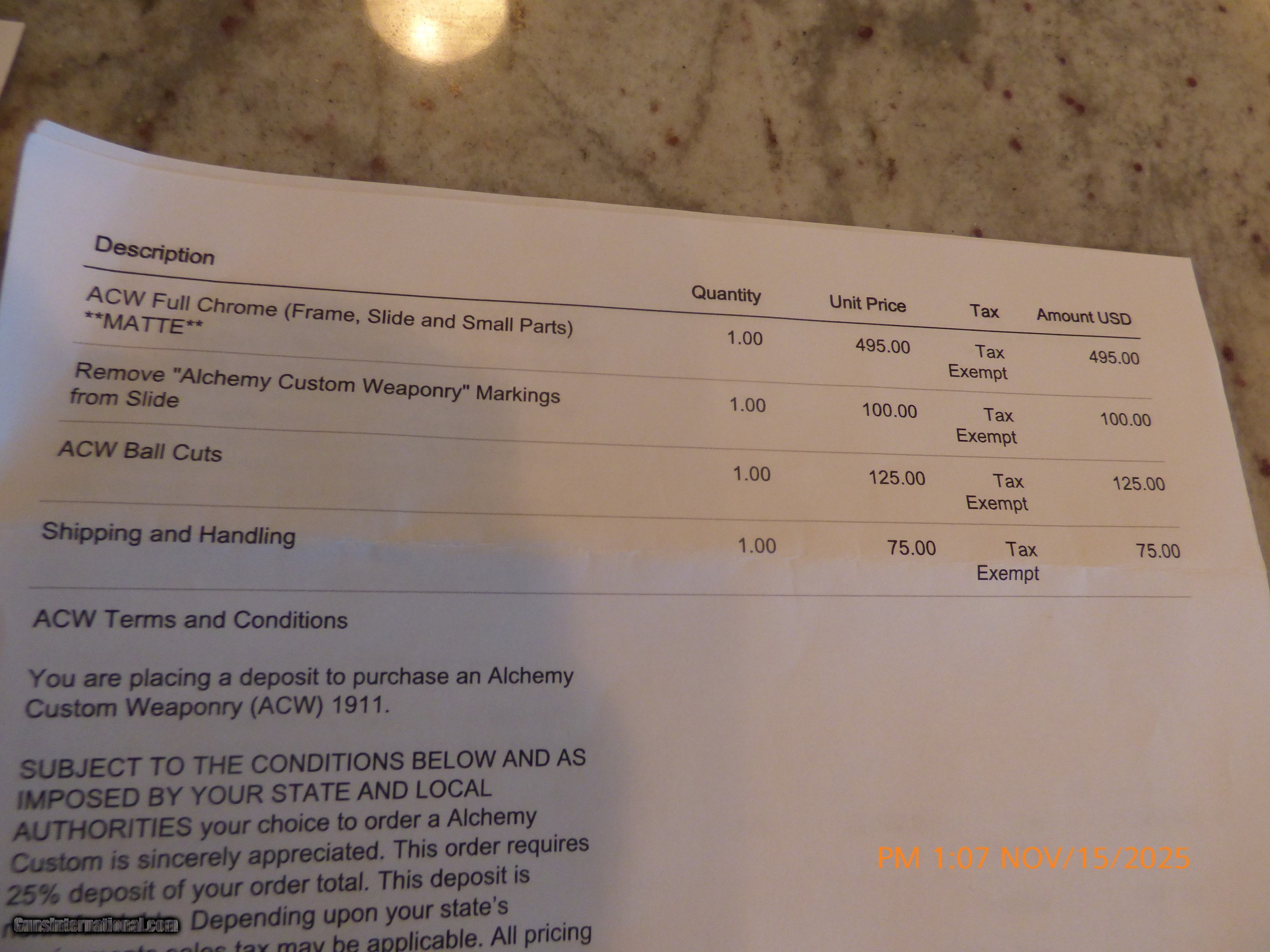 Prime Elite Carry 45 acp with upgrades. ACW full chrome matte finish. Frame slide and small parts. $495 upgrade. Remove Alchemy Custom Weaponry markings from slide $100 upgrade. ACW ball cuts $125 upgrade. As beautiful as it is accurate. You cannot buy an ACW in hard chrome anymore. That finish is discontinued. Ordered this in February of 2024. Less than 100 rounds fired. I have all the paperwork from the purchase also. Comes with carry case, wrench, lock and two mags. Gold bead front sight. Commander style hammer. Checkering, fit and finish are superb. 1 extra set of wood grips will be included. Very accurate and reliable. Just a top notch 45 acp thats not even broken in yet.. PIstol is in as new condition. Buyer pays $75 shipping to your FFL. All questions welcome. Check out my other s as Im selling some nice ones.