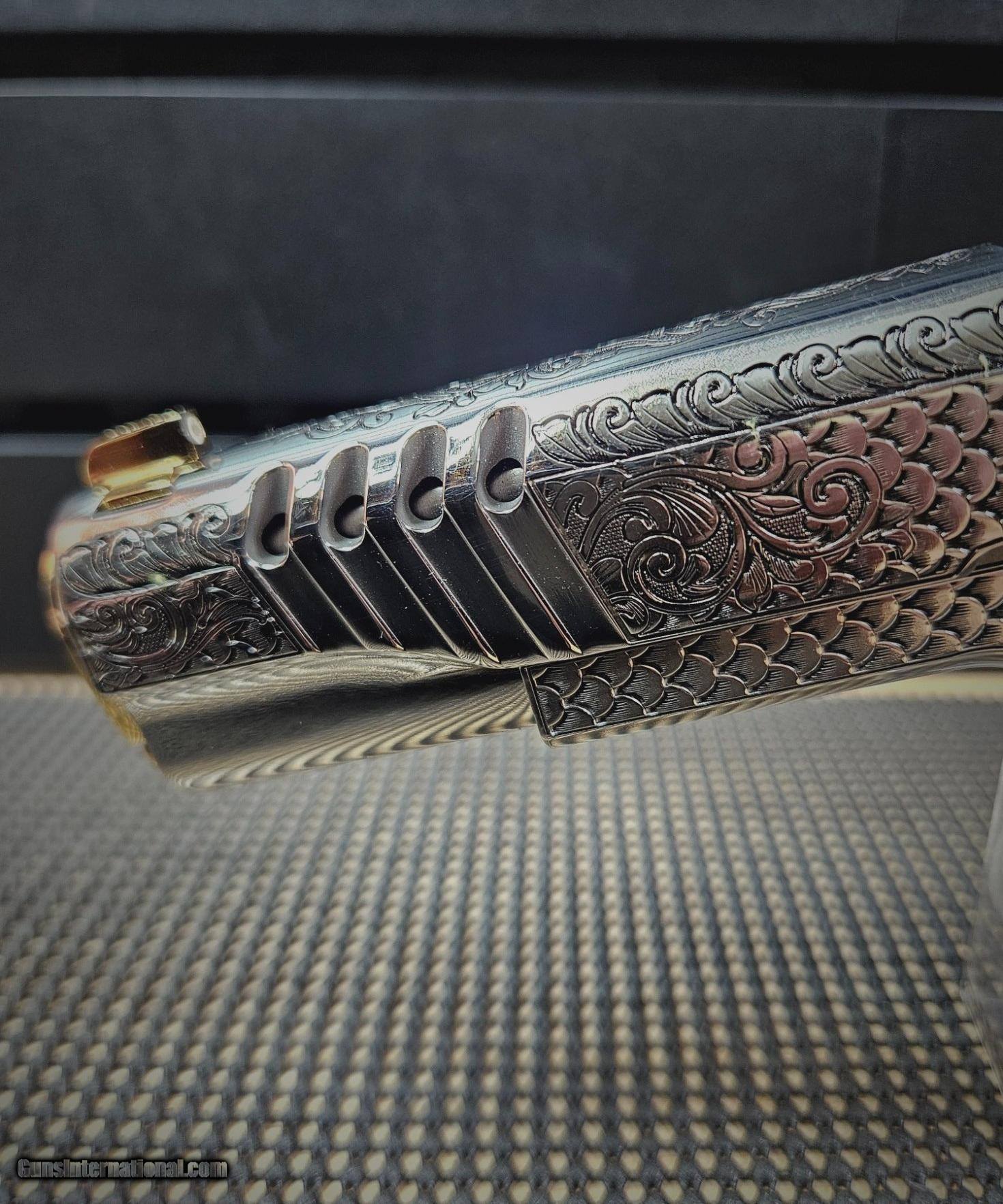 Description: This Auto Ordinance is an amazing piece from Seattle Engraving. Fish Scale and Scroll Engraved, set on a beautiful white chrome frame and slide. Small parts are 24k gold and everything is upgraded. This gun comes complete with extended beaver tail safety, skeletonized slide and hammer, night glow sights and custom grips. Dont miss out on a chance to buy this gun right and below what youd find this exact same gun on Seattle Engravings . Buy now and save. SOLD Handgun Caliber: .45 ACP (.45 Auto) Manufacturer: Auto Ordinance Model: 1911A1 Serial Number: AOB14987 Condition: NIB Metal Condition: Superb Barrel Type: N.M. Sights: Night Glo Manufacture Date: Current Engraving: 75% Extras: Custom Case: Original Item Location: MN |