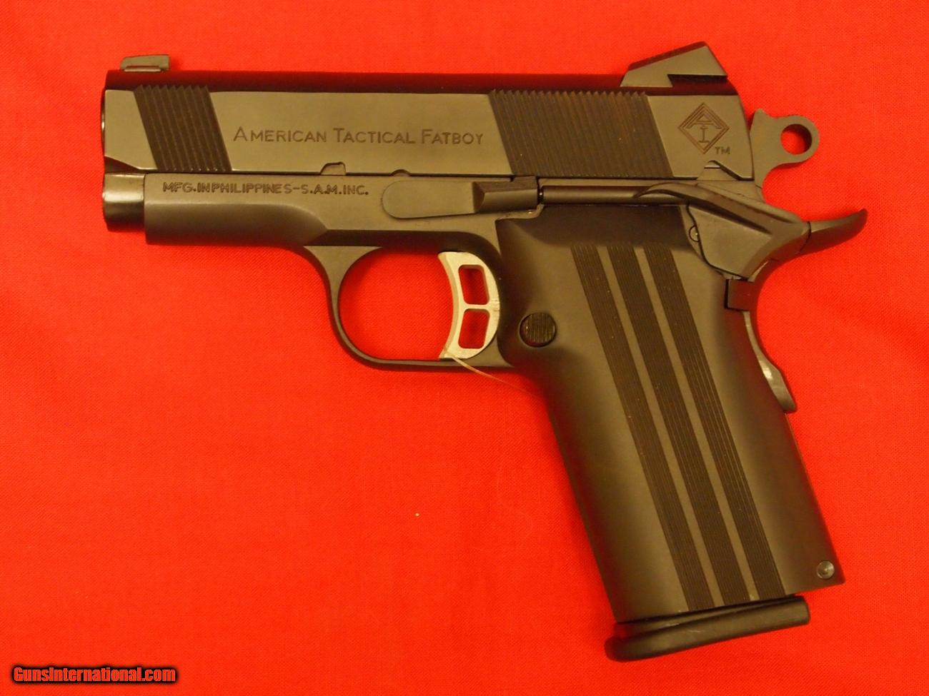 Description: American Tactical 1911 Fatboy .45ACP, 3" barrel, single action, blued finish, 13 round magazine, dovetail front sight with white , adjustable rear sight. New In Box. Reg. 699.00 Add 3% for credit cards $25.00 S&H SOLD |