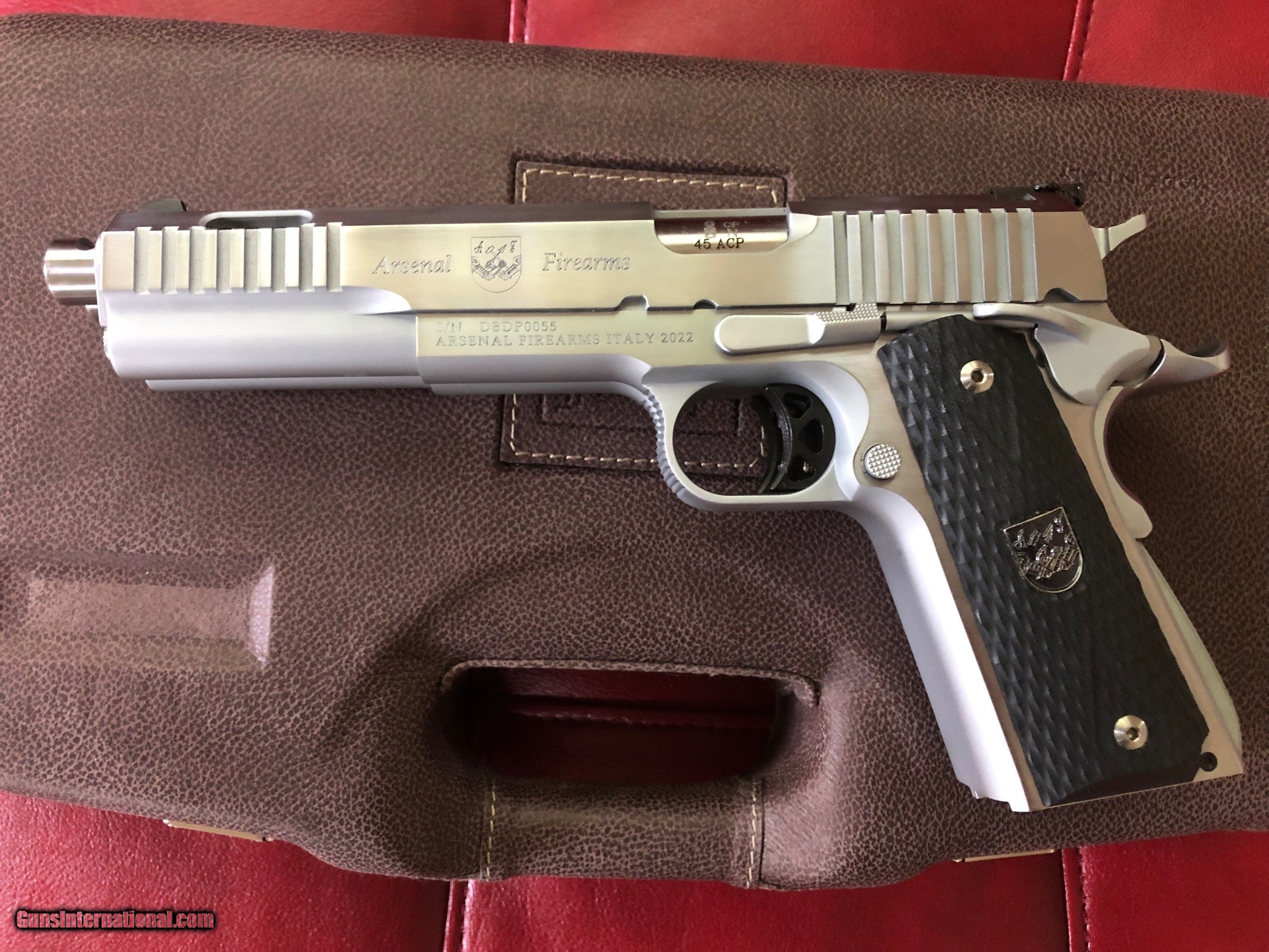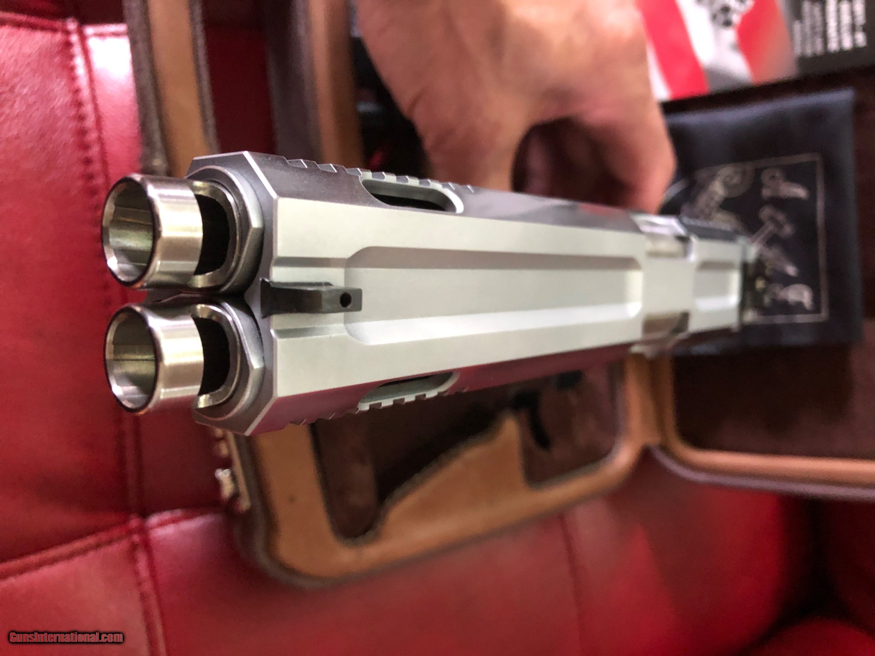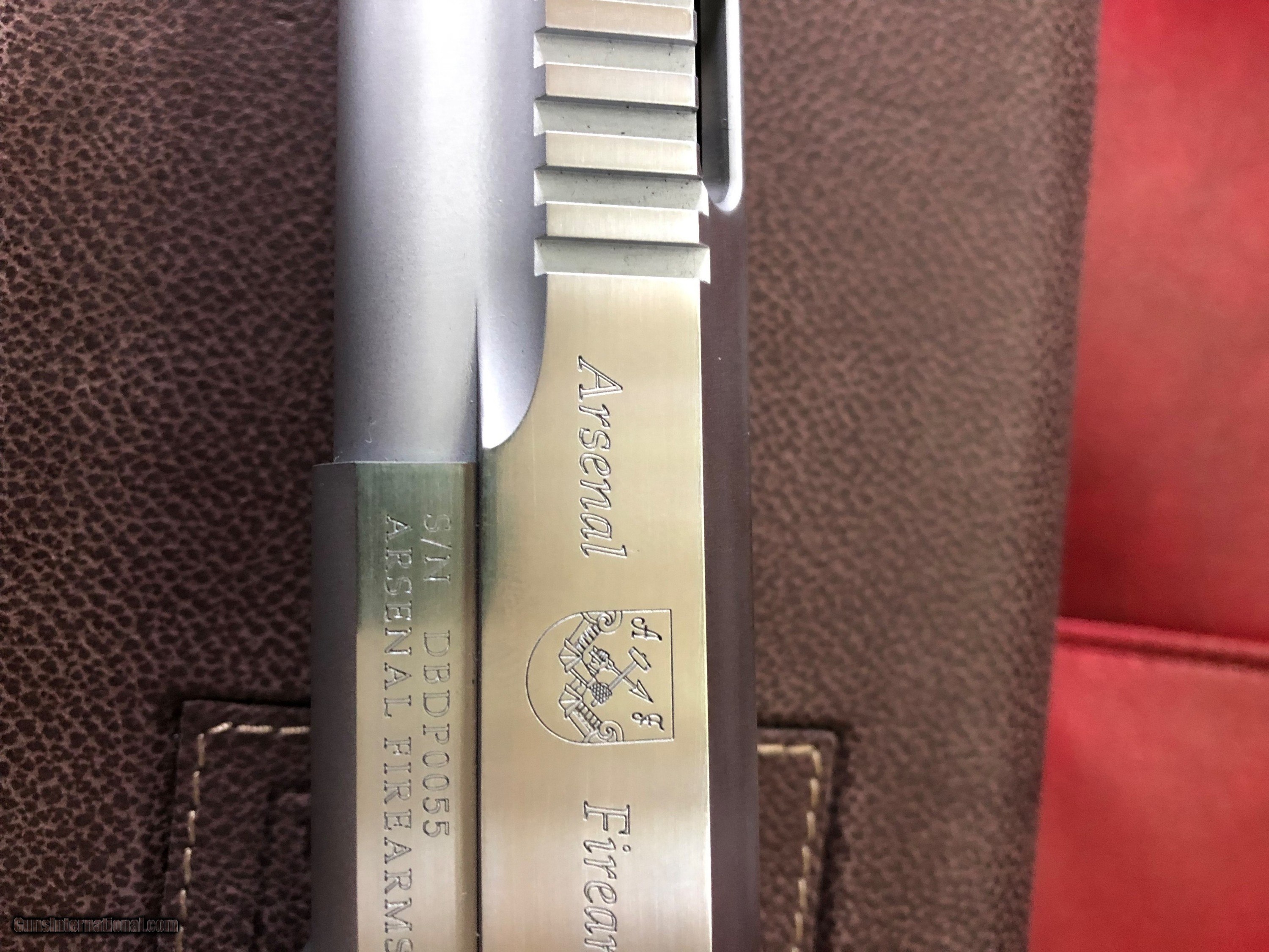 Description: Attention high end pistol collectors here is an opportunity to own and extremely limited and unique pistol. This is Arsenal firearms top of the line double barrel 2011. Dueller Prismatic made in Italy Everything about this pistol screams luxury high end from the quality of build and the brown suede and leather interior to the pig skin leather exterior of the Case which holds this beast. Another nice quality of this pistol is most parts can be swapped out with thiose of a 1911. This pistol has also been featured in the James Bond movie Spectre and Resident Evil. I have seen this pistol sell for 20k multiple times.Shipping is 50.00 with insurance at buyers discretion which will be quoted when buyers destination is known. Among other forms of payment, I will accept discreet PayPal friends and family. Don't miss this opportunity as this pistol will only increase in value as time goes on. A unique extremely rare and well made pistol like Korth, Korriphila,Bren ten, Smith & Wesson , Colt, Sig Sauer,Laugo Arms Alien, Sphinx,1911,Extremely low serial number at 0055 SOLD Manufacturer: Arsenal Firearms Model: Dueller Prismatic Serial Number: 00055 Barrel Length: 5” Bore: New Chambers: 2 Ejectors: 2 Condition: New Metal Condition: New Bore Condition: New Barrels: 2 Barrel Type: Ported Action: SA Triggers: 2 Sights: LPA Case: Leather Item Location: Downingtown PA 19335 |
